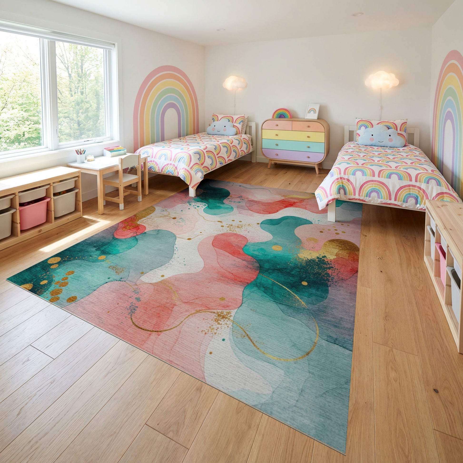 Flatwoven High Traffic Area Rug, Abstract Fluid Teal Pink Gold Rug, Non Slip, Stain Resistant, Washable Area Rugs for Study Room, Playroom, Bedroom Overview: