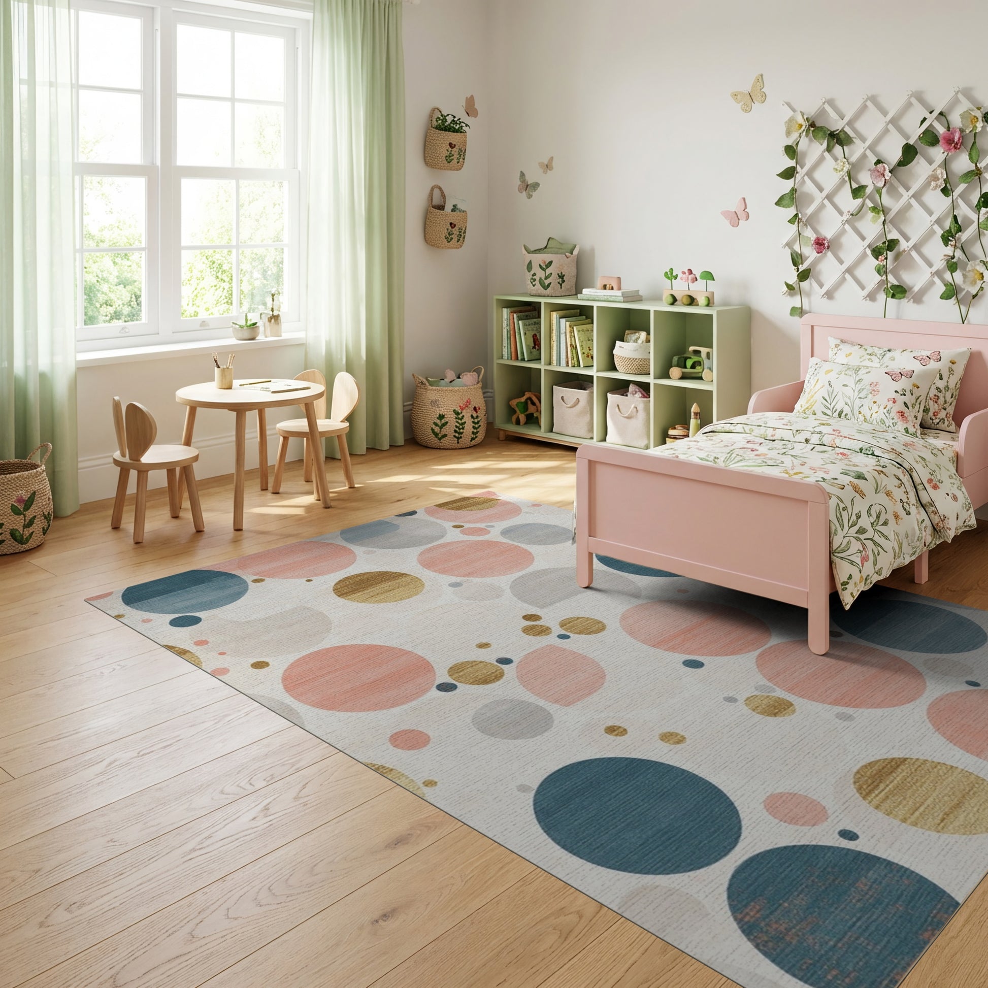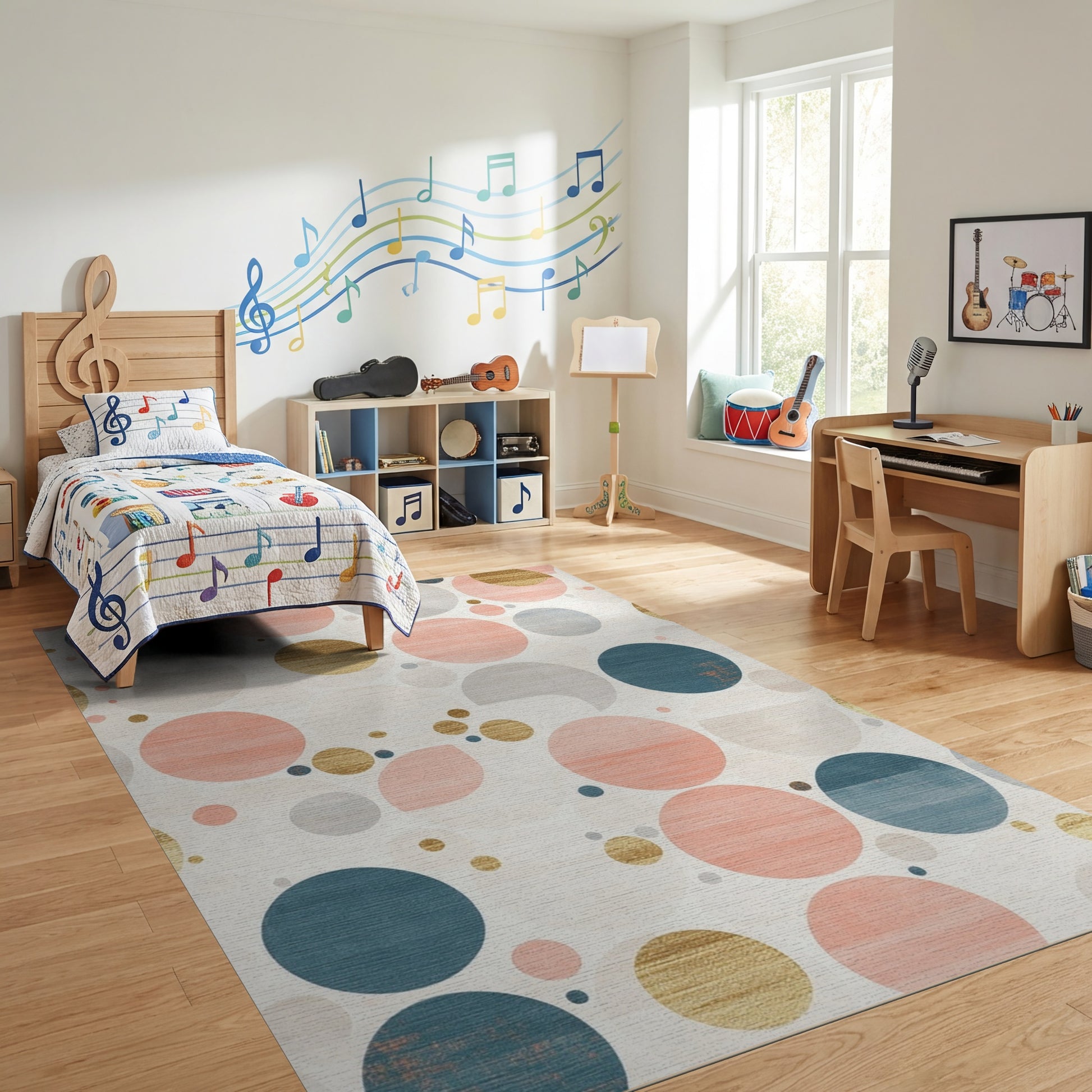 Flatwoven High Traffic Area Rug, Abstract Teal Coral Gold Circles Rug, Non Slip, Stain Resistant, Washable Area Rugs for Study Room, Playroom, Bedroom Overview: