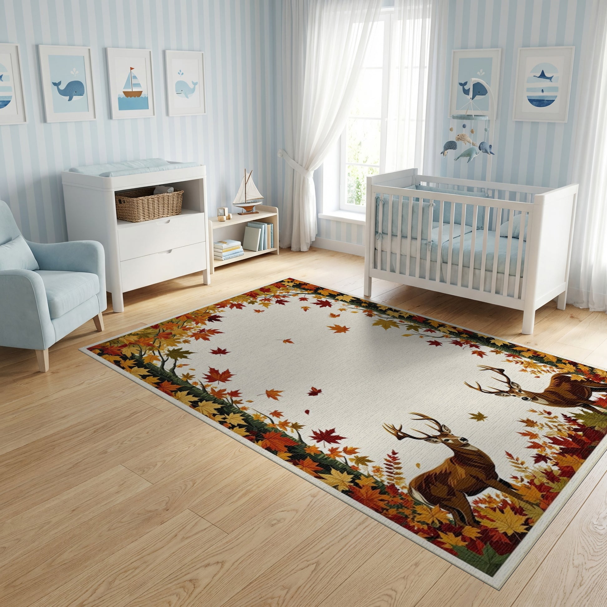 Flatwoven High Traffic Area Rug, Autumn Deer Falling Leaves Border Rug, Non Slip, Stain Resistant, Washable Area Rugs for Study Room, Playroom, Bedroom Overview: