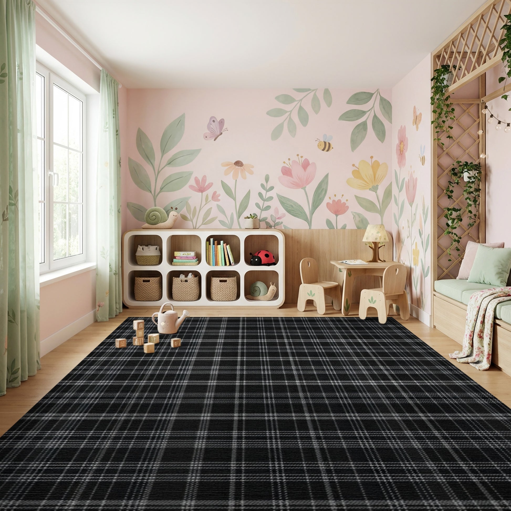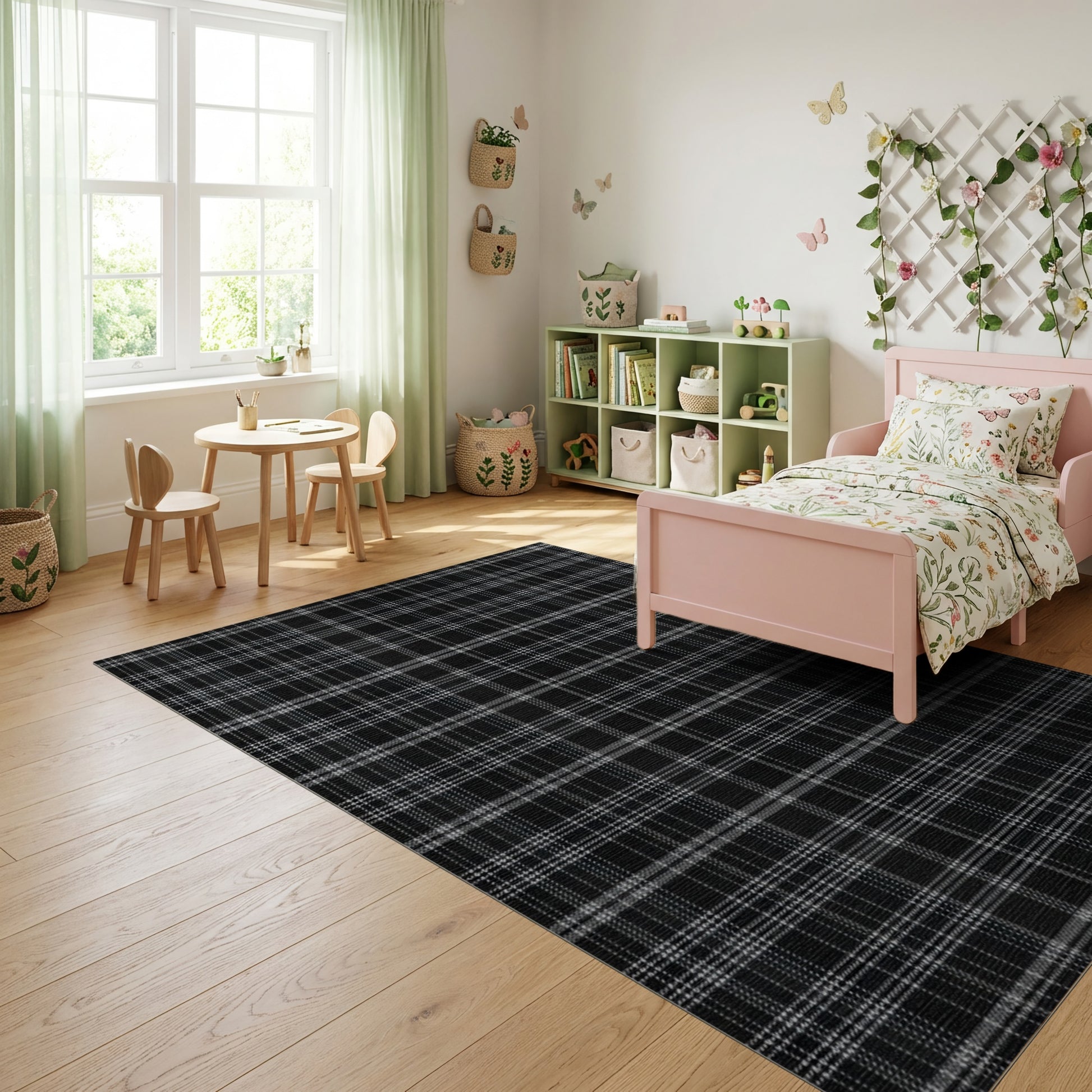 Flatwoven High Traffic Area Rug, Black and White Checkered Grid Rug, Non Slip, Stain Resistant, Washable Area Rugs for Study Room, Playroom, Bedroom Overview: