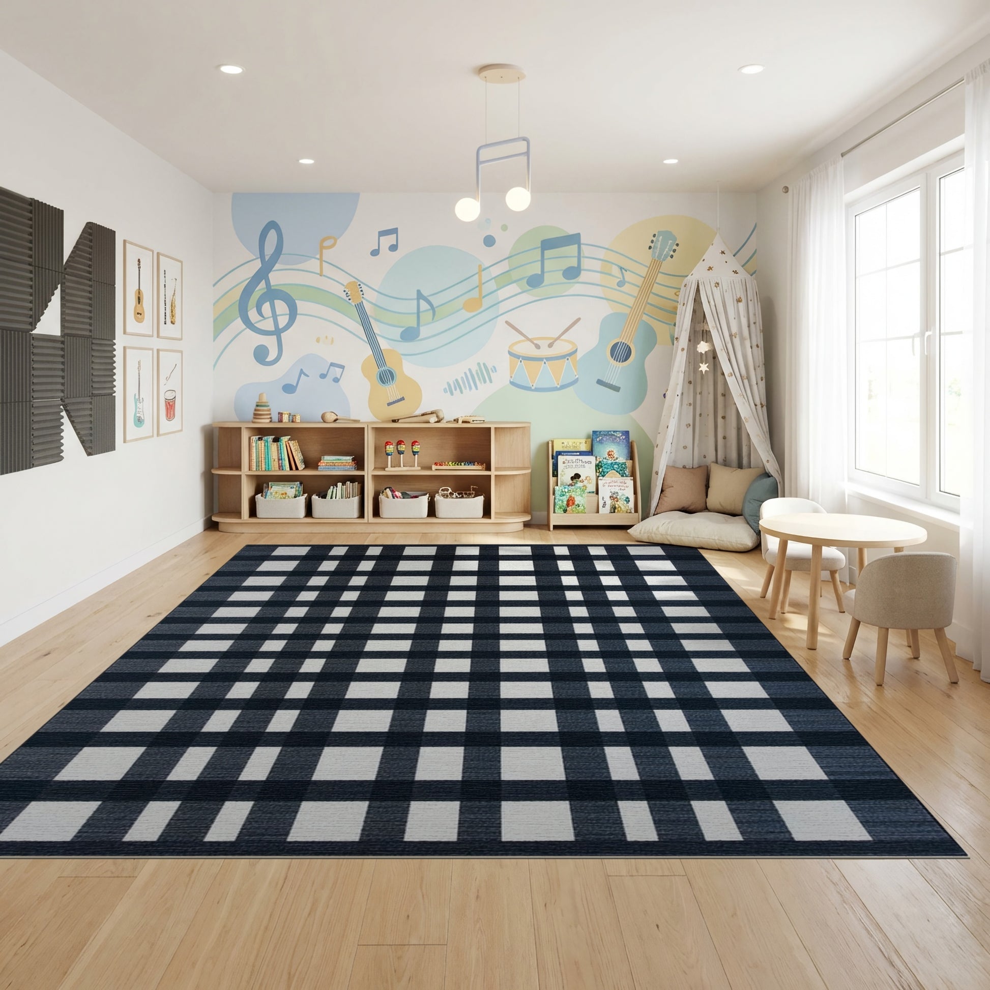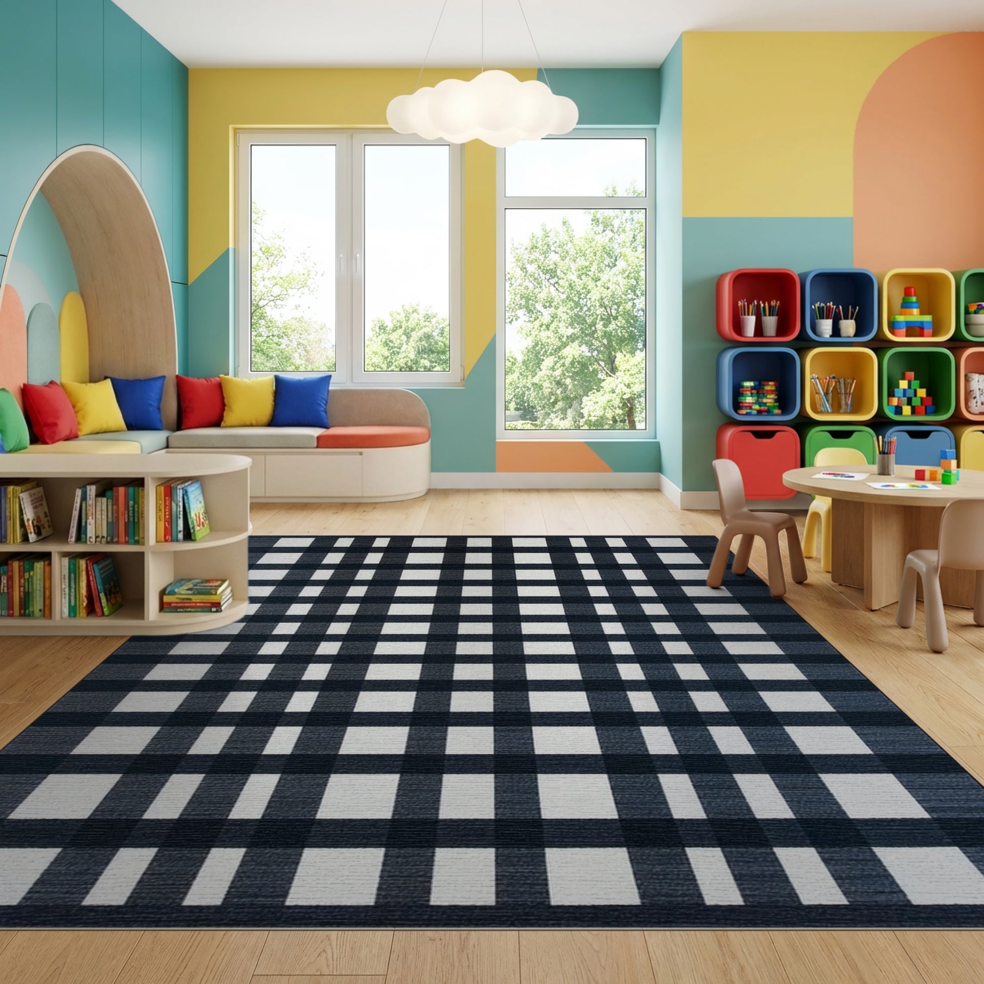 Flatwoven High Traffic Area Rug, Black and White Geometric Grid Rug, Non Slip, Stain Resistant, Washable Area Rugs for Study Room, Playroom, Bedroom Overview:
