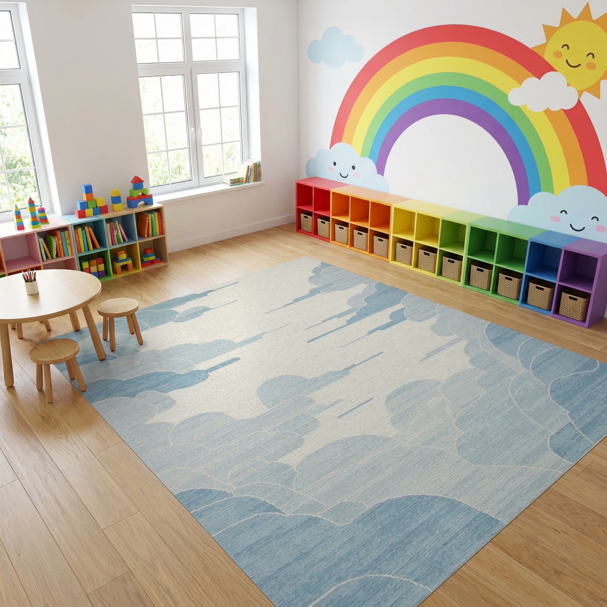 Flatwoven High Traffic Area Rug, Blue and White Fluffy Clouds Rug, Non Slip, Stain Resistant, Washable Area Rugs for Study Room, Playroom, Bedroom Overview: