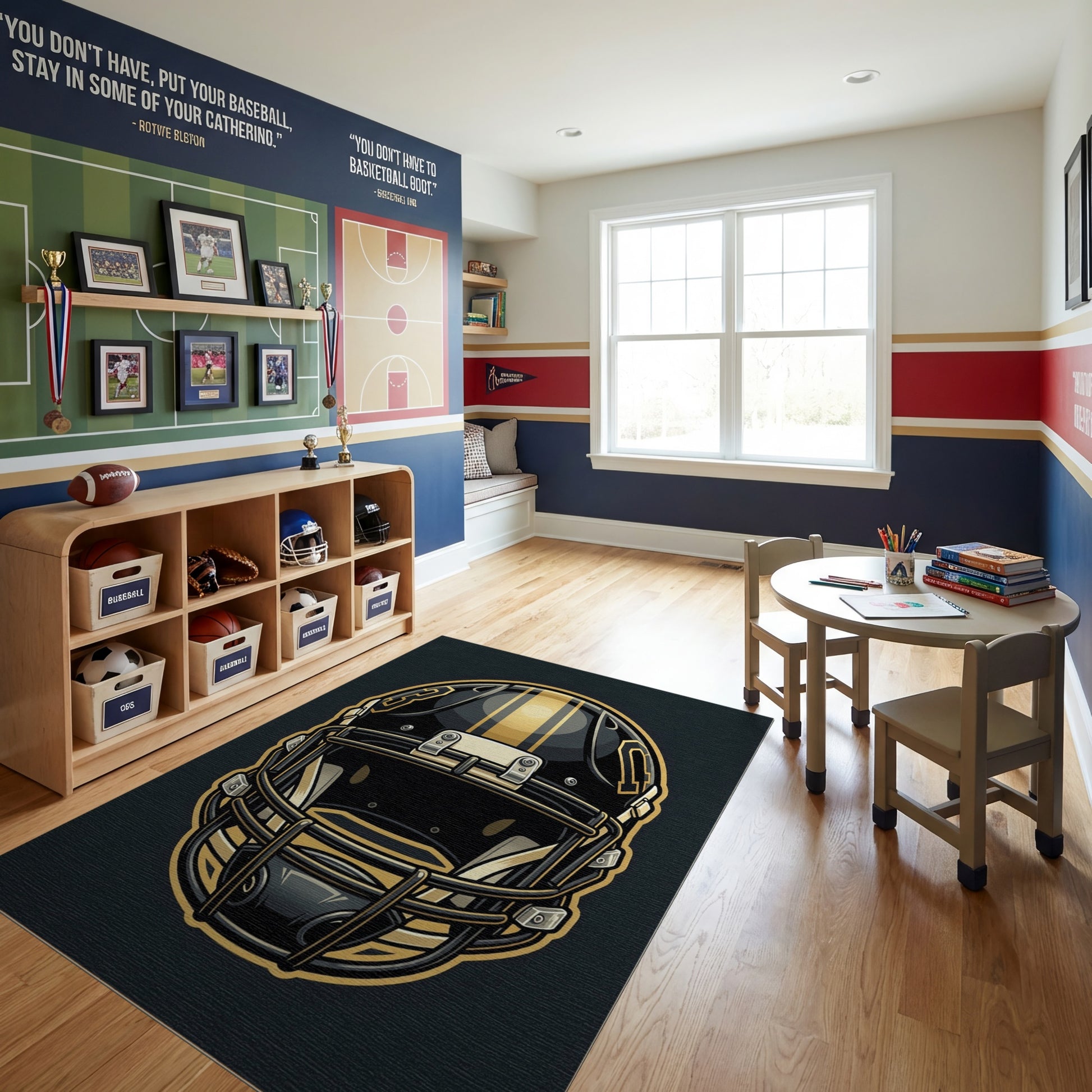 Flatwoven High Traffic Area Rug, Bold Black Gold Striped Helmet Rug, Non Slip, Stain Resistant, Washable Area Rugs for Study Room, Playroom, Bedroom Overview: