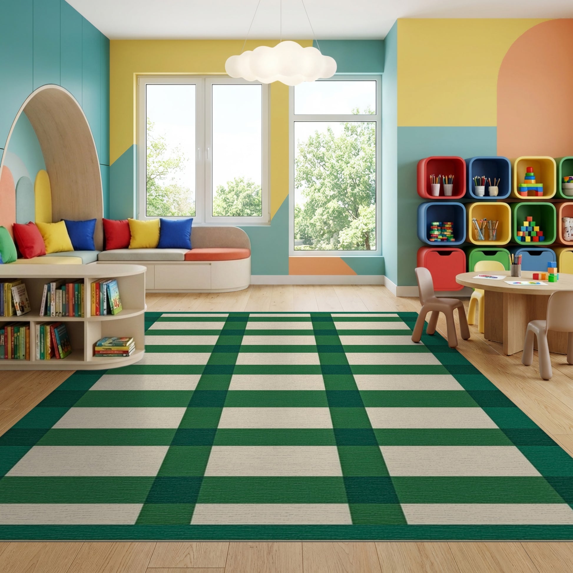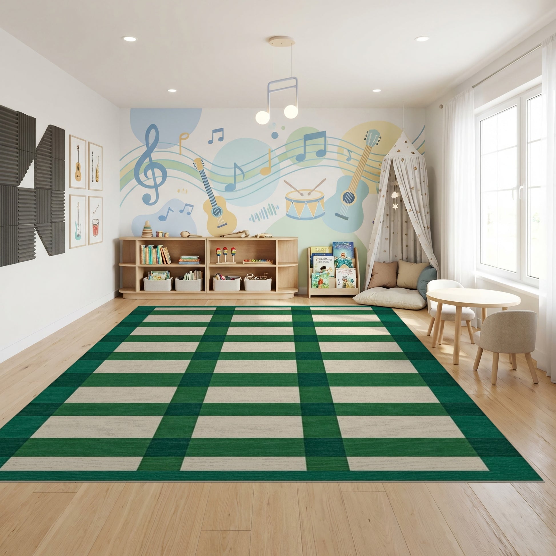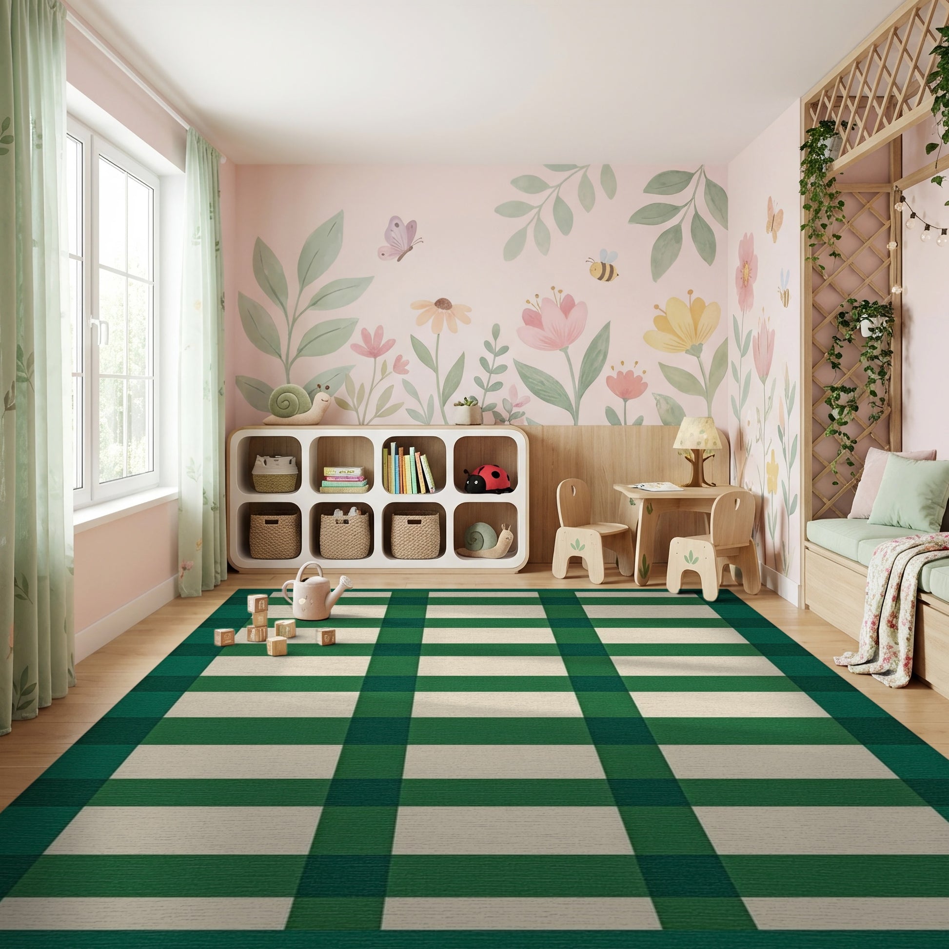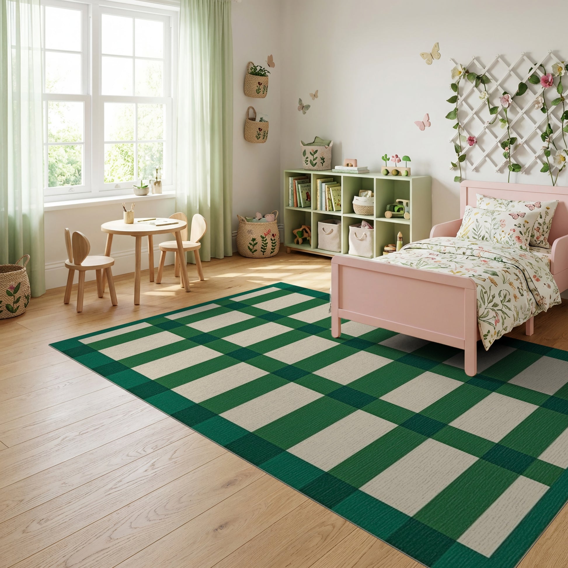Flatwoven High Traffic Area Rug, Bold Green White Plaid Check Rug, Non Slip, Stain Resistant, Washable Area Rugs for Study Room, Playroom, Bedroom Overview:
