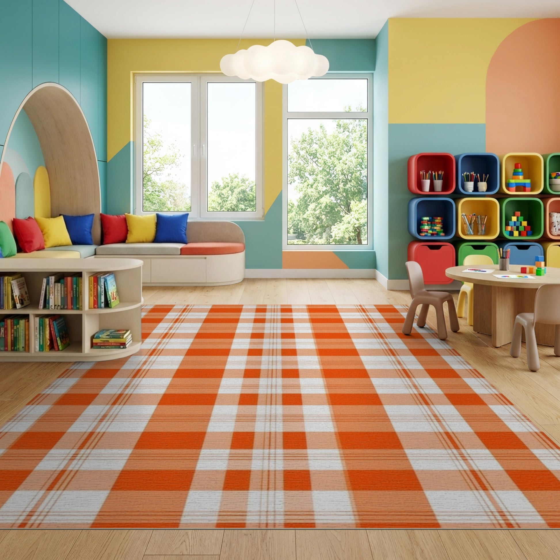 Flatwoven High Traffic Area Rug, Bold Orange and White Plaid Rug, Non Slip, Stain Resistant, Washable Area Rugs for Study Room, Playroom, Bedroom Overview: