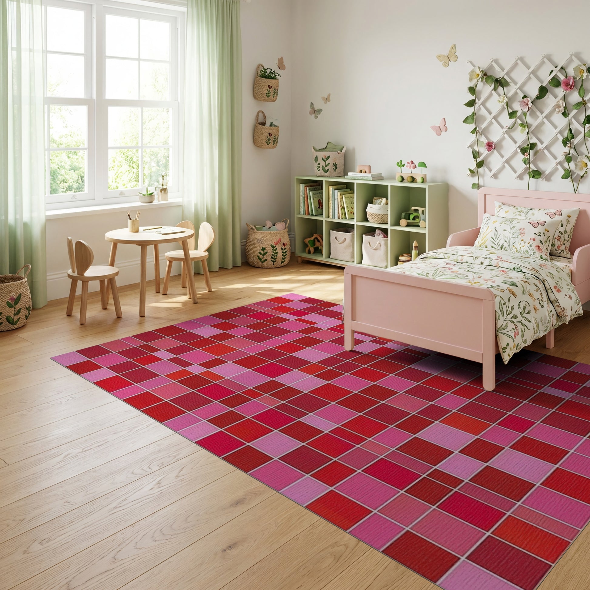 Flatwoven High Traffic Area Rug, Bold Pink Red Mosaic Grid Rug, Non Slip, Stain Resistant, Washable Area Rugs for Study Room, Playroom, Bedroom Overview: