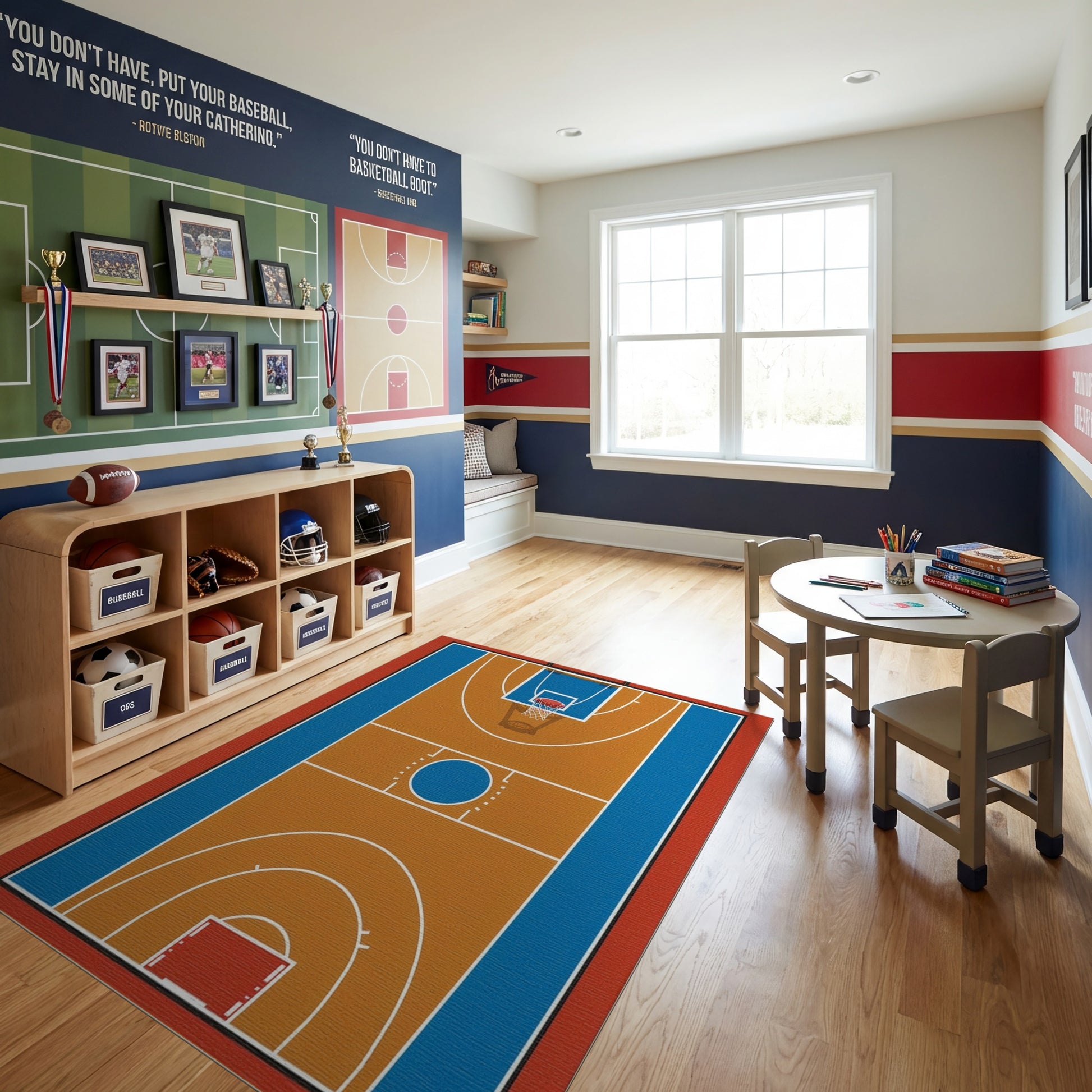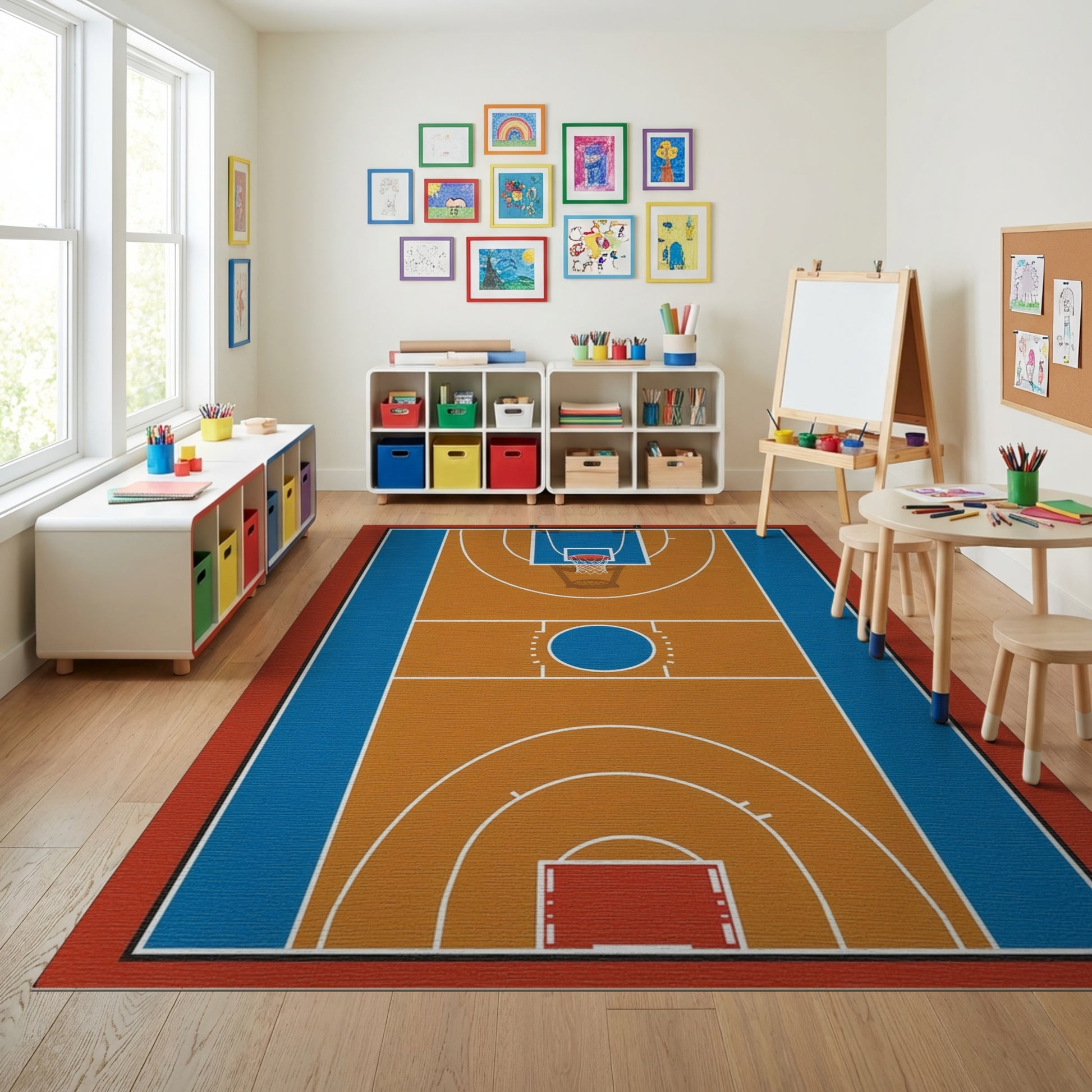 Flatwoven High Traffic Area Rug, Bold Tan Blue Basketball Court Rug, Non Slip, Stain Resistant, Washable Area Rugs for Study Room, Playroom, Bedroom Overview: