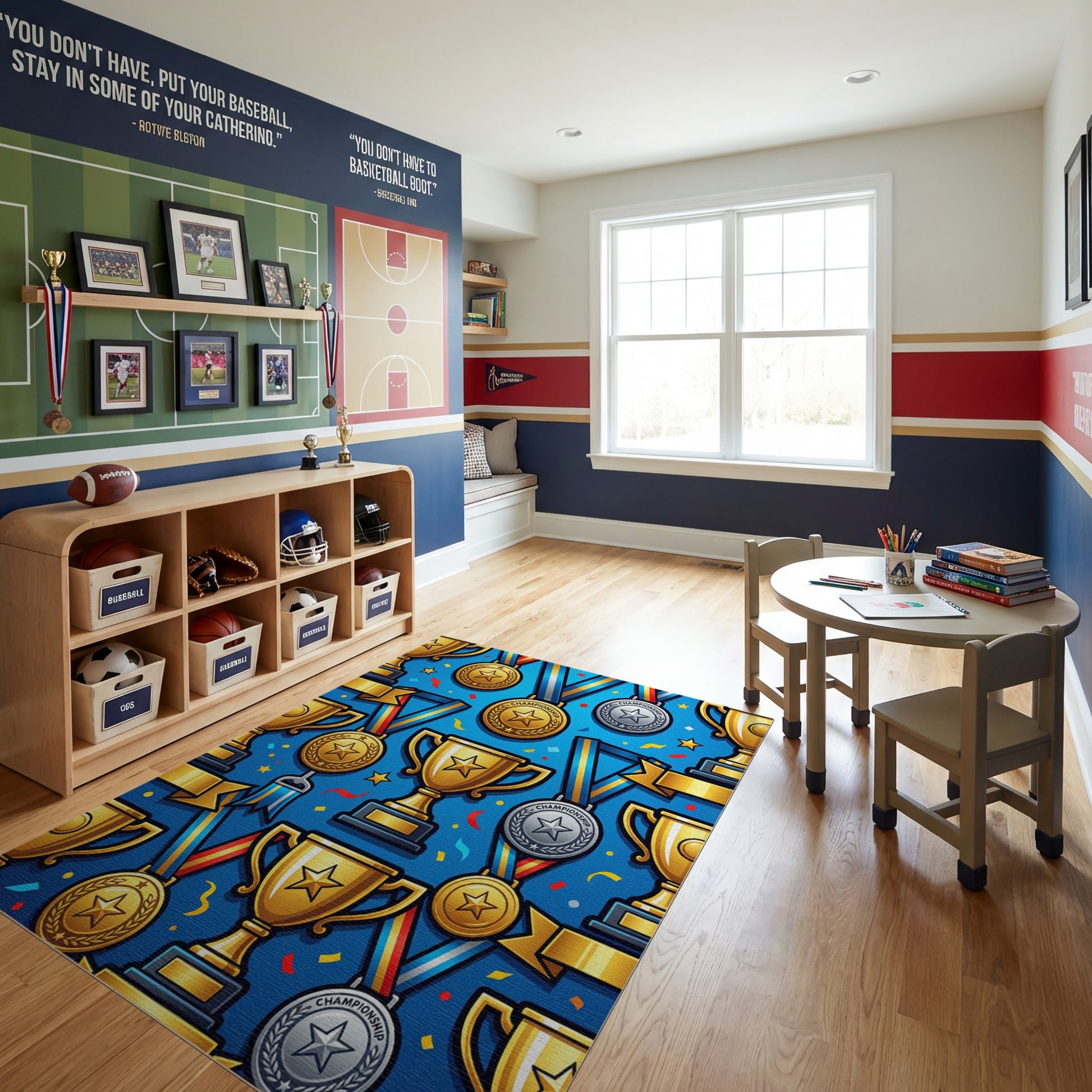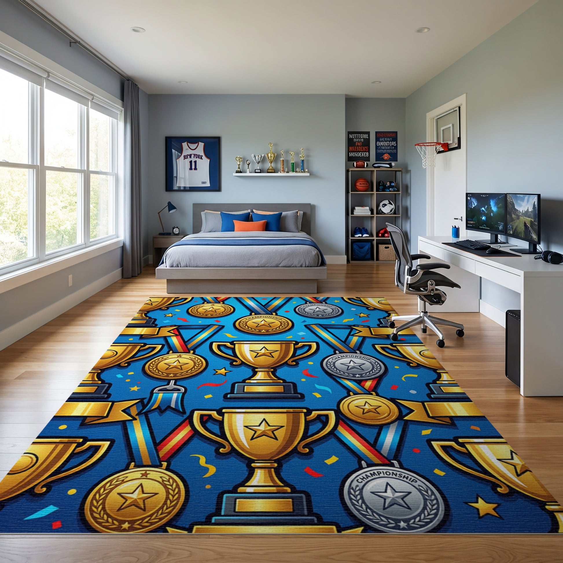 Flatwoven High Traffic Area Rug, Celebratory Gold Silver Trophies Confetti Rug, Non Slip, Stain Resistant, Washable Area Rugs for Study Room, Playroom, Bedroom Overview: