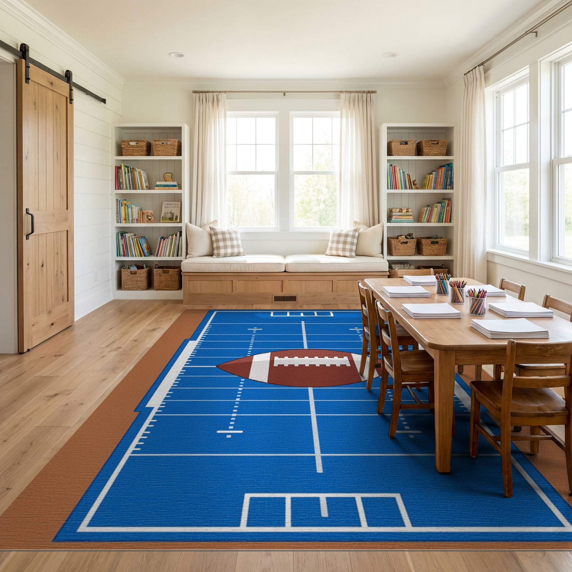 Flatwoven High Traffic Area Rug, Central Football Blue Field Rug, Non Slip, Stain Resistant, Washable Area Rugs for Study Room, Playroom, Bedroom Overview: