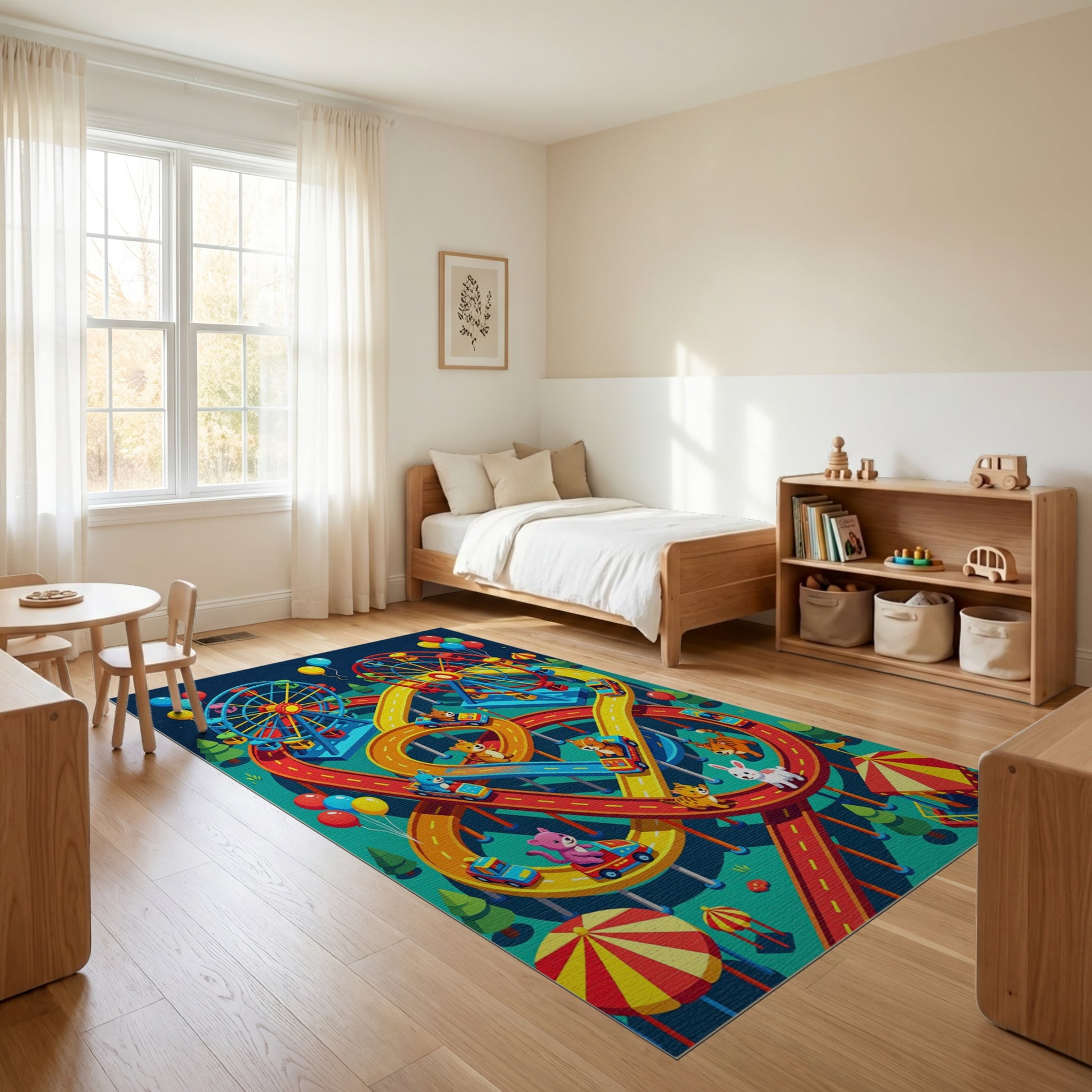 Flatwoven High Traffic Area Rug, Colorful Carnival Animals Racing Rug, Non Slip, Stain Resistant, Washable Area Rugs for Study Room, Playroom, Bedroom Overview: