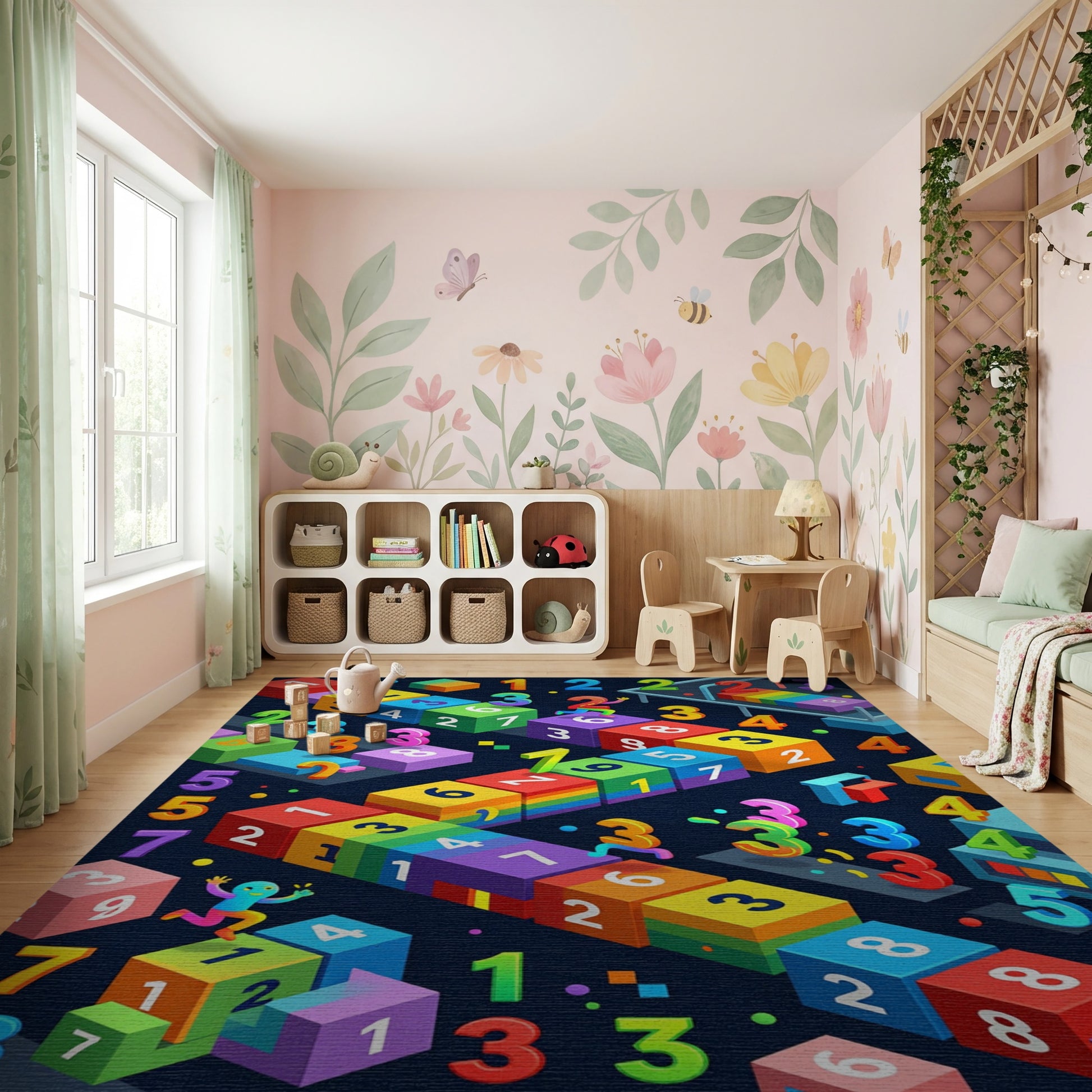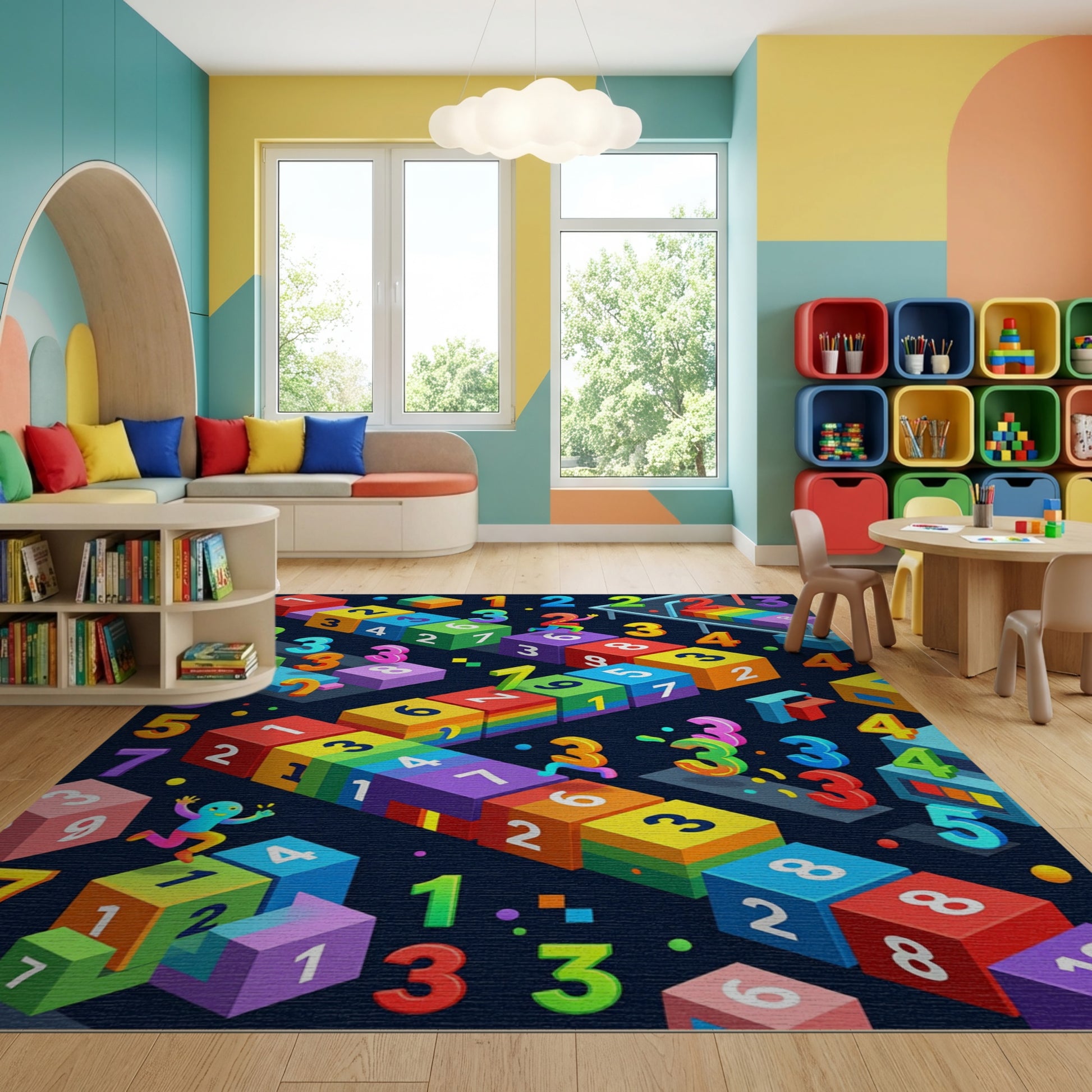 Flatwoven High Traffic Area Rug, Colorful Isometric Number Blocks Rug, Non Slip, Stain Resistant, Washable Area Rugs for Study Room, Playroom, Bedroom Overview: