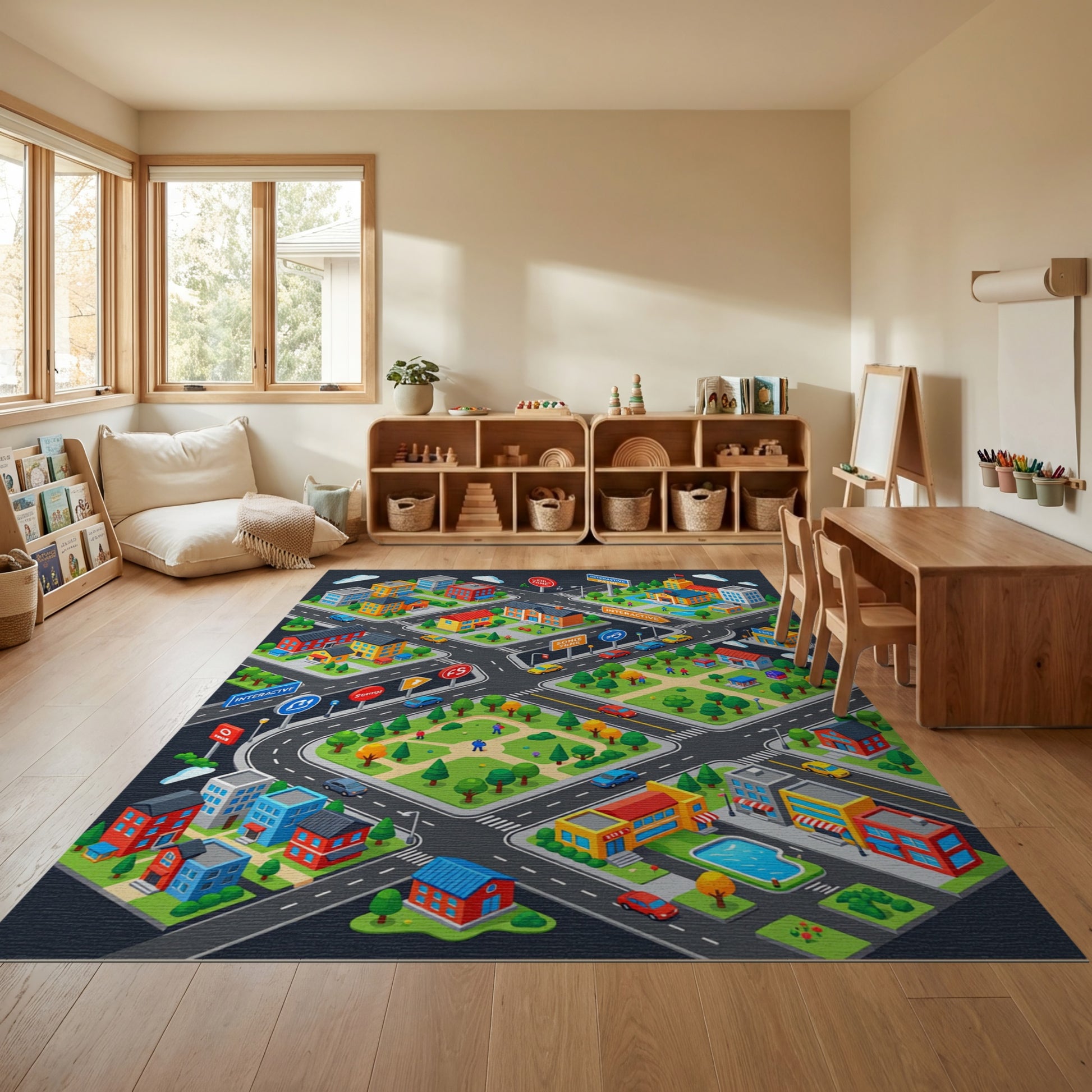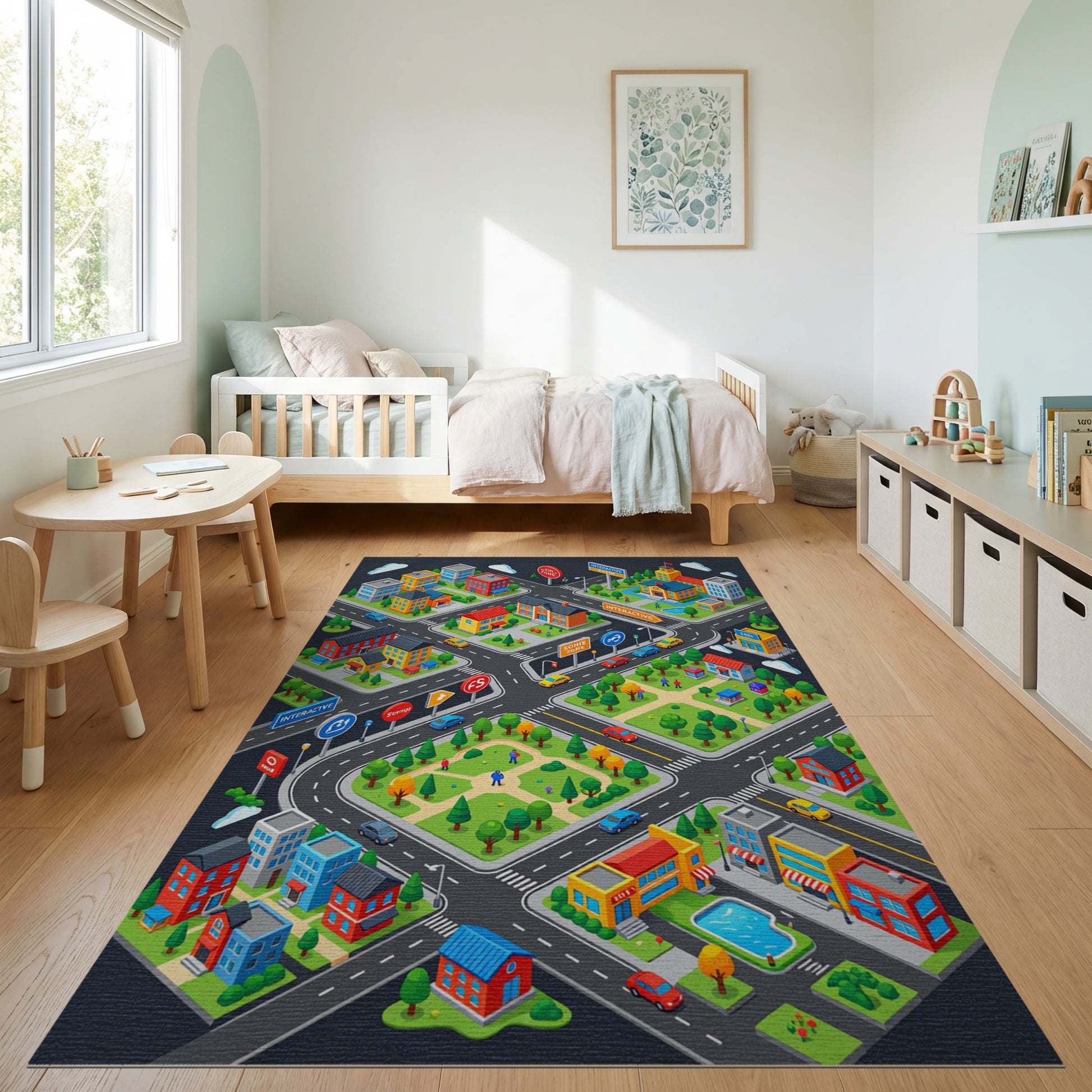 Flatwoven High Traffic Area Rug, Colorful Isometric Urban Cityscape Rug 2, Non Slip, Stain Resistant, Washable Area Rugs for Study Room, Playroom, Bedroom Overview: