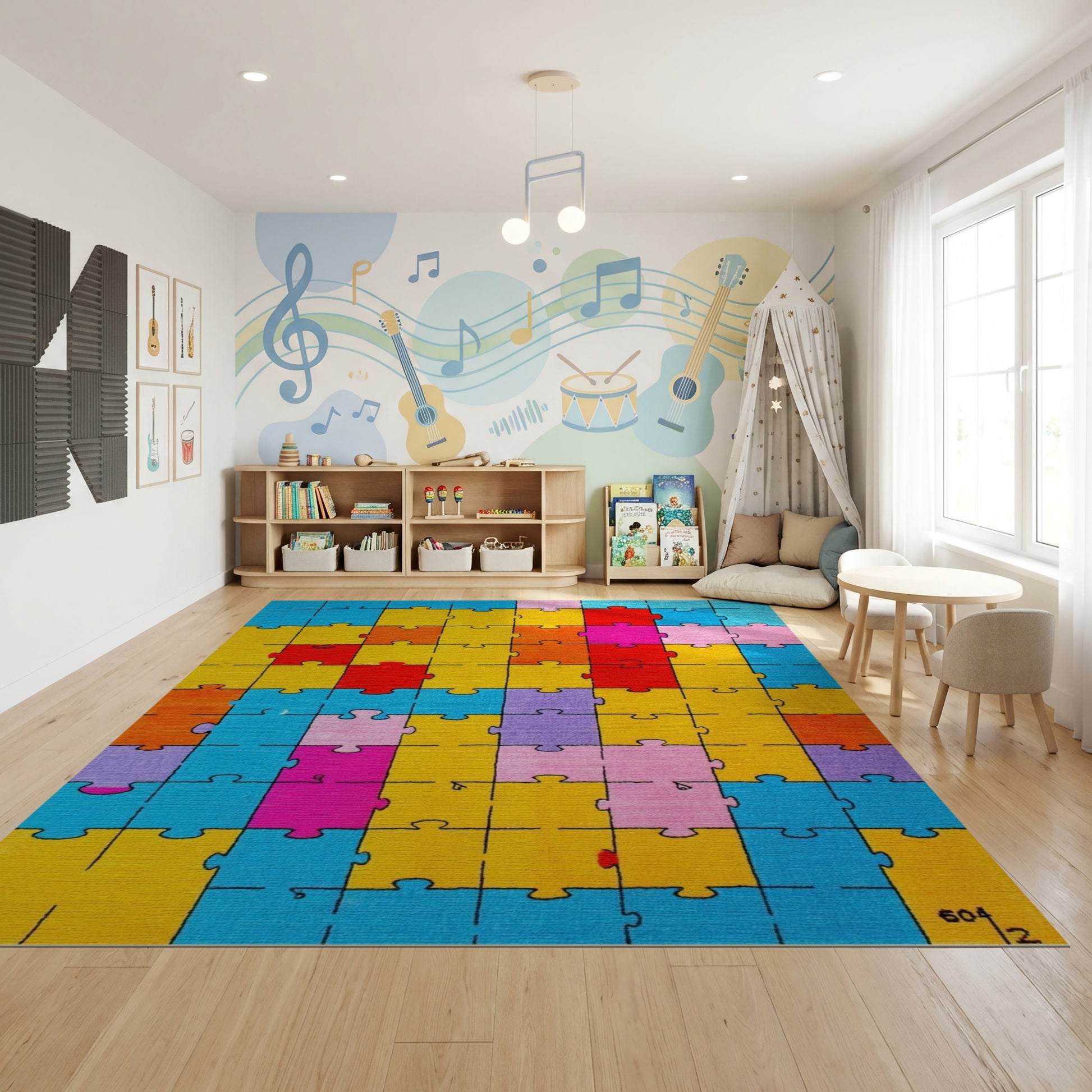 Flatwoven High Traffic Area Rug, Colorful Jigsaw Puzzle Mosaic Rug, Non Slip, Stain Resistant, Washable Area Rugs for Study Room, Playroom, Bedroom Overview: