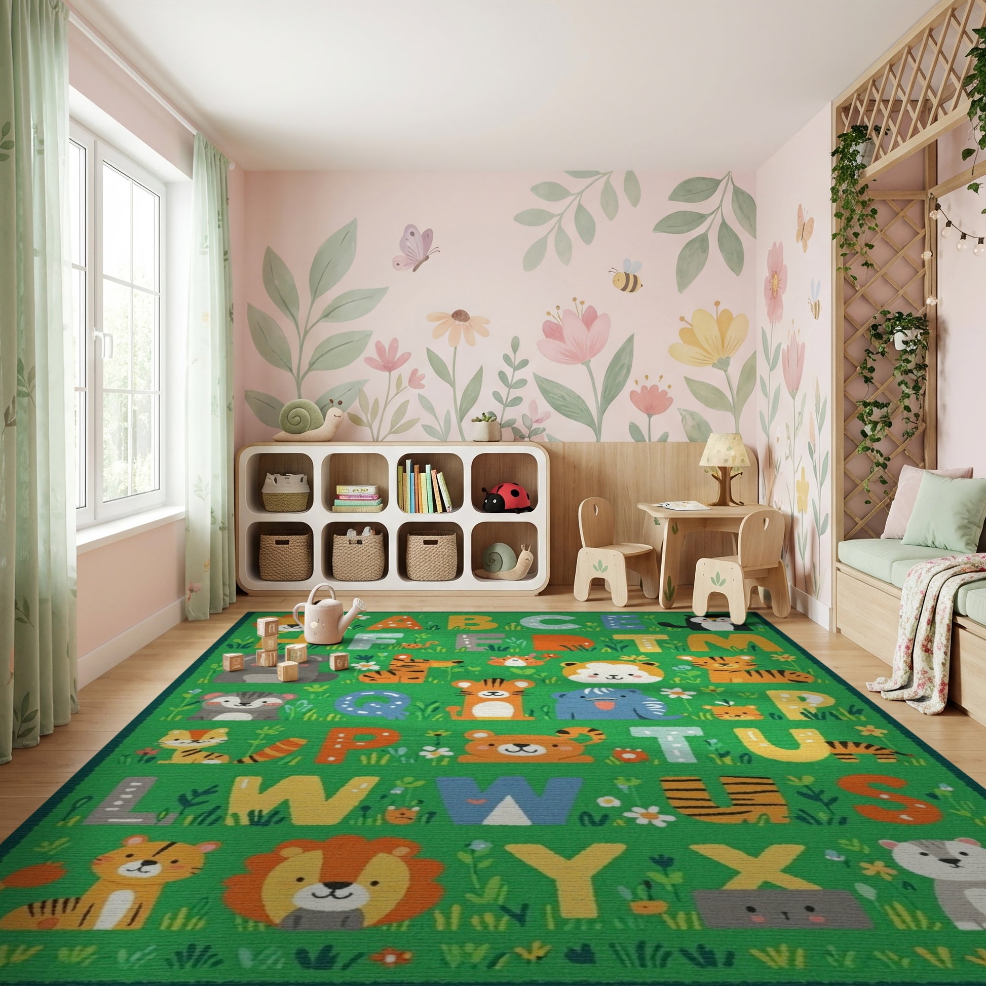 Flatwoven High Traffic Area Rug, Colorful Jungle Alphabet Animals Rug, Non Slip, Stain Resistant, Washable Area Rugs for Study Room, Playroom, Bedroom Overview: