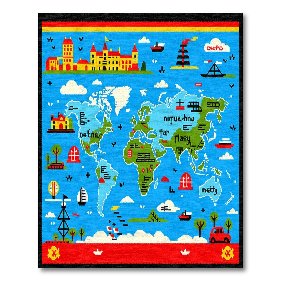 Flatwoven High Traffic Area Rug, Colorful Pixelated World Map Rug, Non Slip, Stain Resistant, Washable Area Rugs for Study Room, Playroom, Bedroom Overview: