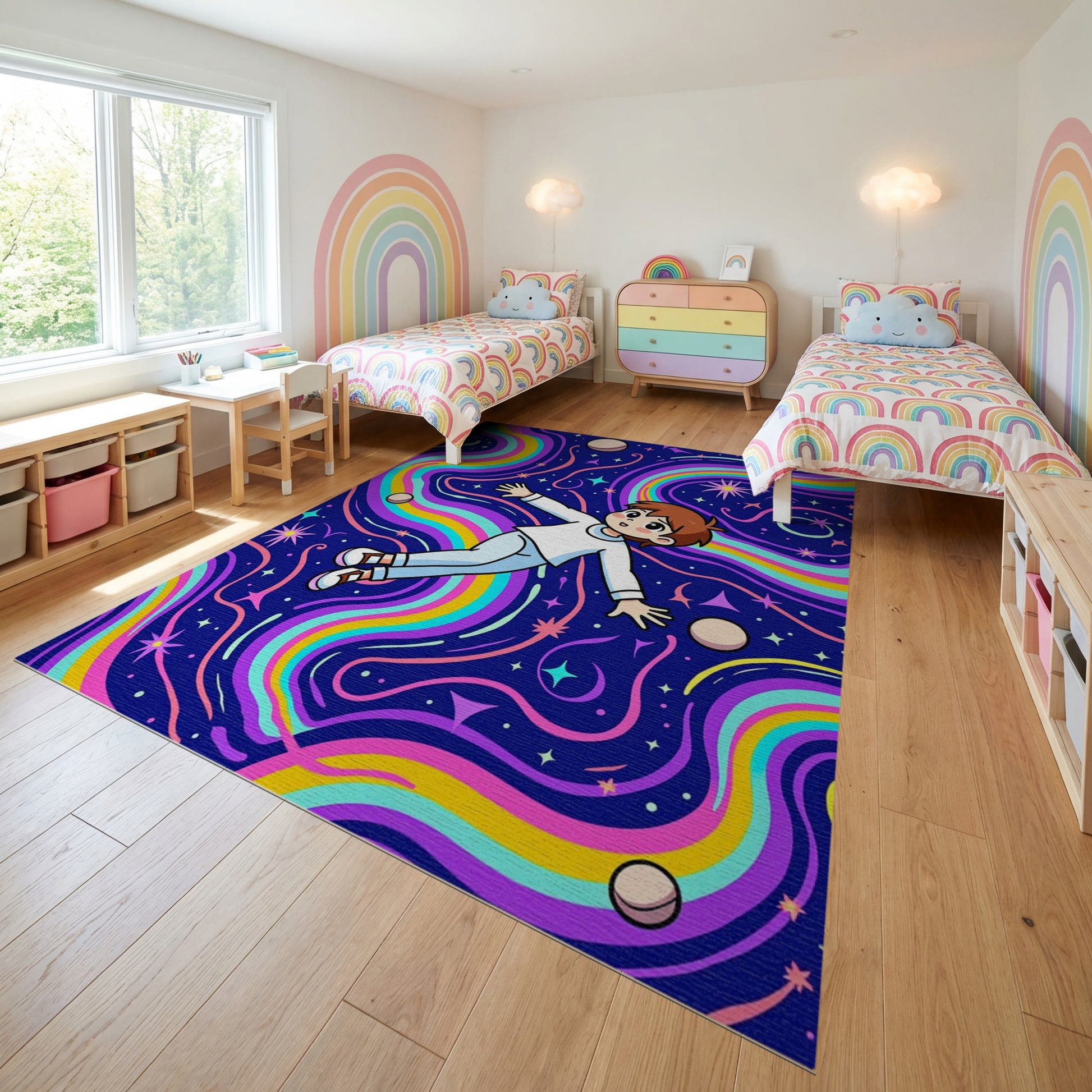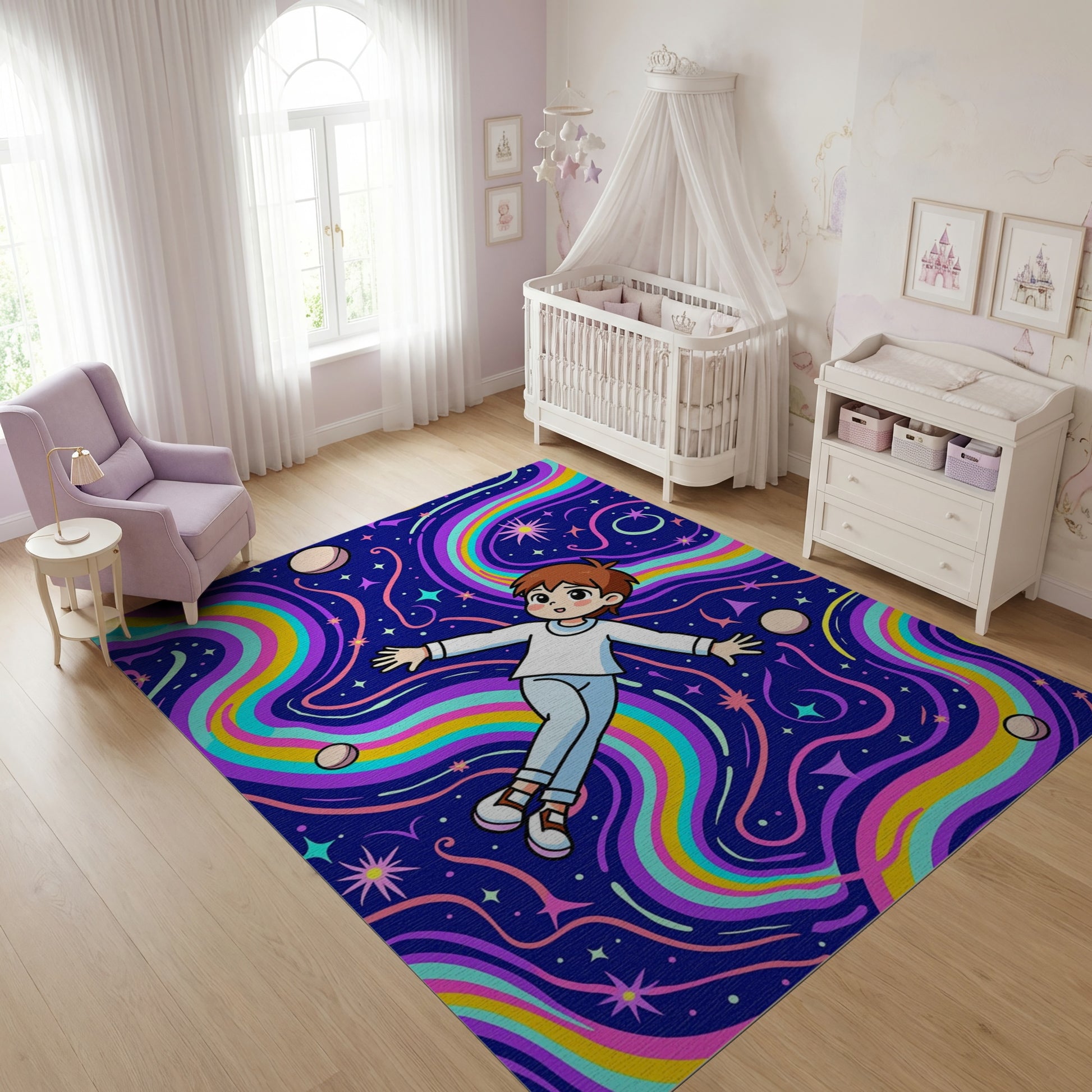Cosmic Rainbow Waves Floating Boy Stars Rug