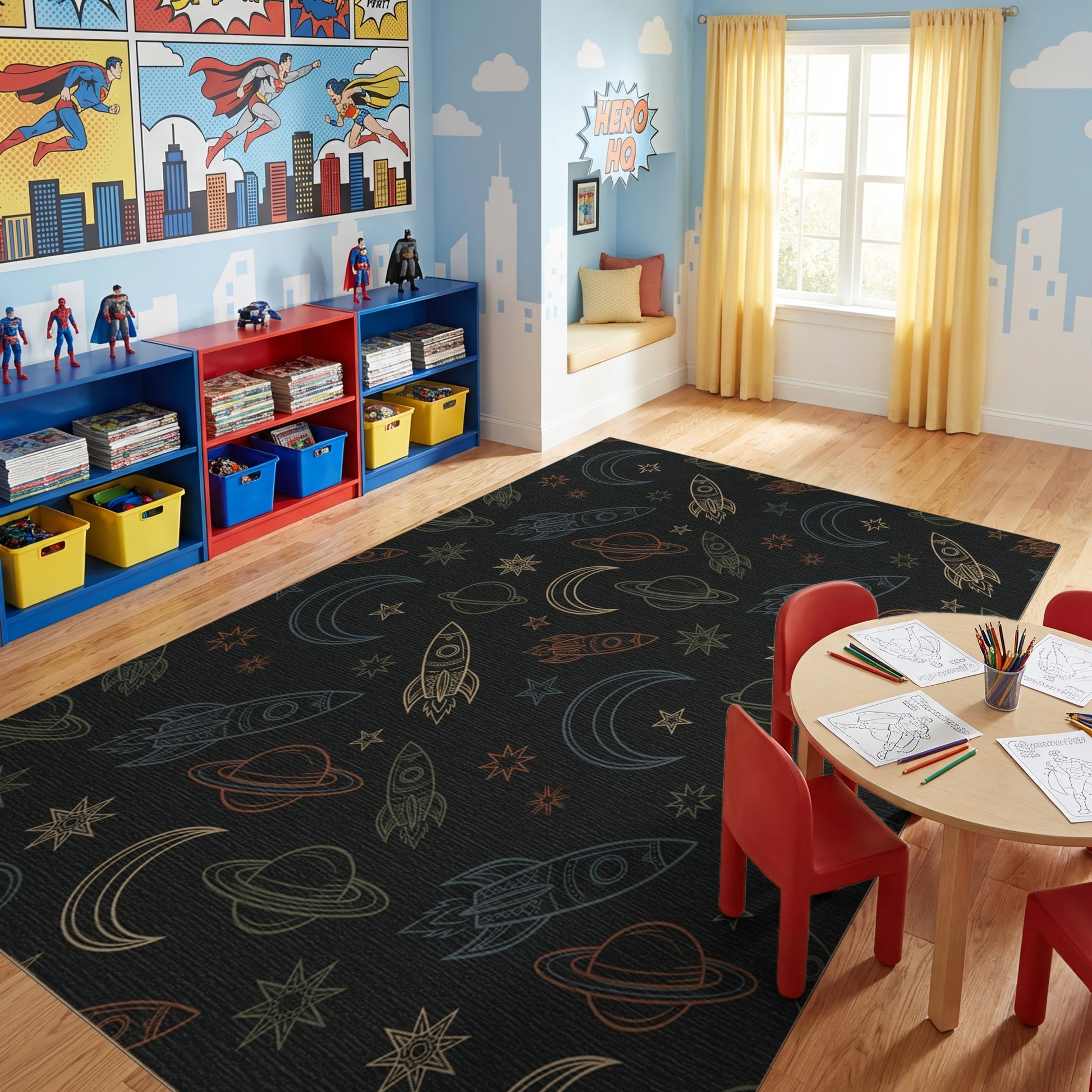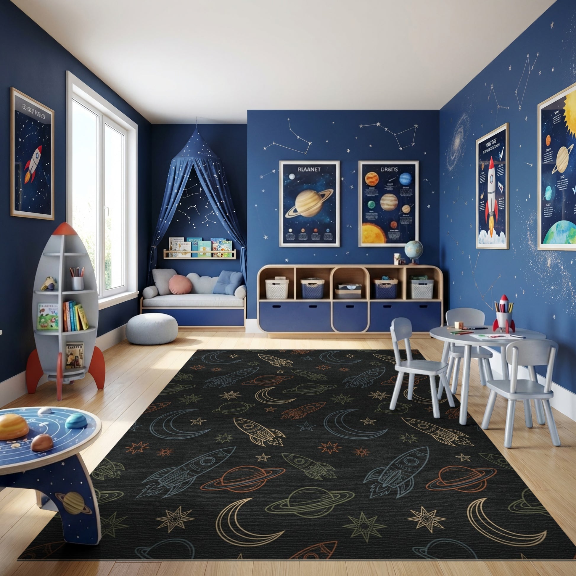 Flatwoven High Traffic Area Rug, Cosmic Rockets Stars Moons Planets Rug, Non Slip, Stain Resistant, Washable Area Rugs for Study Room, Playroom, Bedroom Overview: