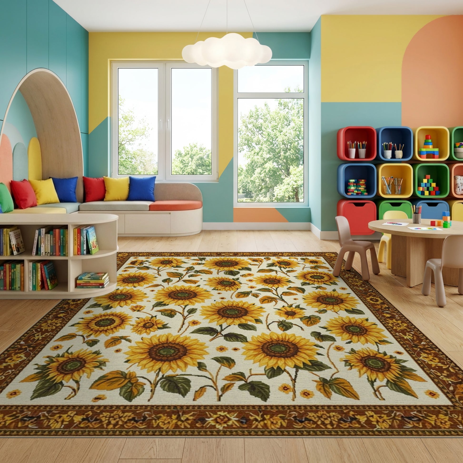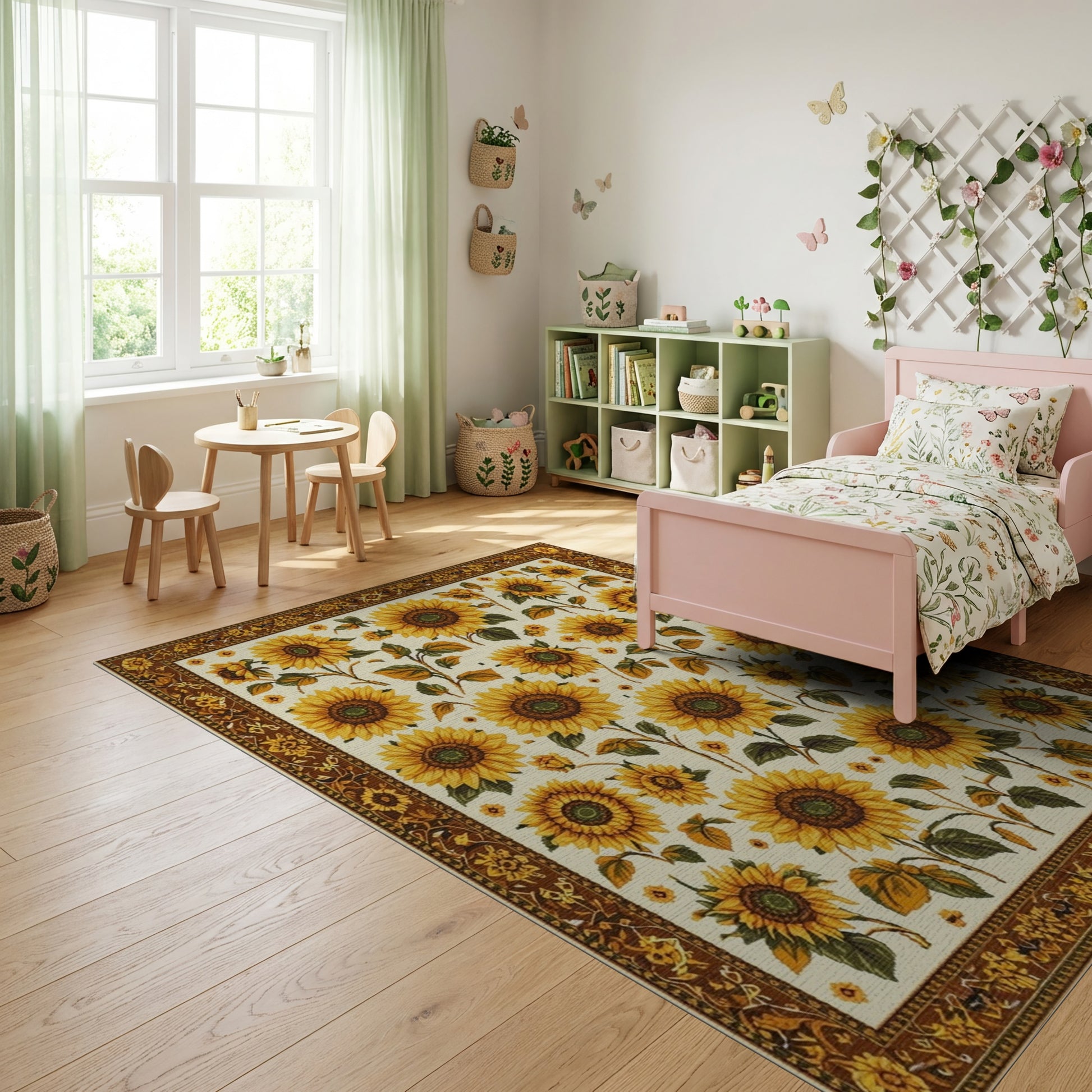Flatwoven High Traffic Area Rug, Cream Sunflower Leaves Golden Border Rug, Non Slip, Stain Resistant, Washable Area Rugs for Study Room, Playroom, Bedroom Overview: