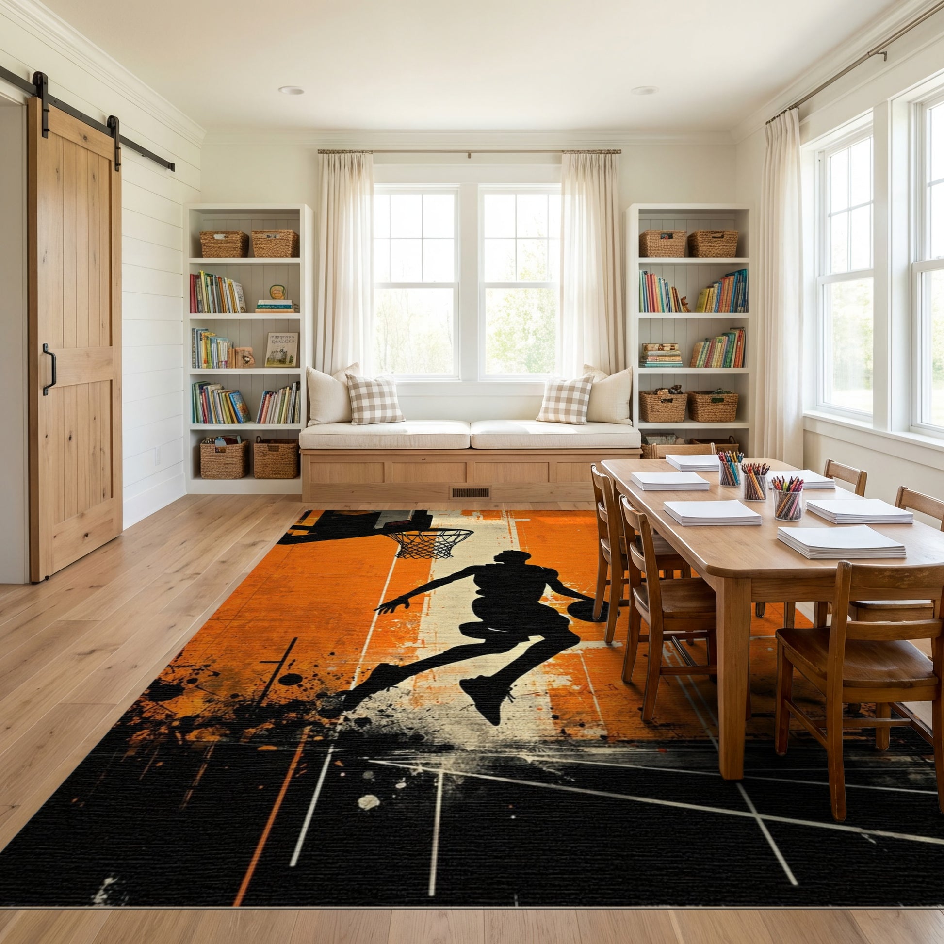 Flatwoven High Traffic Area Rug, Distressed Orange Dunk Silhouette Rug, Non Slip, Stain Resistant, Washable Area Rugs for Study Room, Playroom, Bedroom Overview: