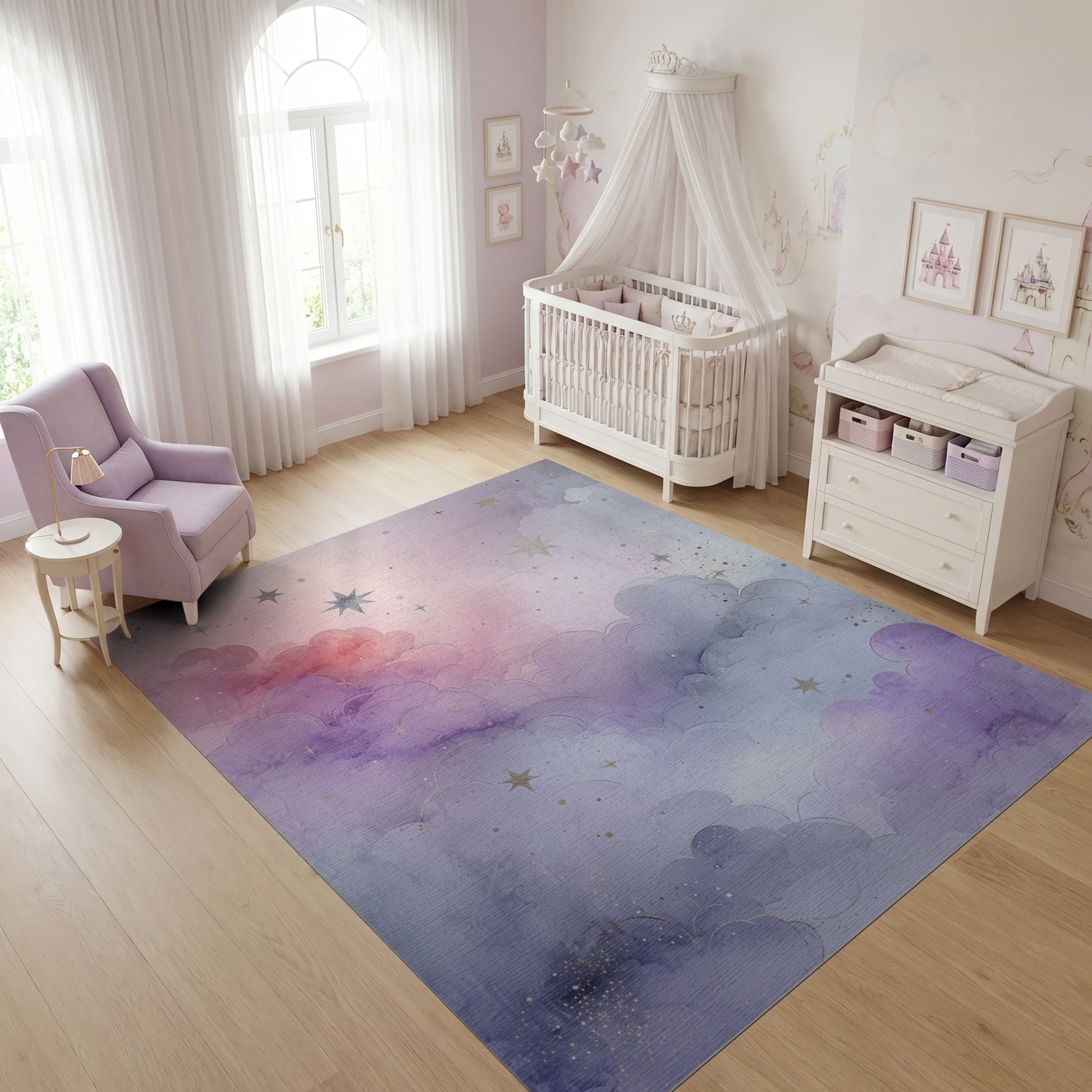 Flatwoven High Traffic Area Rug, Dreamy Pastel Clouds Golden Stars Rug, Non Slip, Stain Resistant, Washable Area Rugs for Study Room, Playroom, Bedroom Overview:
