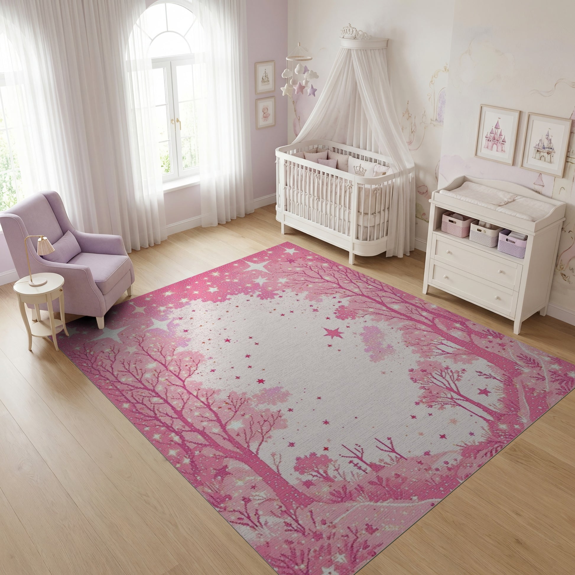 Flatwoven High Traffic Area Rug, Dreamy Pink Starry Forest Rug, Non Slip, Stain Resistant, Washable Area Rugs for Study Room, Playroom, Bedroom Overview: