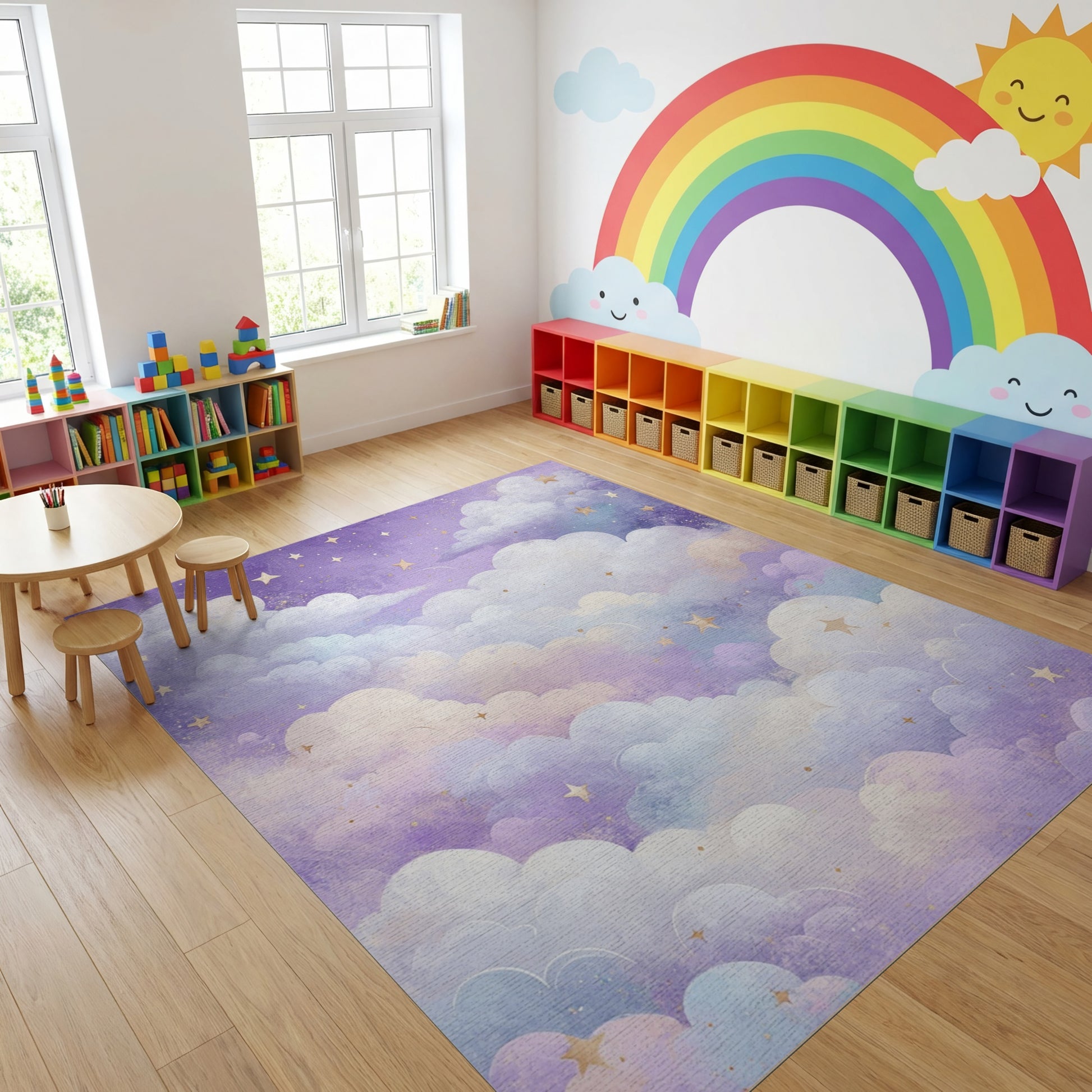 Flatwoven High Traffic Area Rug, Dreamy Purple Clouds Golden Stars Rug, Non Slip, Stain Resistant, Washable Area Rugs for Study Room, Playroom, Bedroom Overview: