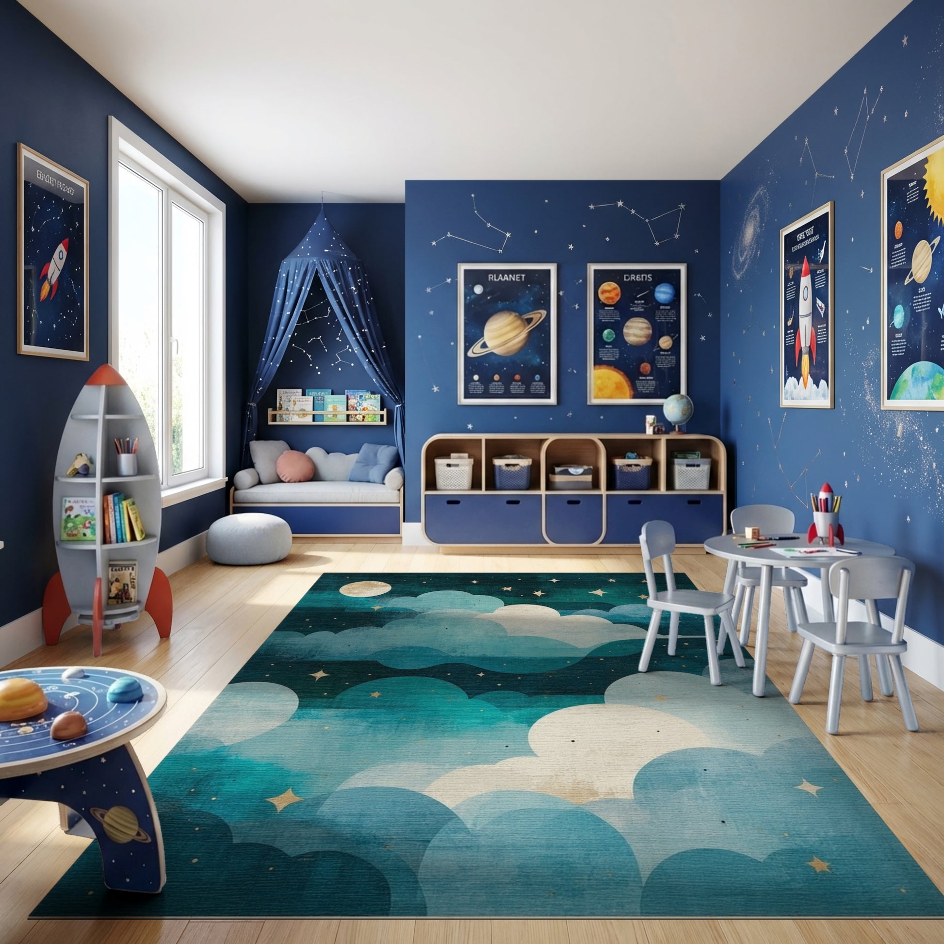 Flatwoven High Traffic Area Rug, Dreamy Teal Starry Clouds Moon Rug, Non Slip, Stain Resistant, Washable Area Rugs for Study Room, Playroom, Bedroom Overview: