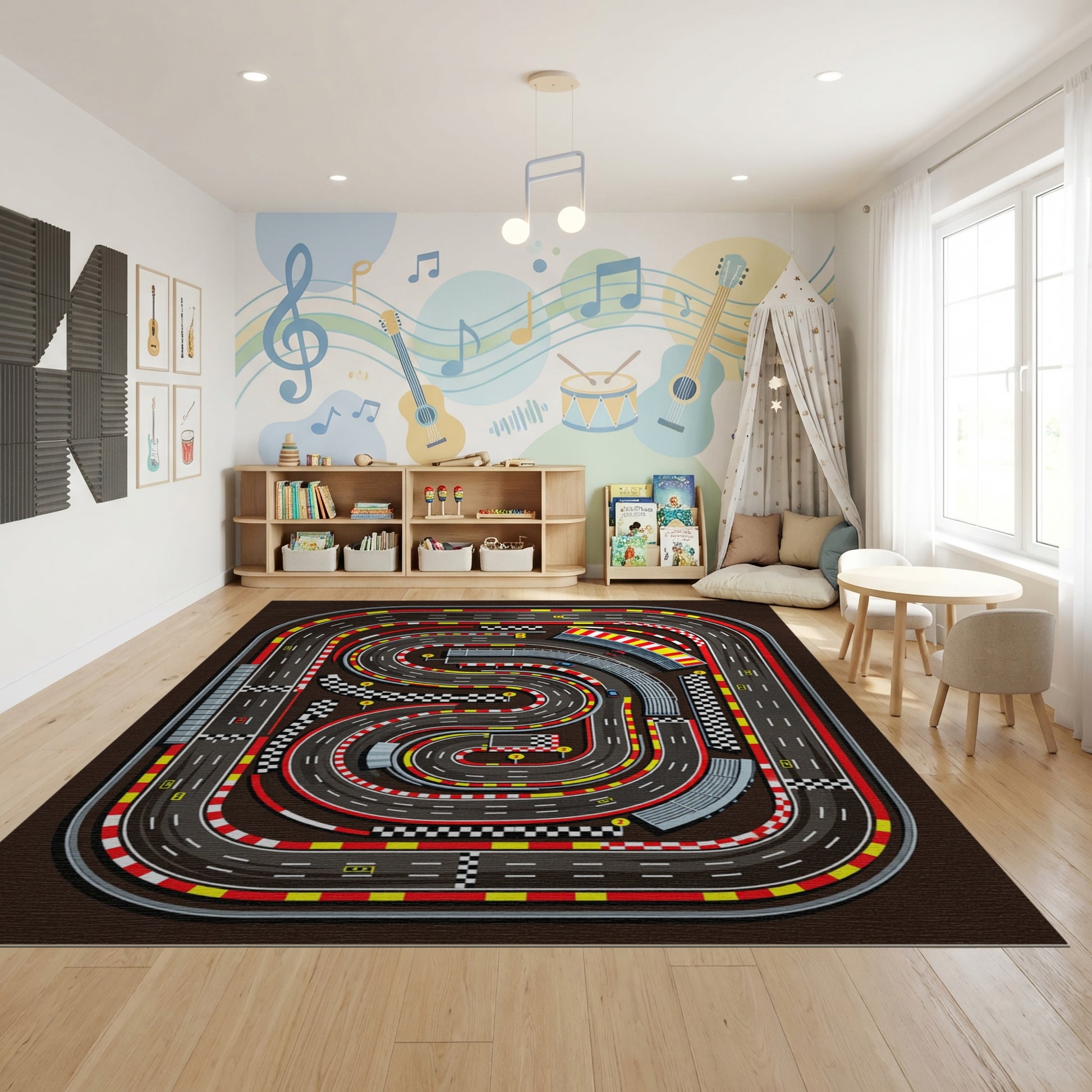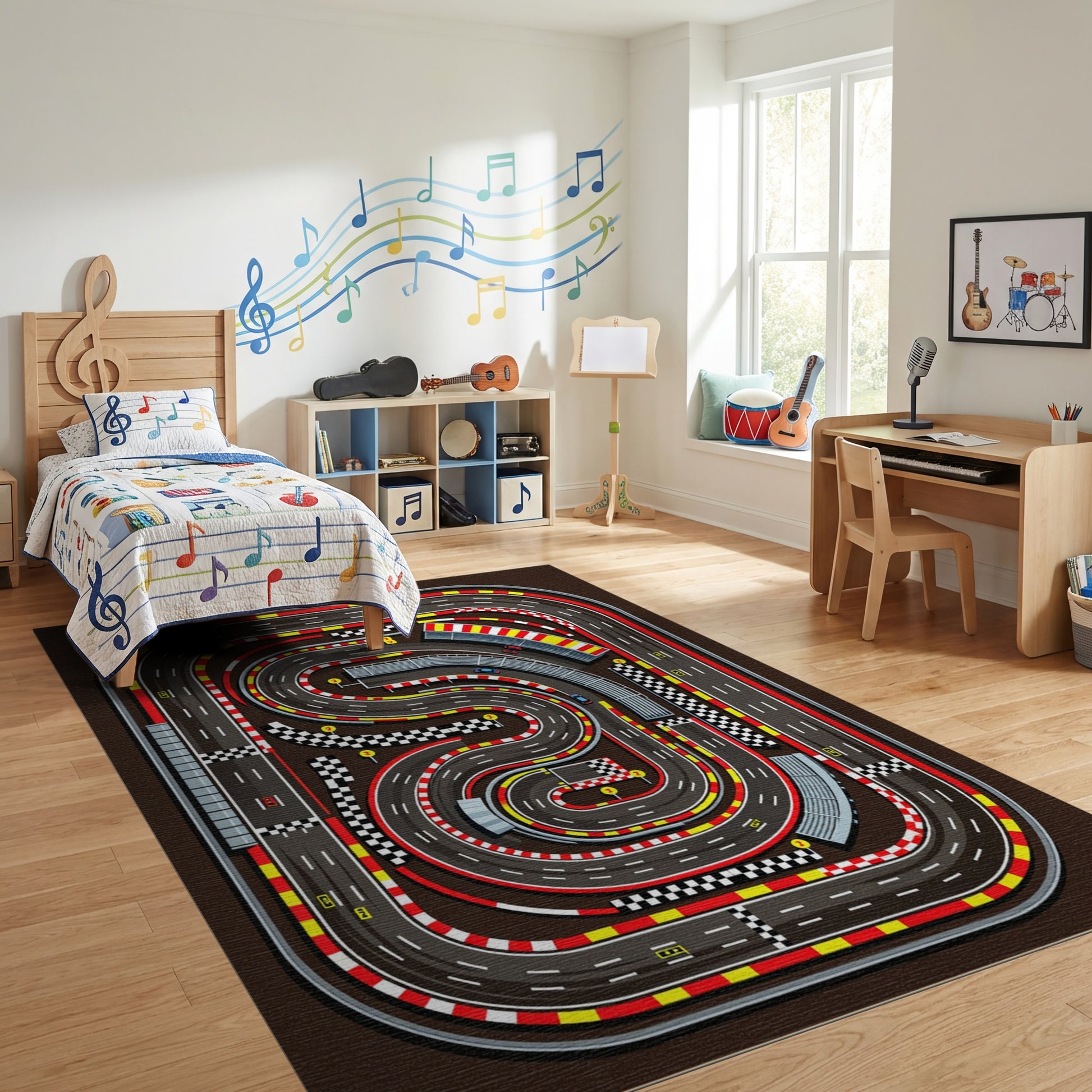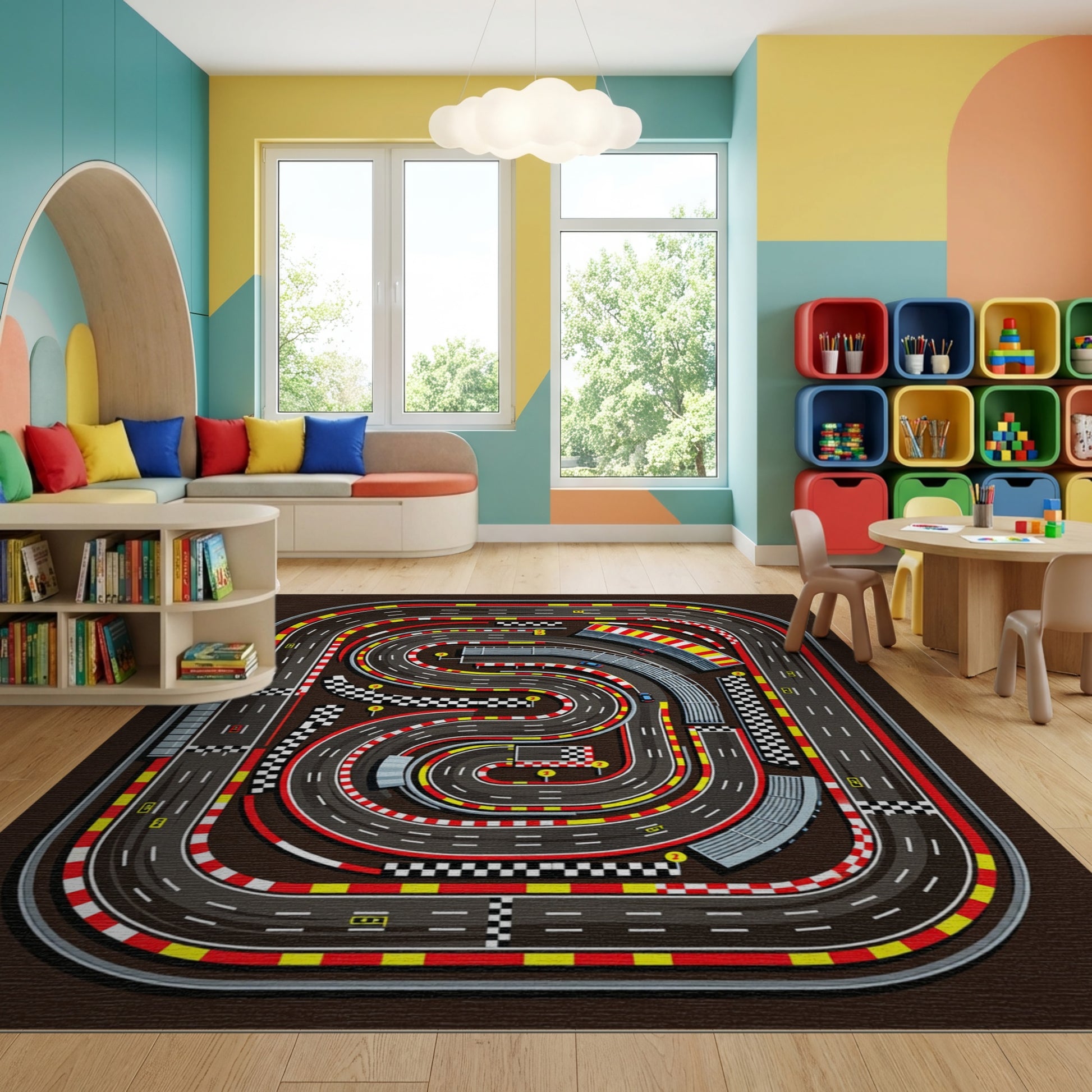 Flatwoven High Traffic Area Rug, Dynamic Racing Circuit Checkered Curves Rug, Non Slip, Stain Resistant, Washable Area Rugs for Study Room, Playroom, Bedroom Overview: