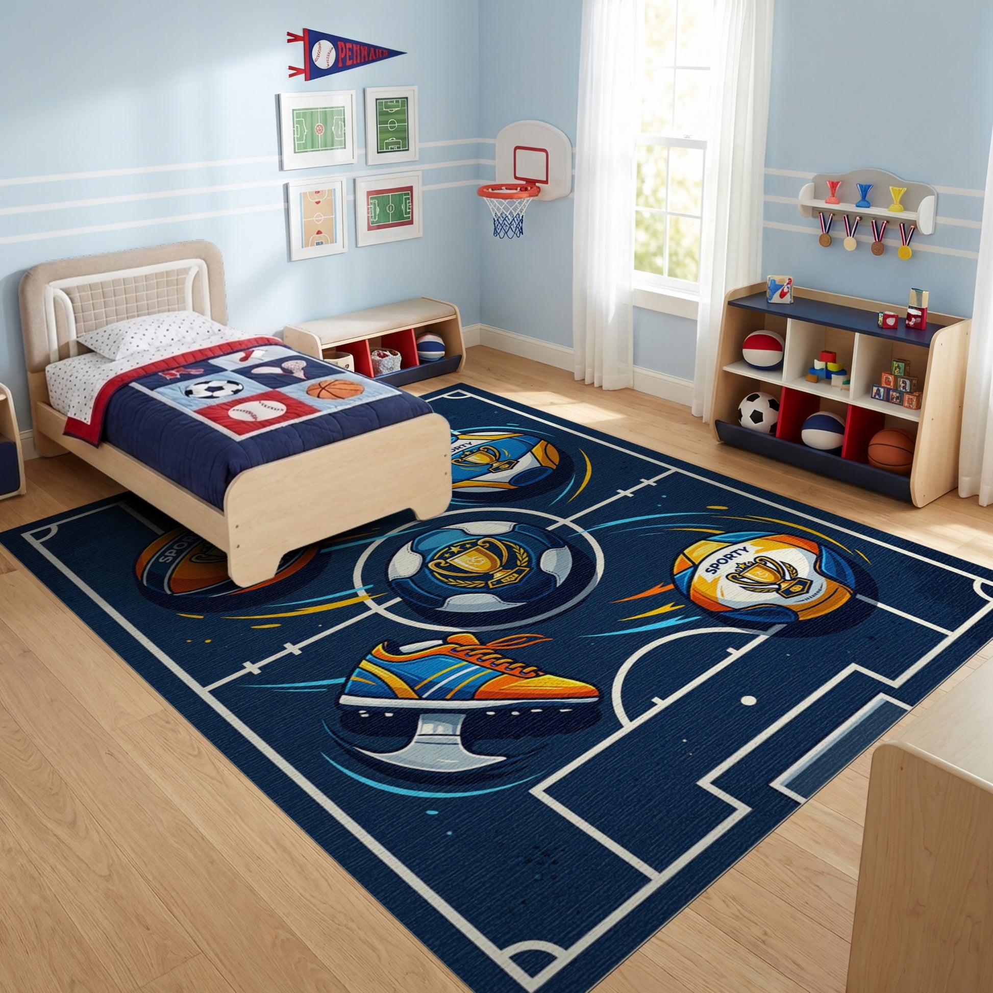 Flatwoven High Traffic Area Rug, Dynamic Sports Balls Sneakers Trophies Rug, Non Slip, Stain Resistant, Washable Area Rugs for Study Room, Playroom, Bedroom Overview: