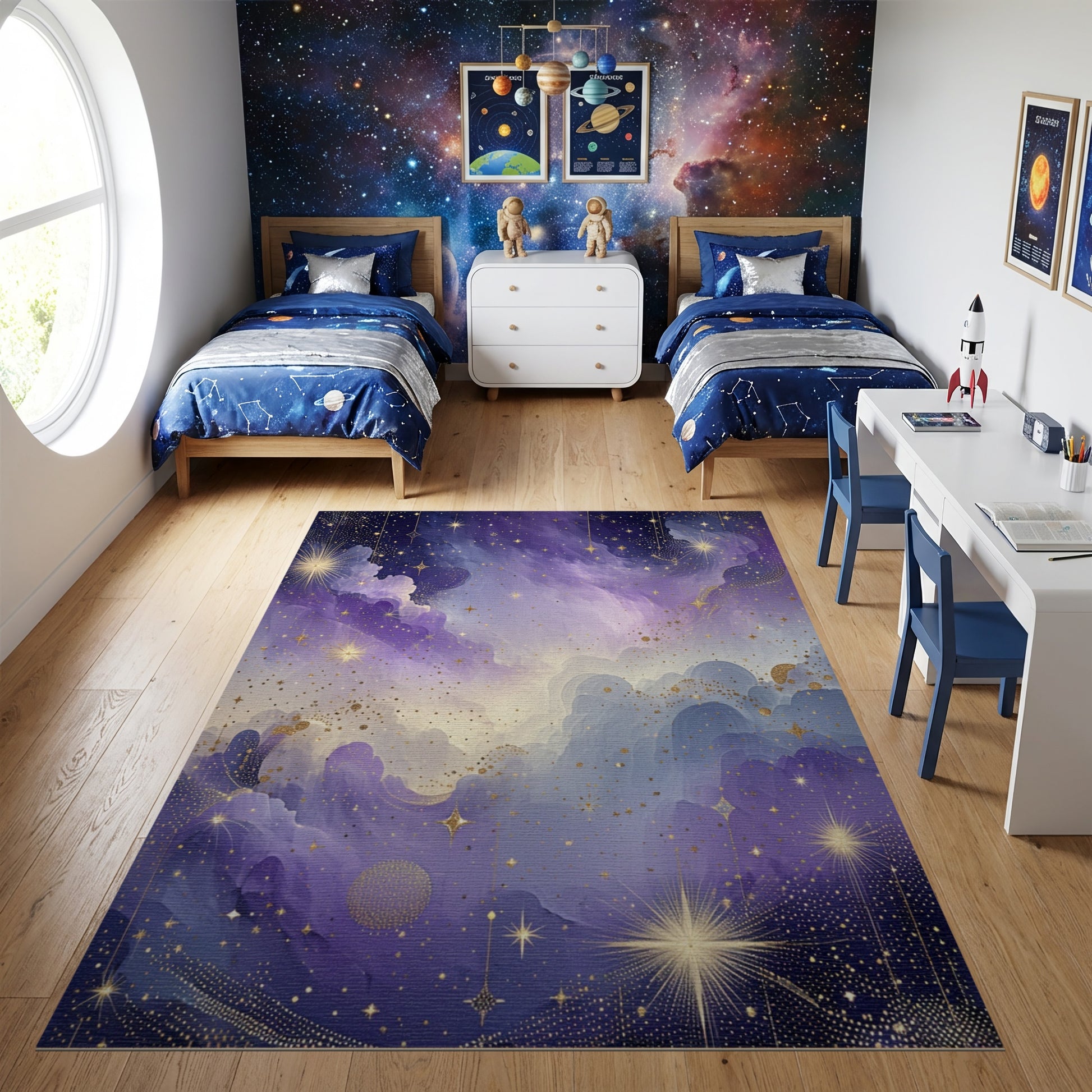 Flatwoven High Traffic Area Rug, Ethereal Starry Purple Gold Clouds Rug, Non Slip, Stain Resistant, Washable Area Rugs for Study Room, Playroom, Bedroom Overview: