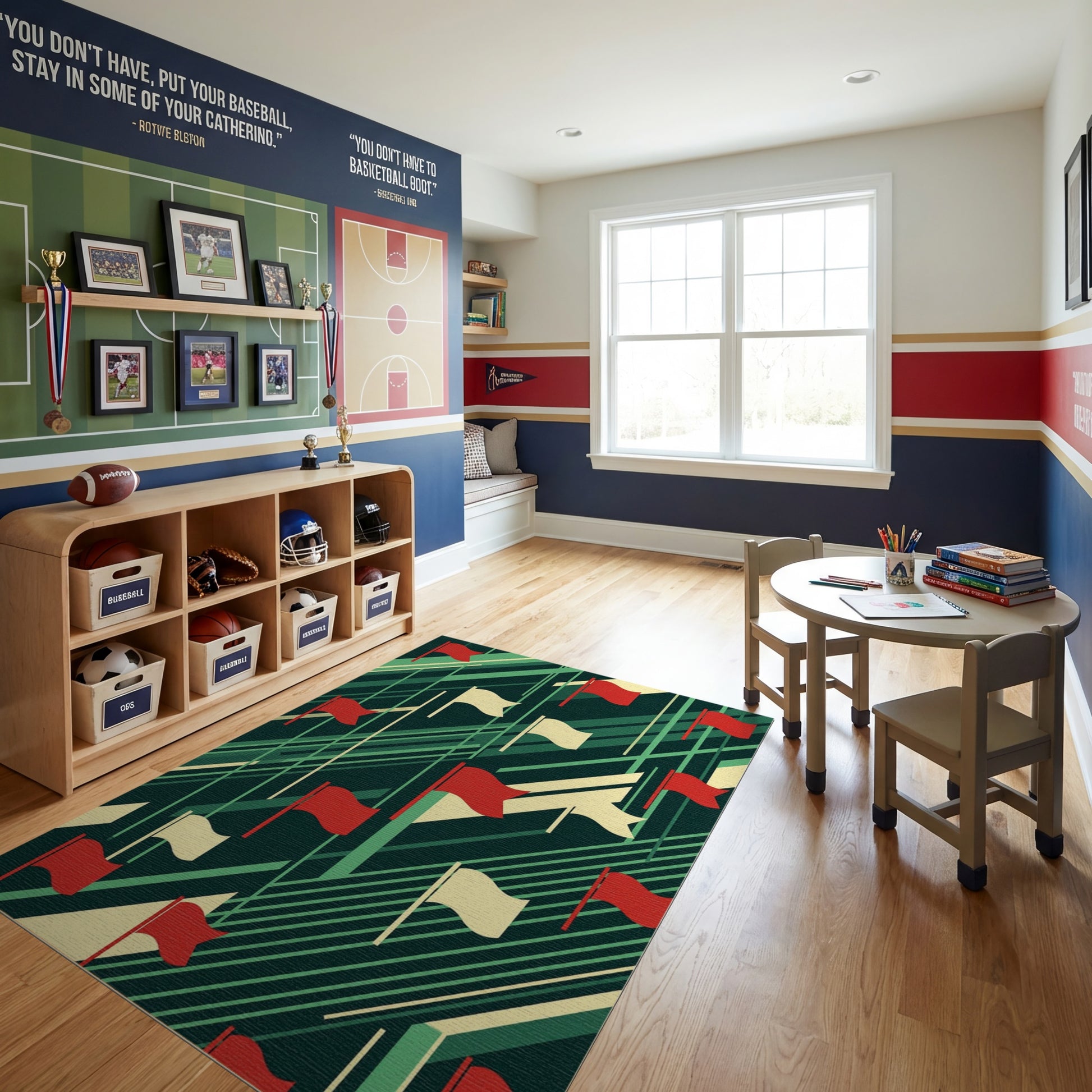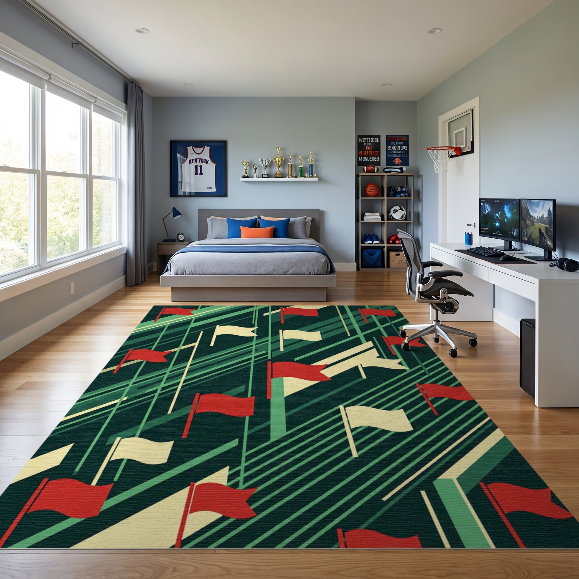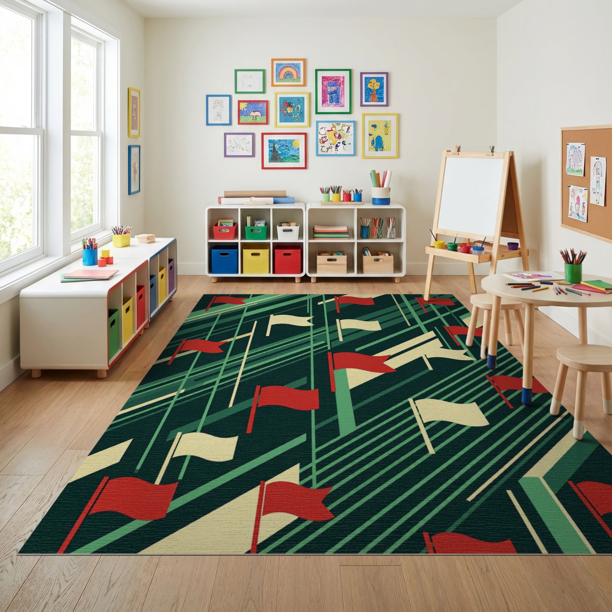 Flatwoven High Traffic Area Rug, Geometric Red White Flags Diagonal Green Rug, Non Slip, Stain Resistant, Washable Area Rugs for Study Room, Playroom, Bedroom Overview: