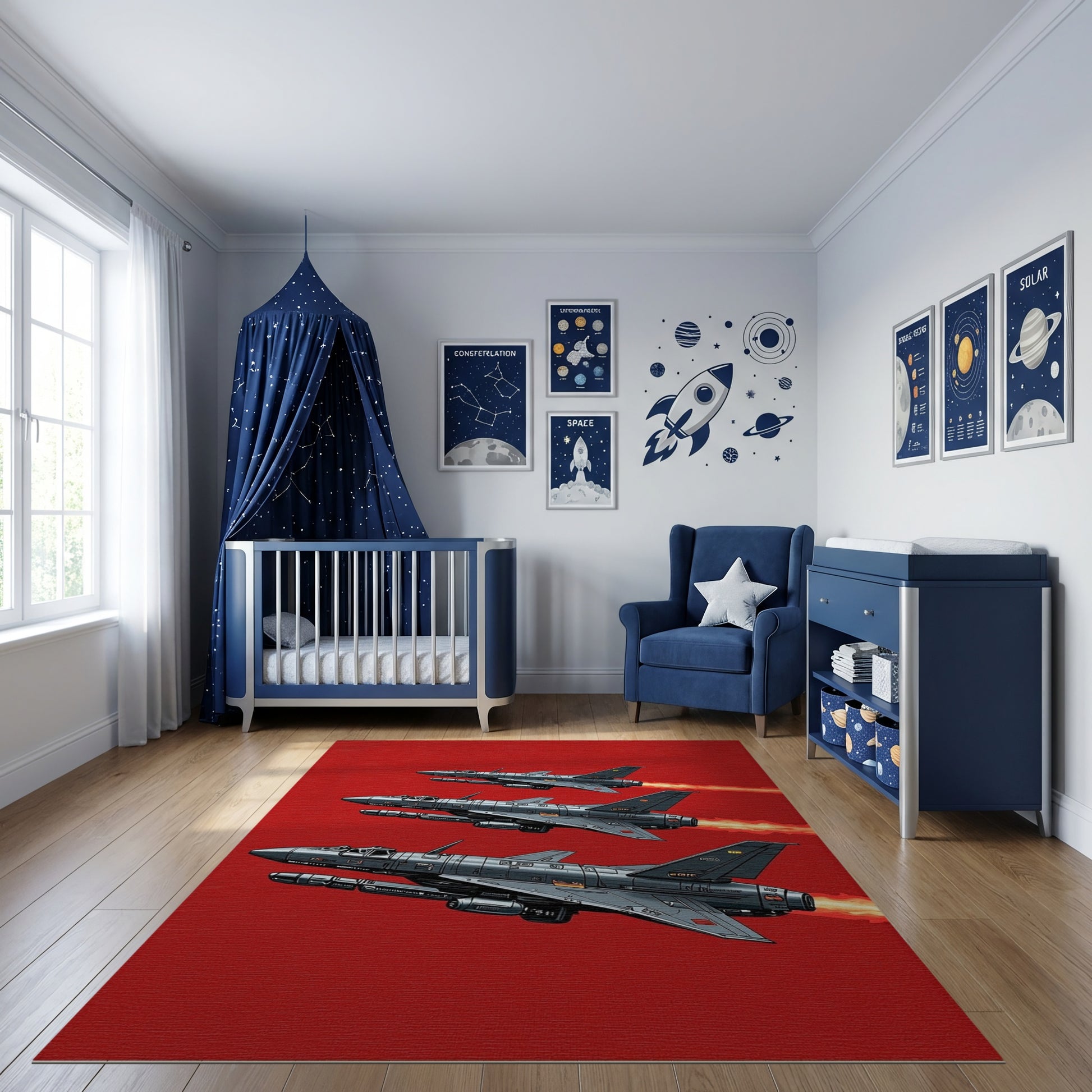 Flatwoven High Traffic Area Rug, Gray Fighter Jets Flames Formation Rug, Non Slip, Stain Resistant, Washable Area Rugs for Study Room, Playroom, Bedroom Overview:
