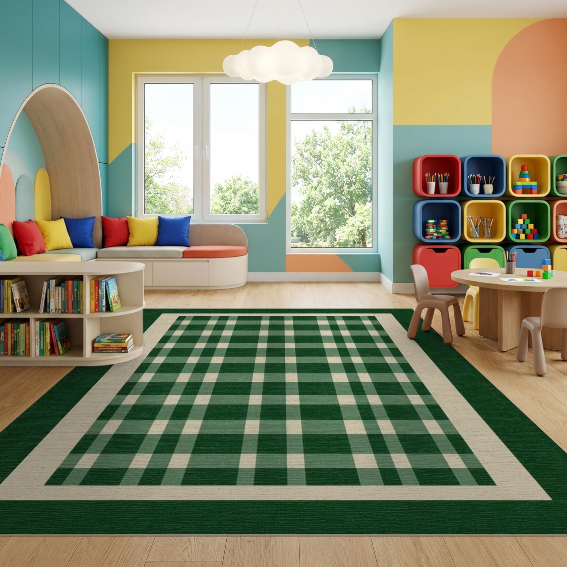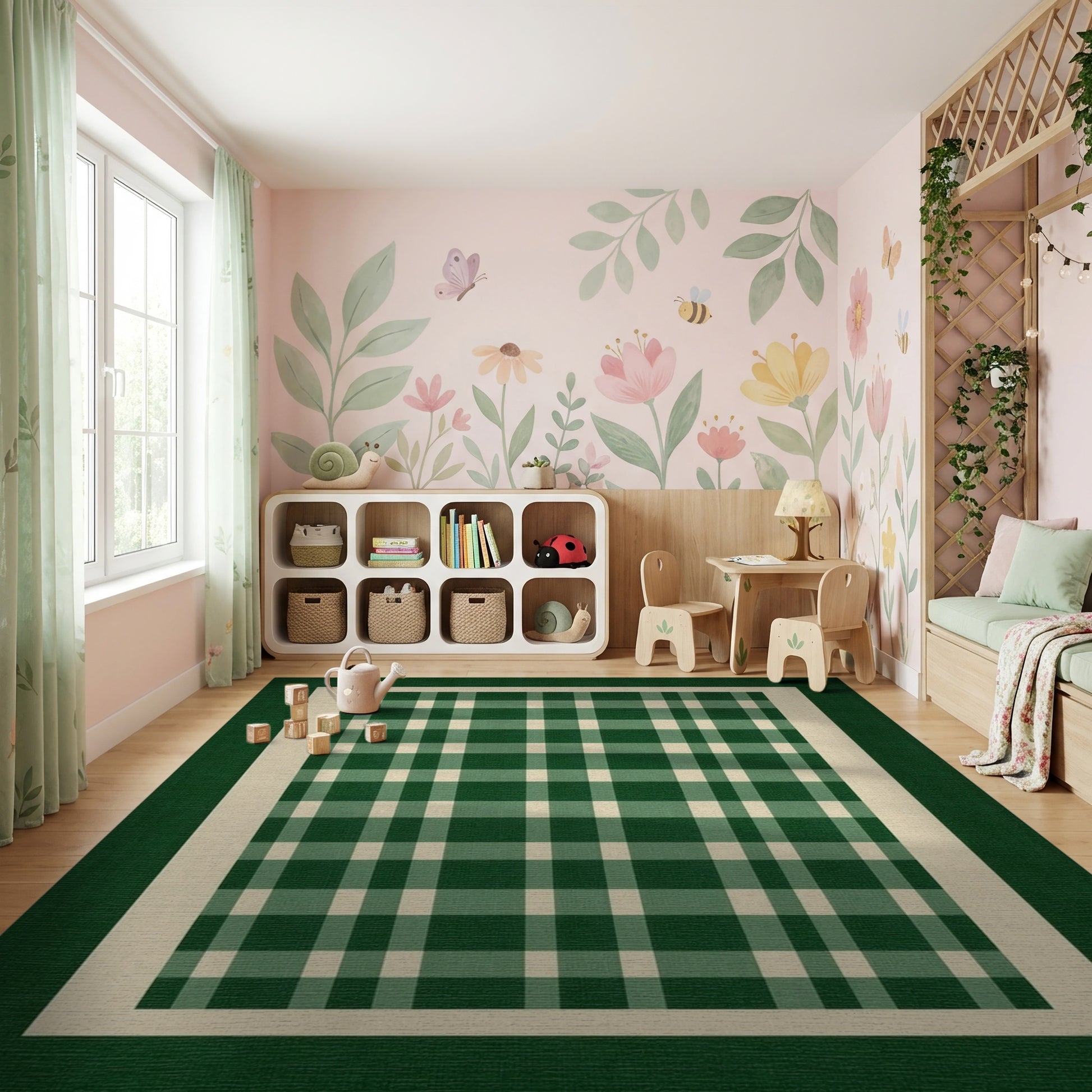 Flatwoven High Traffic Area Rug, Green and White Checkered Border Rug, Non Slip, Stain Resistant, Washable Area Rugs for Study Room, Playroom, Bedroom Overview: