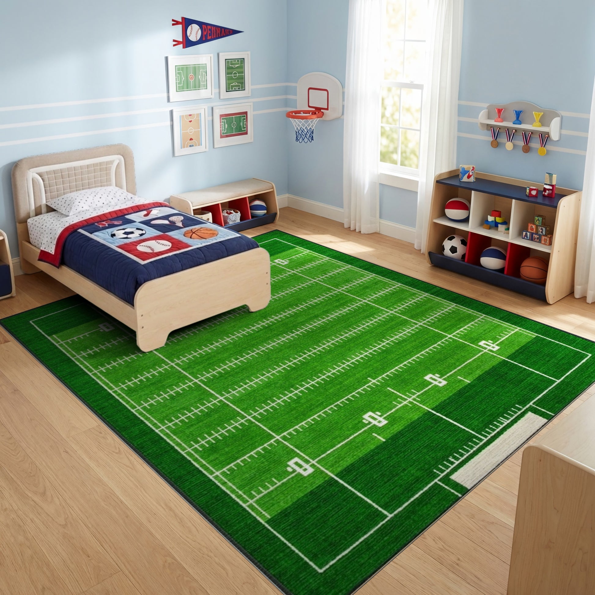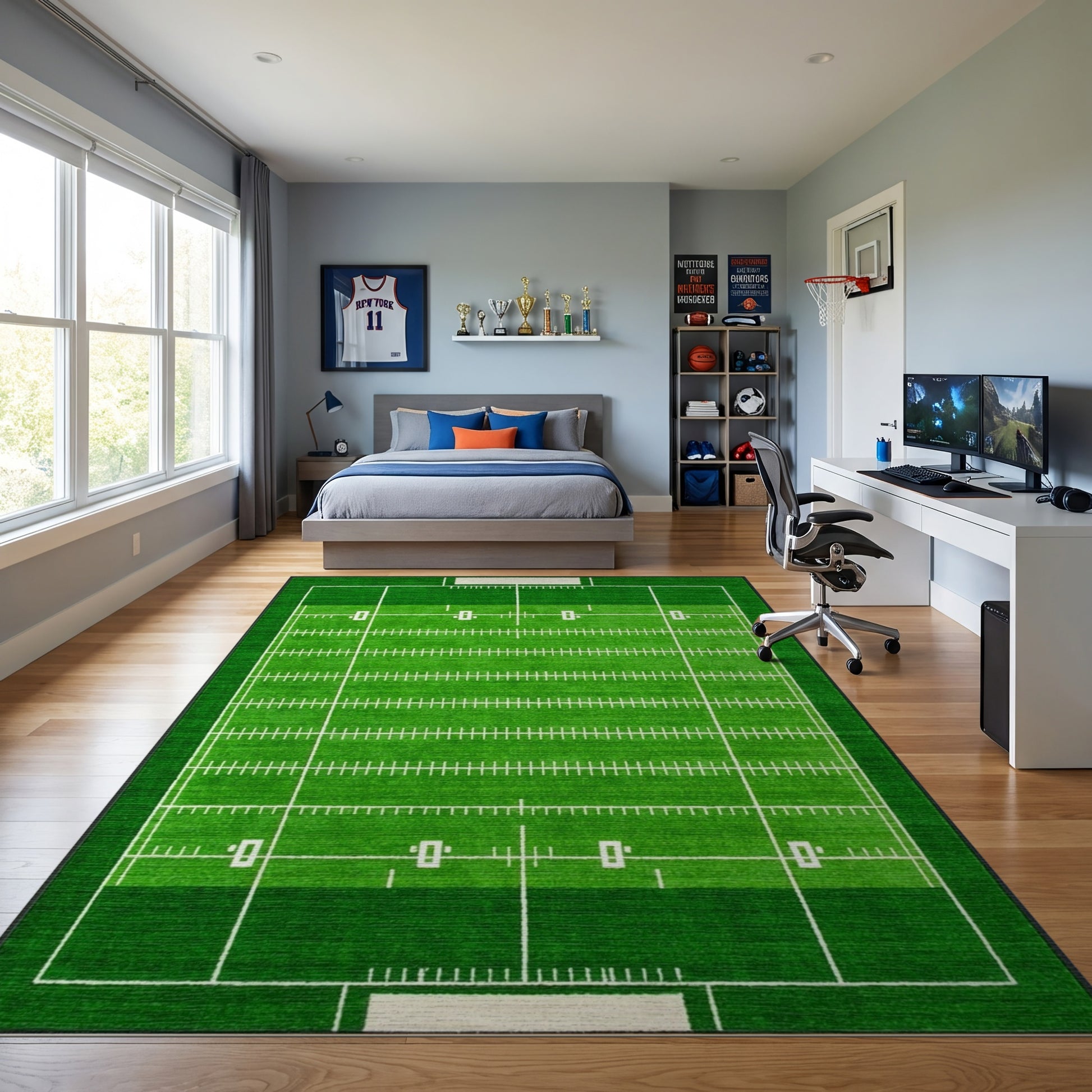 Flatwoven High Traffic Area Rug, Green Football Field Yard Lines Rug, Non Slip, Stain Resistant, Washable Area Rugs for Study Room, Playroom, Bedroom Overview: