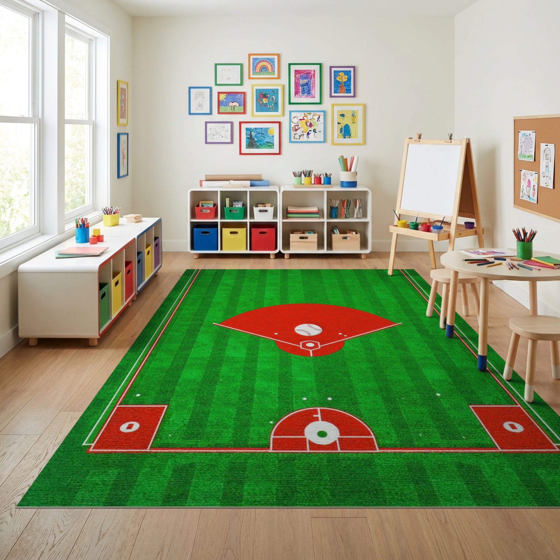 Flatwoven High Traffic Area Rug, Green Striped Baseball Diamond Field Rug, Non Slip, Stain Resistant, Washable Area Rugs for Study Room, Playroom, Bedroom Overview:
