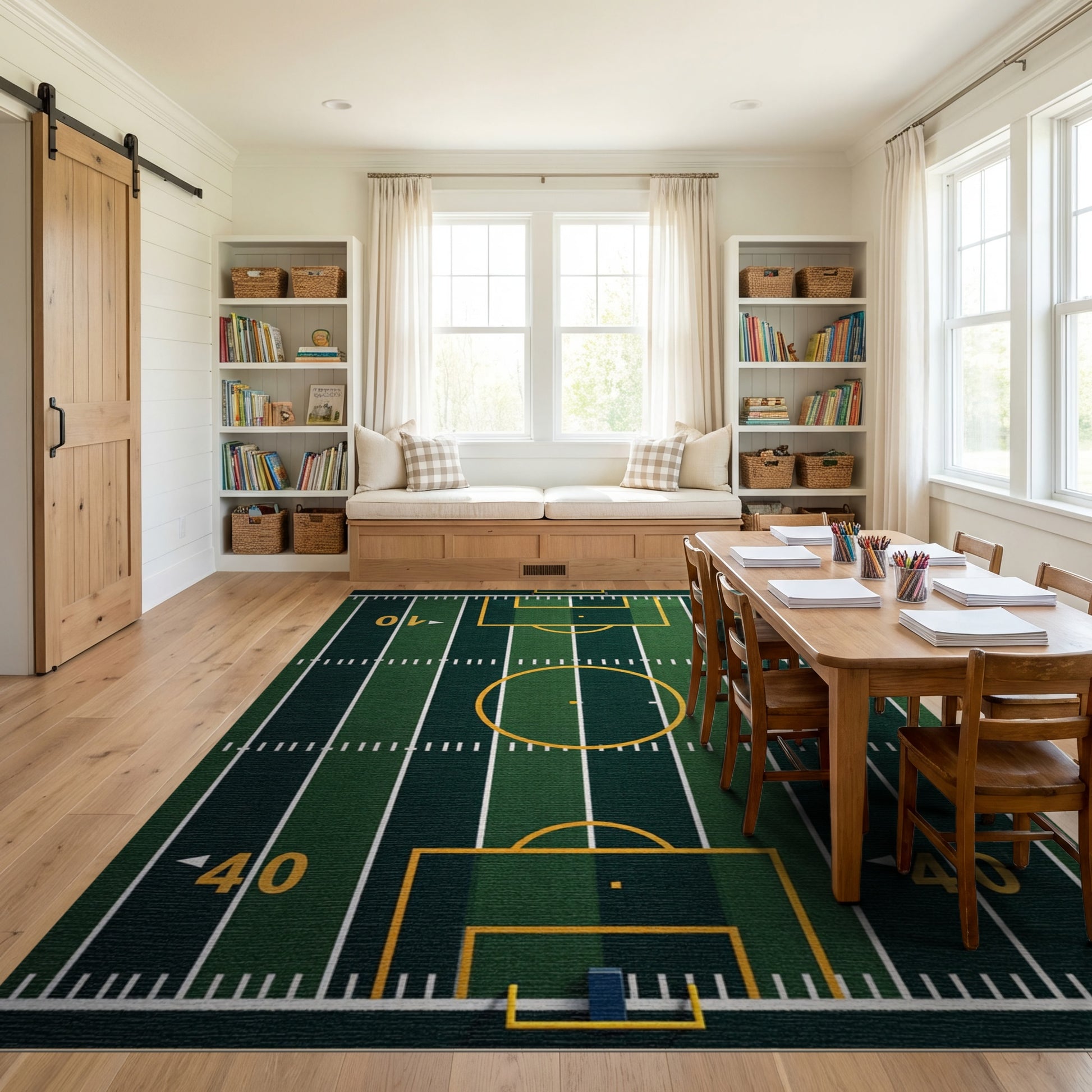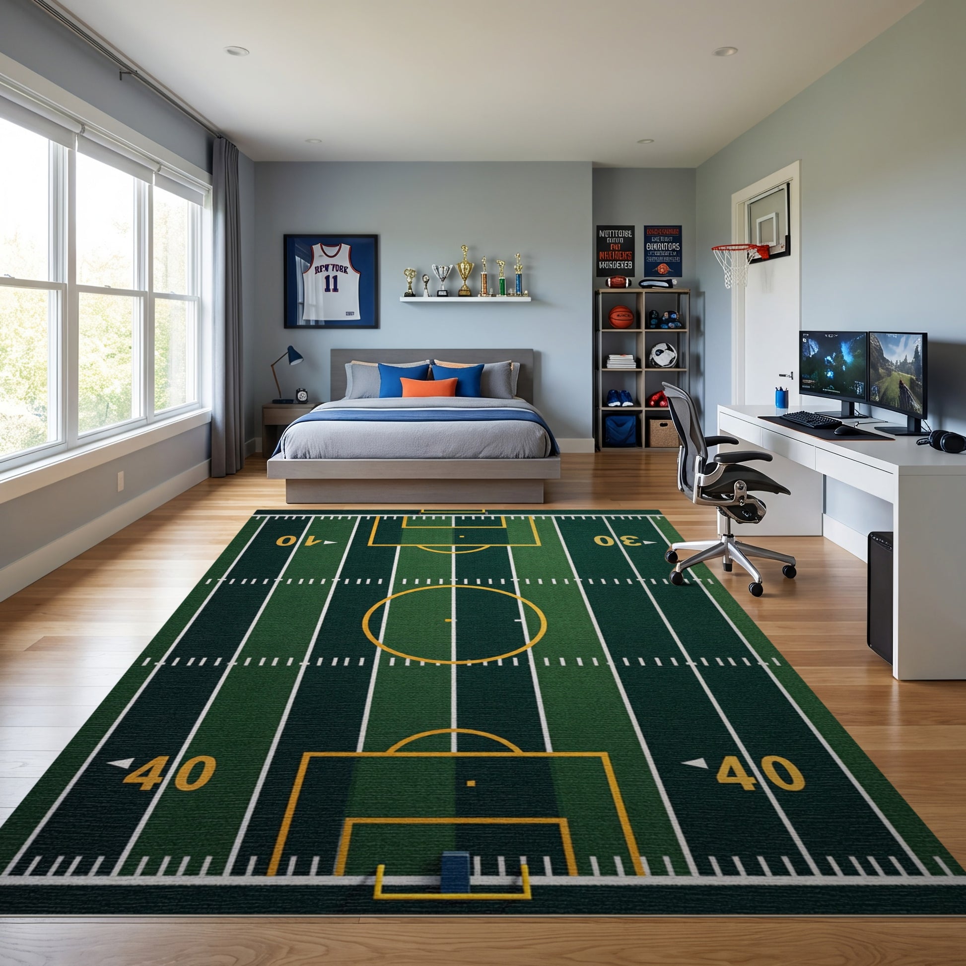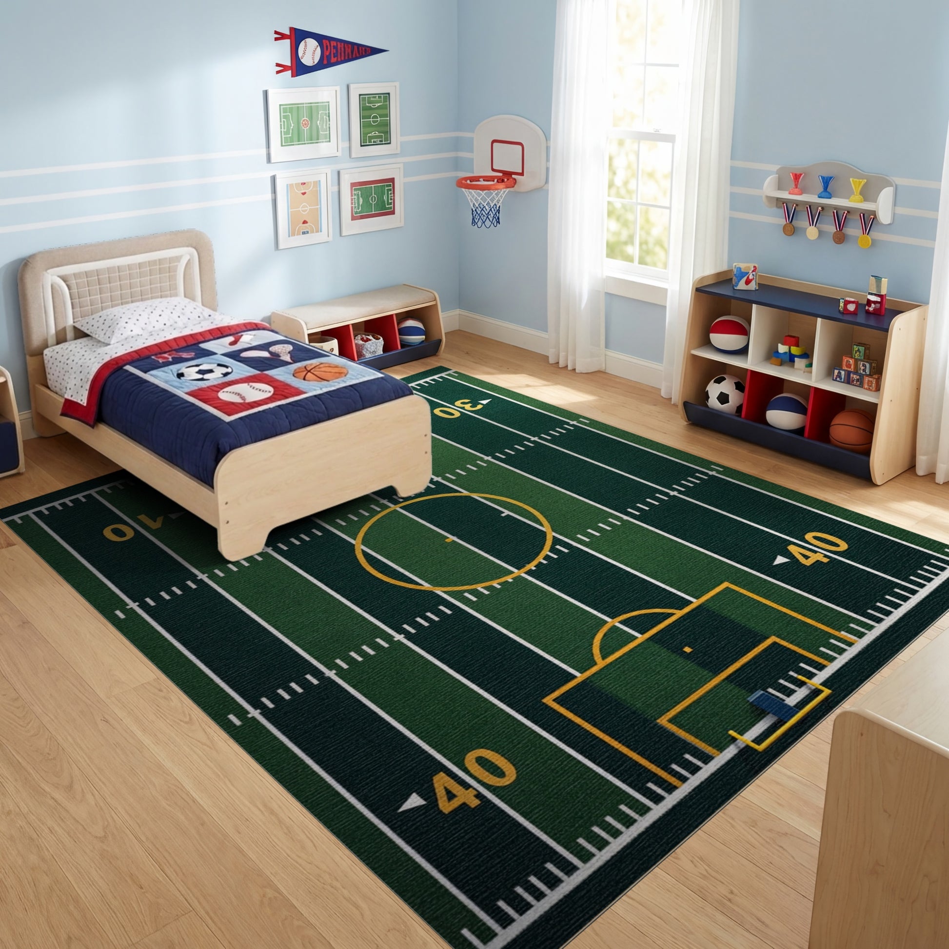 Flatwoven High Traffic Area Rug, Green Turf Soccer Field Lines Rug, Non Slip, Stain Resistant, Washable Area Rugs for Study Room, Playroom, Bedroom Overview: