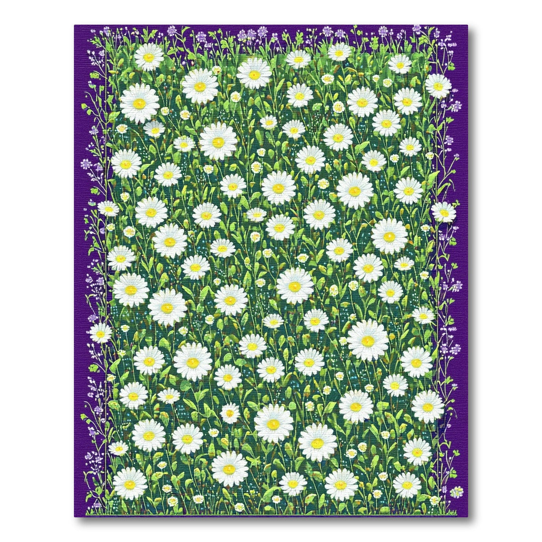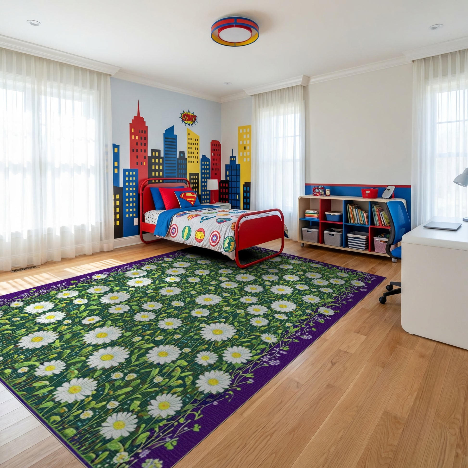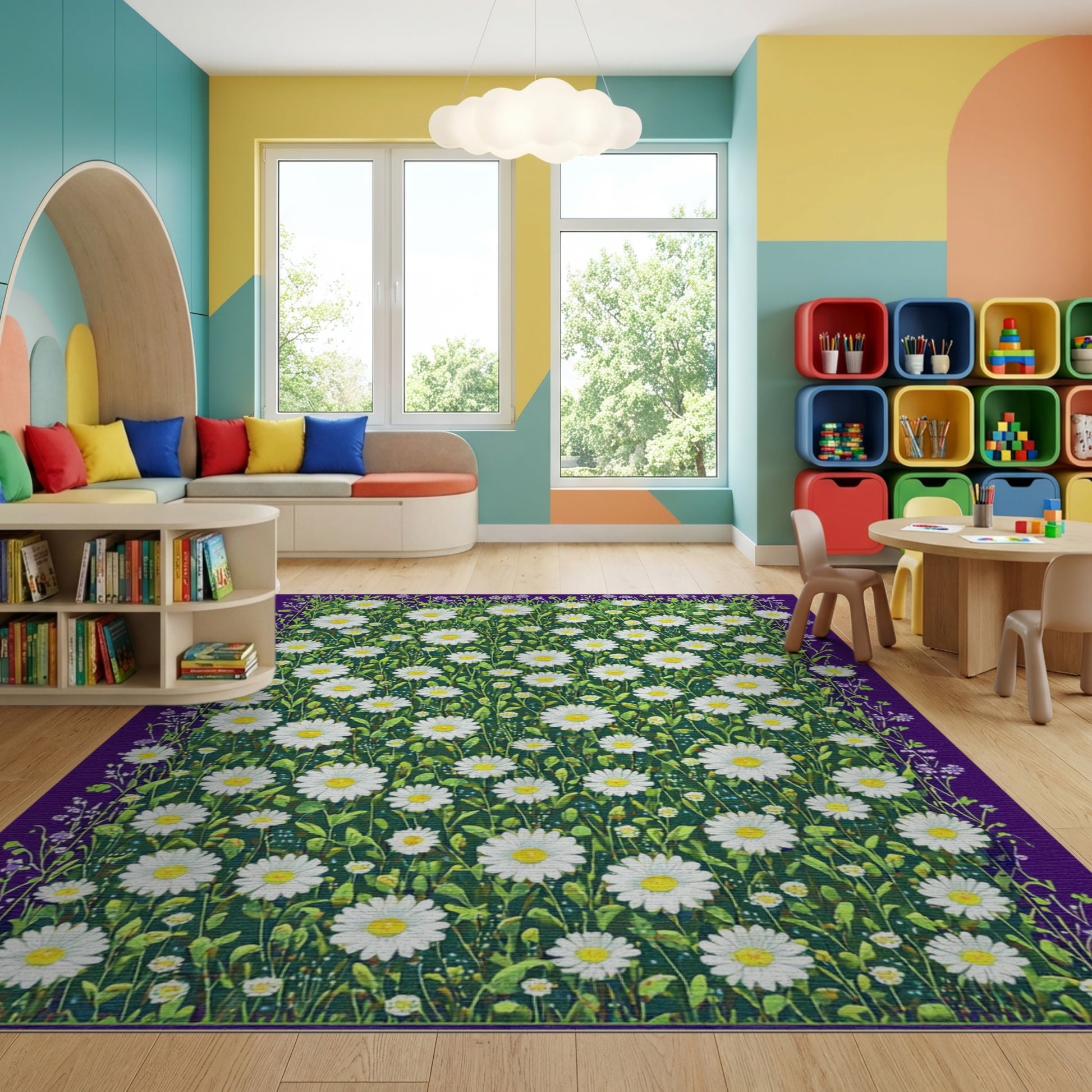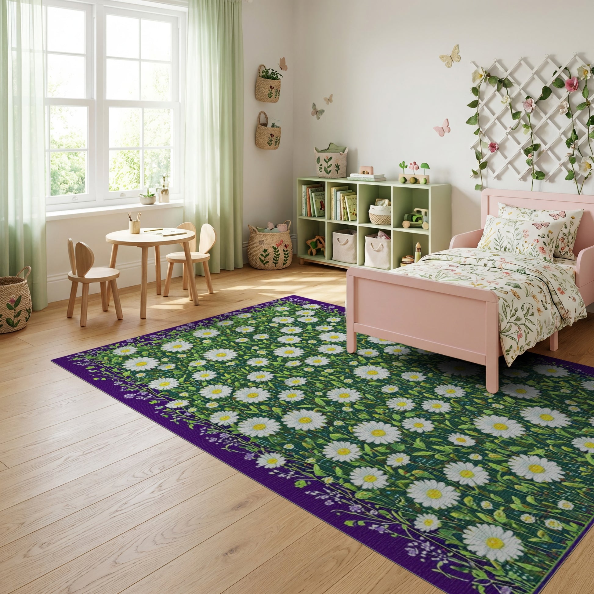 Flatwoven High Traffic Area Rug, Lush White Daisies Green Meadow Purple Rug, Non Slip, Stain Resistant, Washable Area Rugs for Study Room, Playroom, Bedroom Overview: