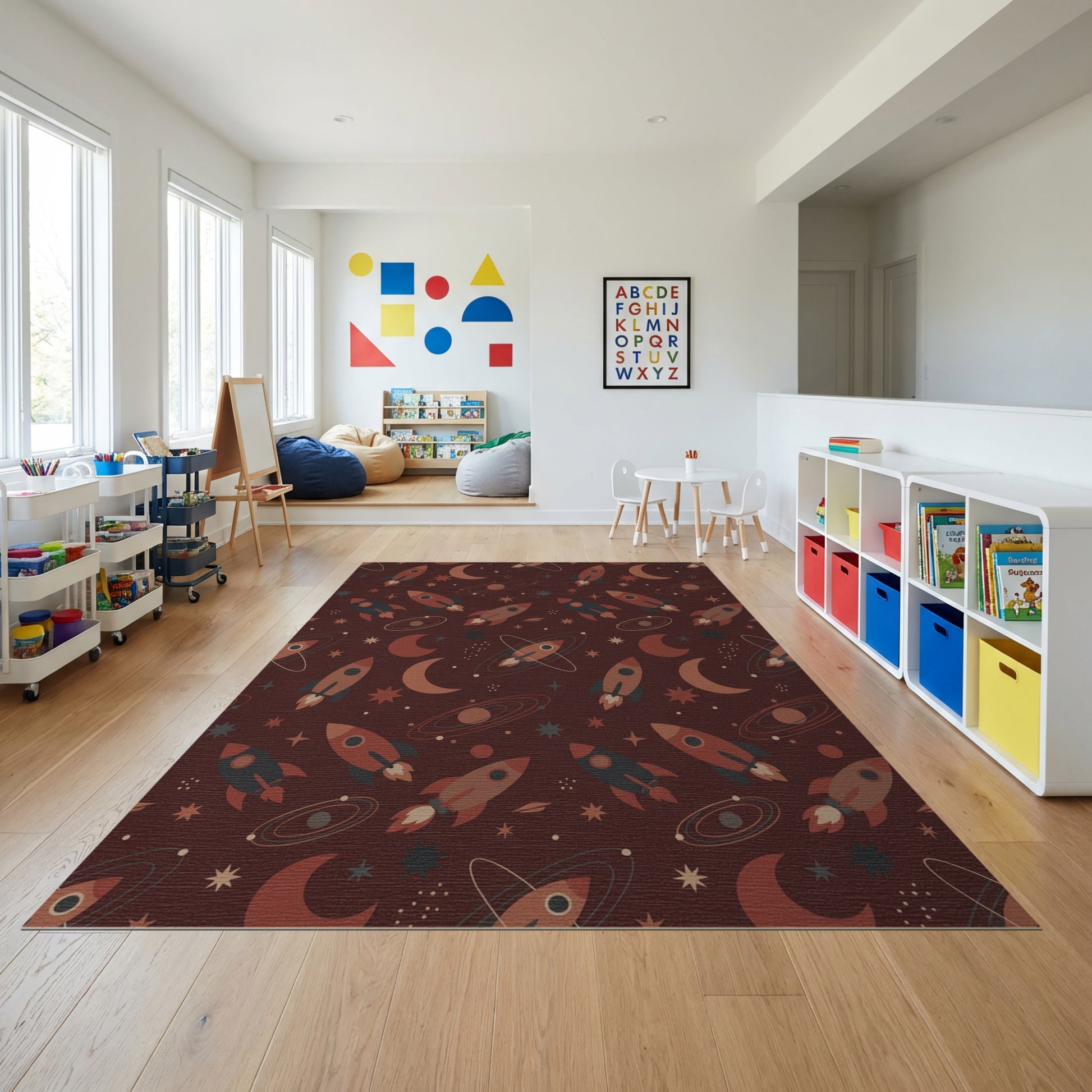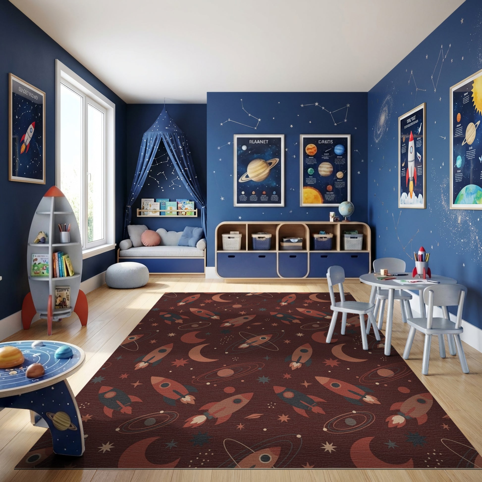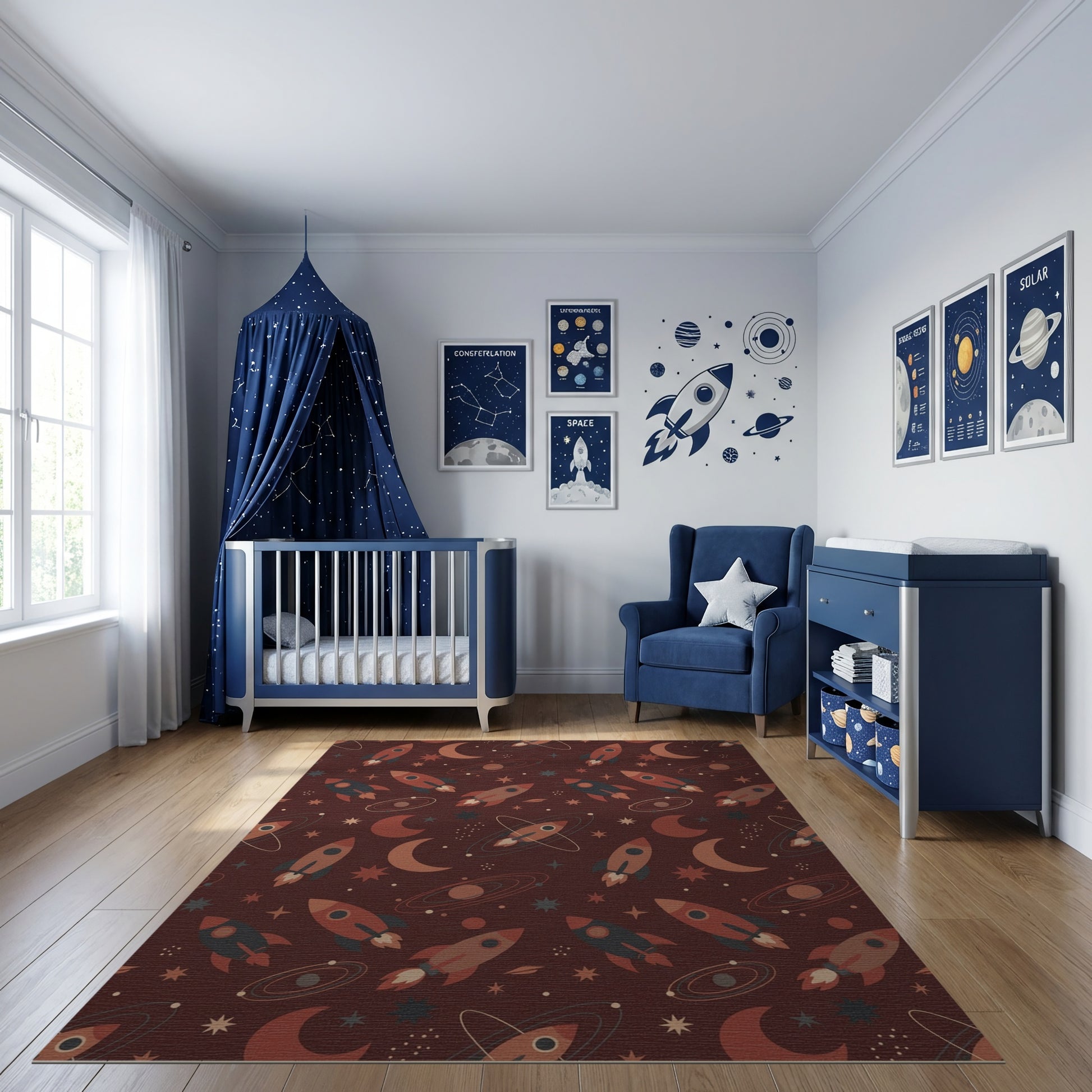 Flatwoven High Traffic Area Rug, Maroon Cosmic Rocket Moon Star Rug, Non Slip, Stain Resistant, Washable Area Rugs for Study Room, Playroom, Bedroom Overview:
