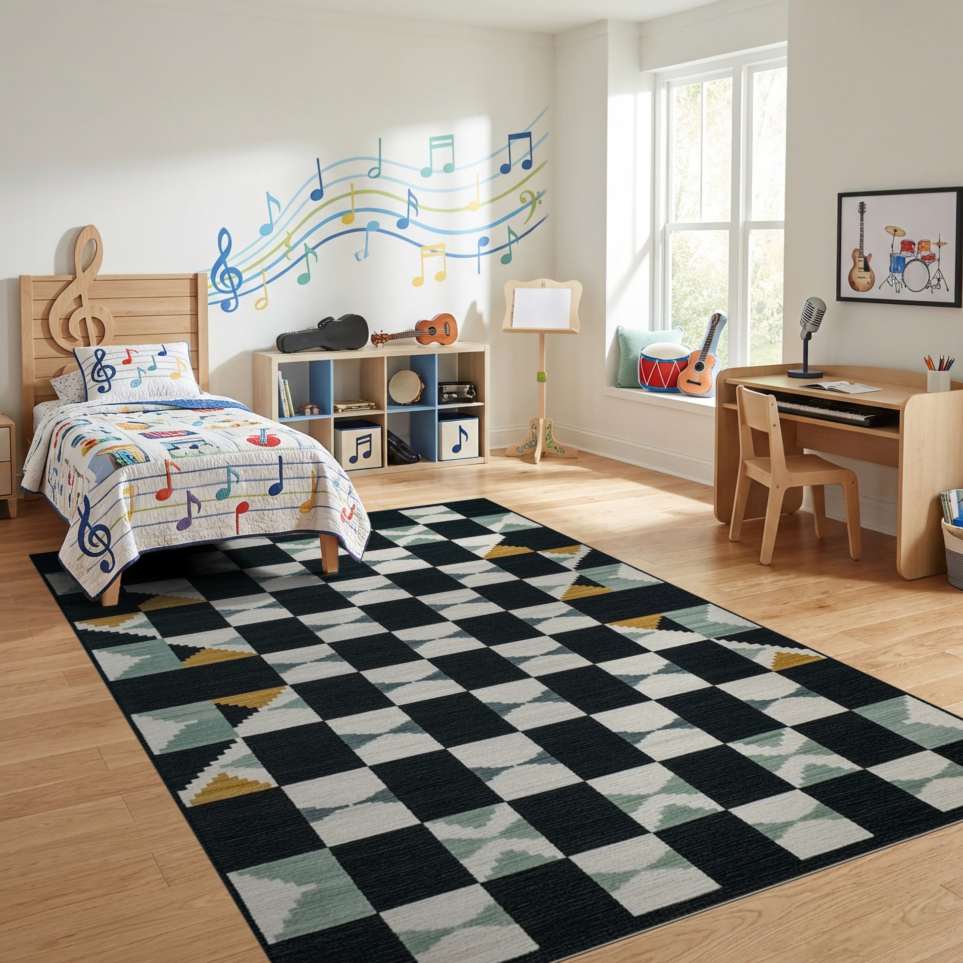 Flatwoven High Traffic Area Rug, Modern Black Teal Geometric Diamond Rug, Non Slip, Stain Resistant, Washable Area Rugs for Study Room, Playroom, Bedroom Overview: