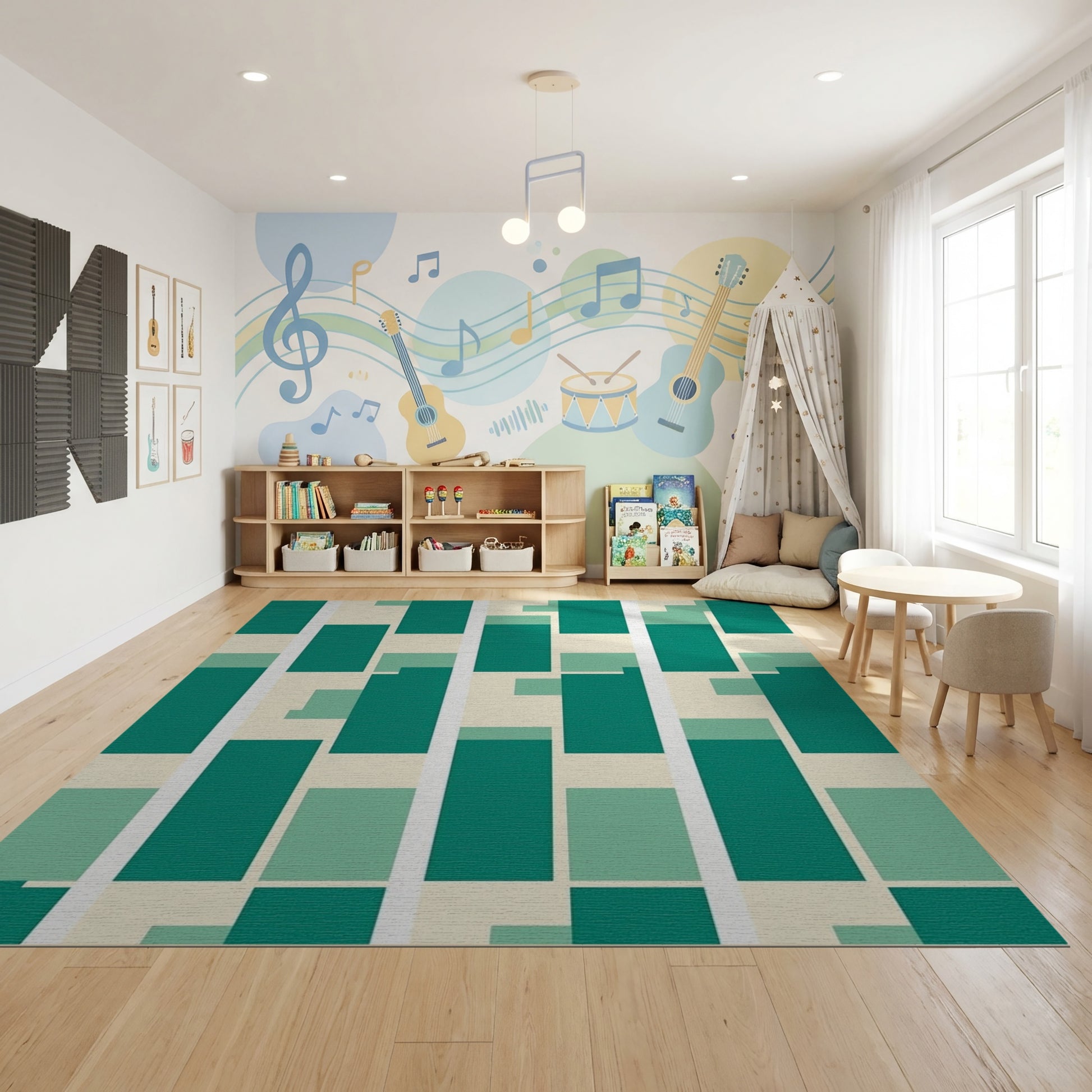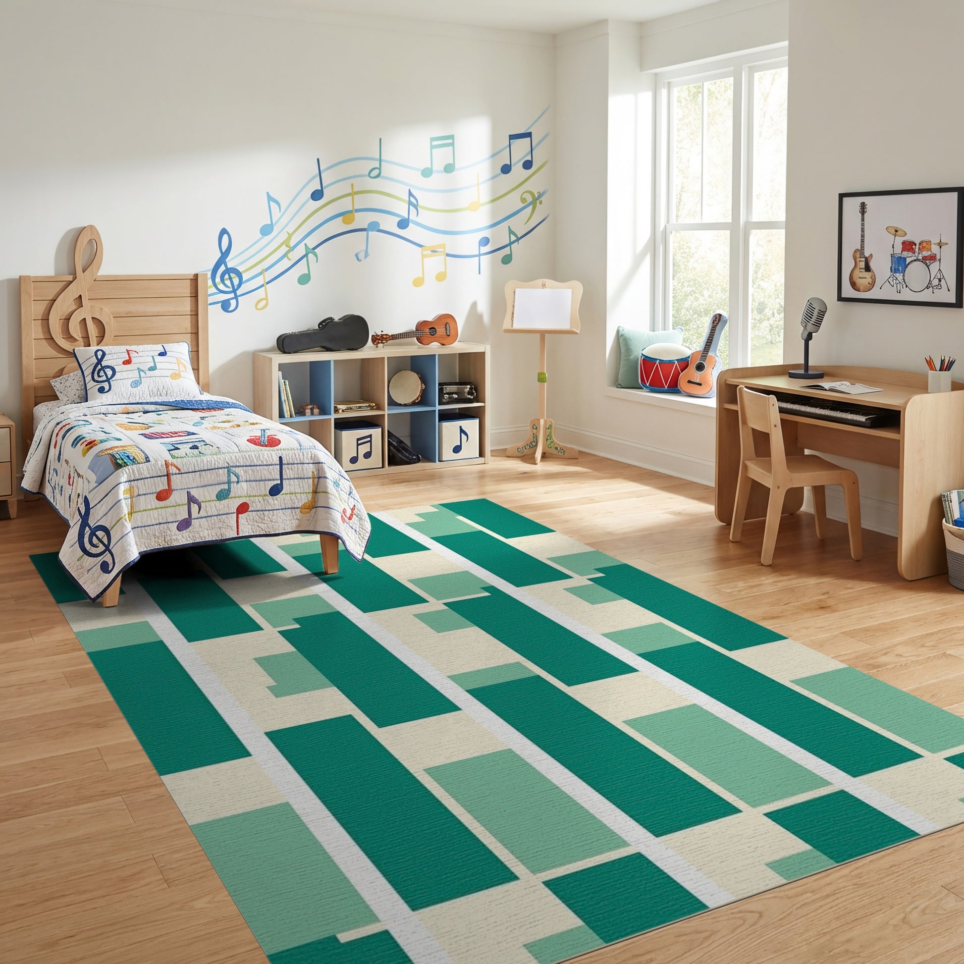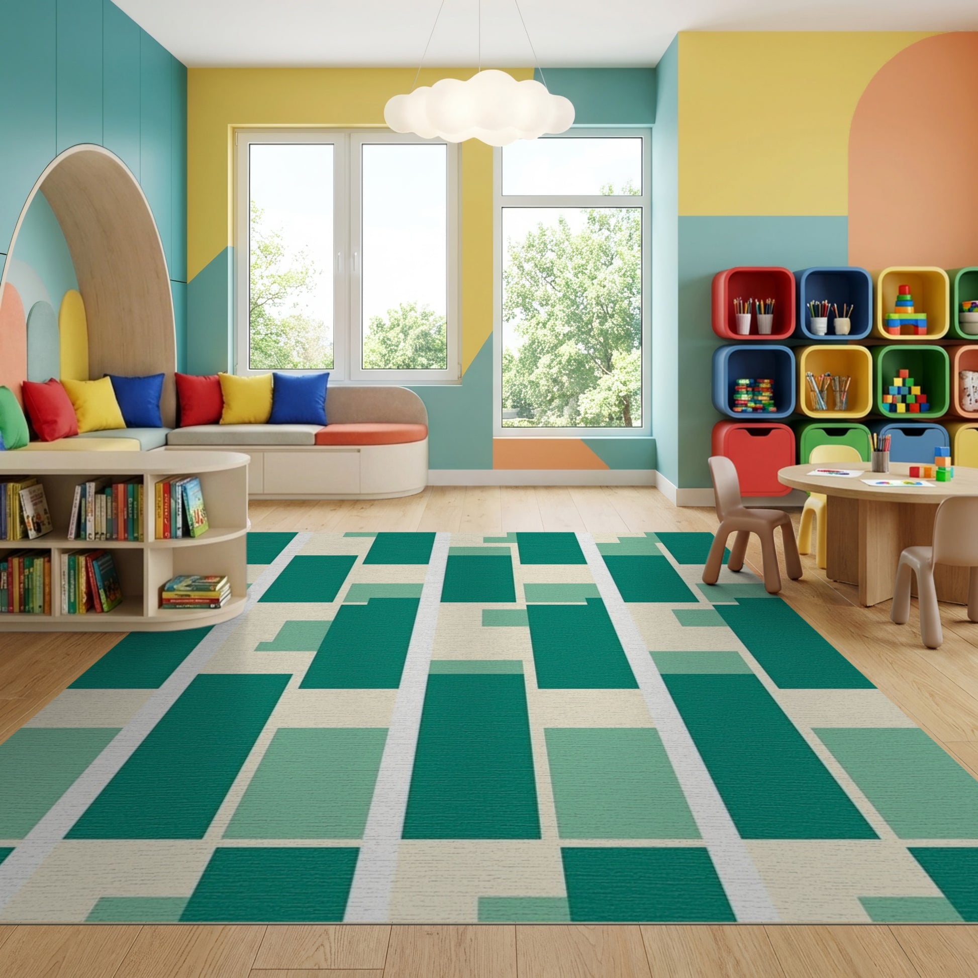 Flatwoven High Traffic Area Rug, Modern Green Cream Block Stack Rug, Non Slip, Stain Resistant, Washable Area Rugs for Study Room, Playroom, Bedroom Overview: