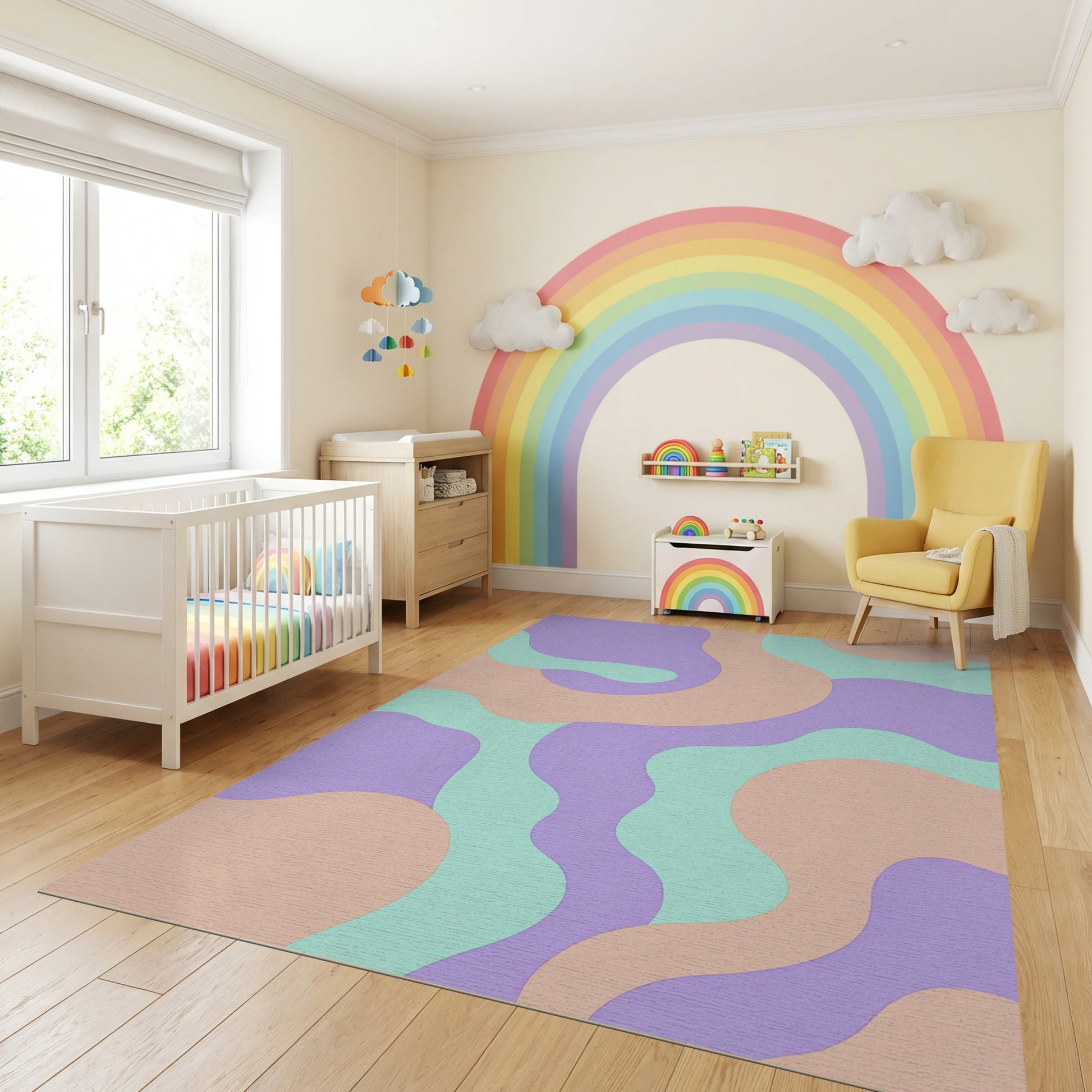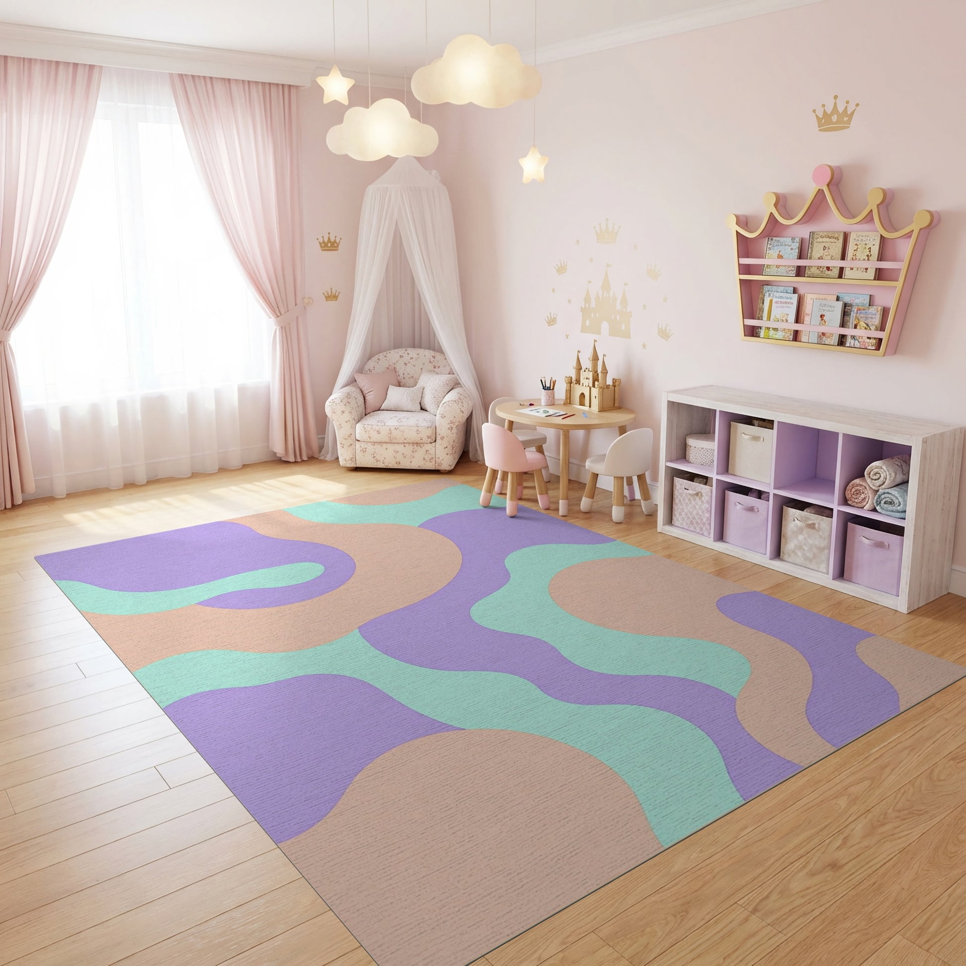 Flatwoven High Traffic Area Rug, Modern Lavender Peach Mint Wavy Rug, Non Slip, Stain Resistant, Washable Area Rugs for Study Room, Playroom, Bedroom Overview:
