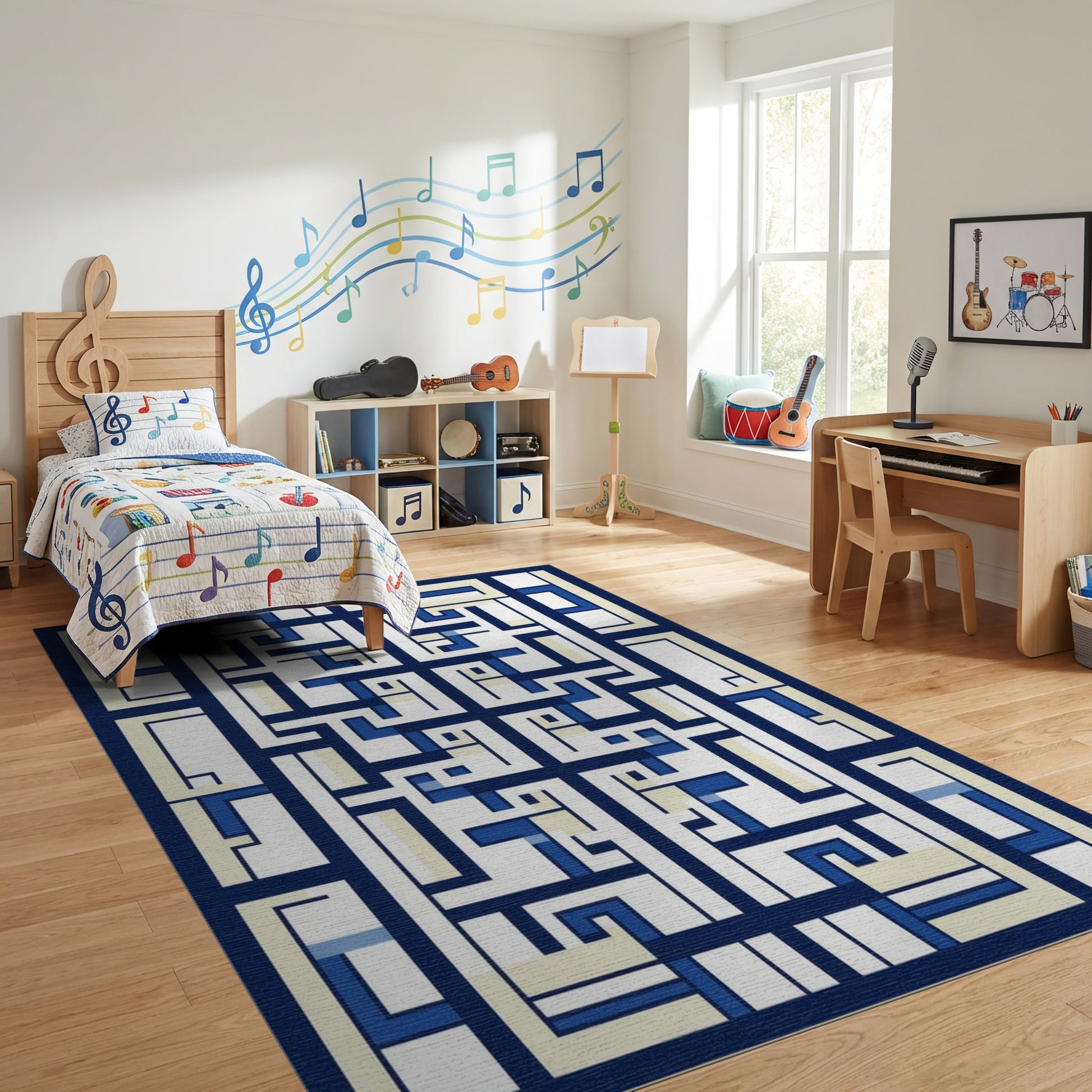 Flatwoven High Traffic Area Rug, Modern Navy and Cream Lattice Rug, Non Slip, Stain Resistant, Washable Area Rugs for Study Room, Playroom, Bedroom Overview: