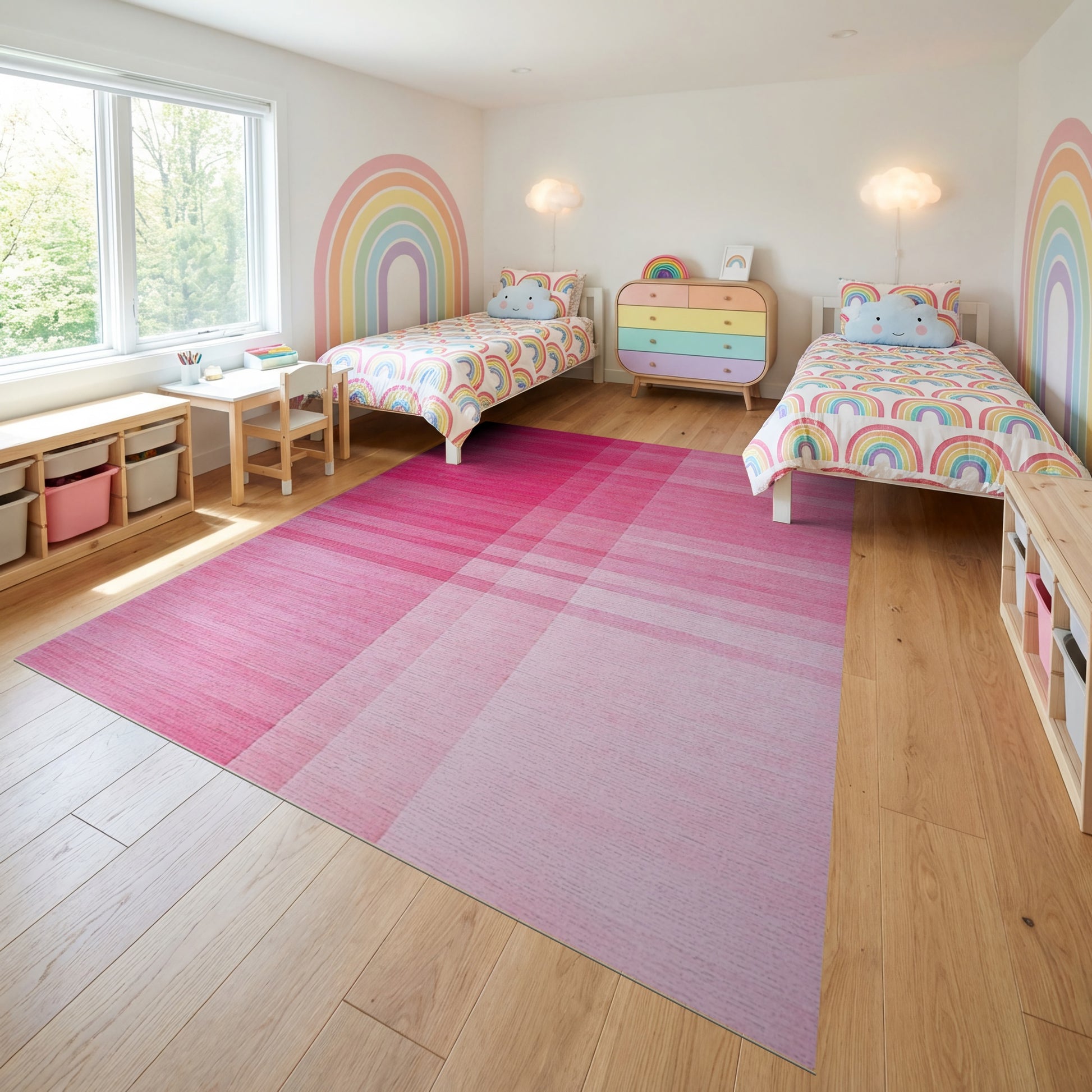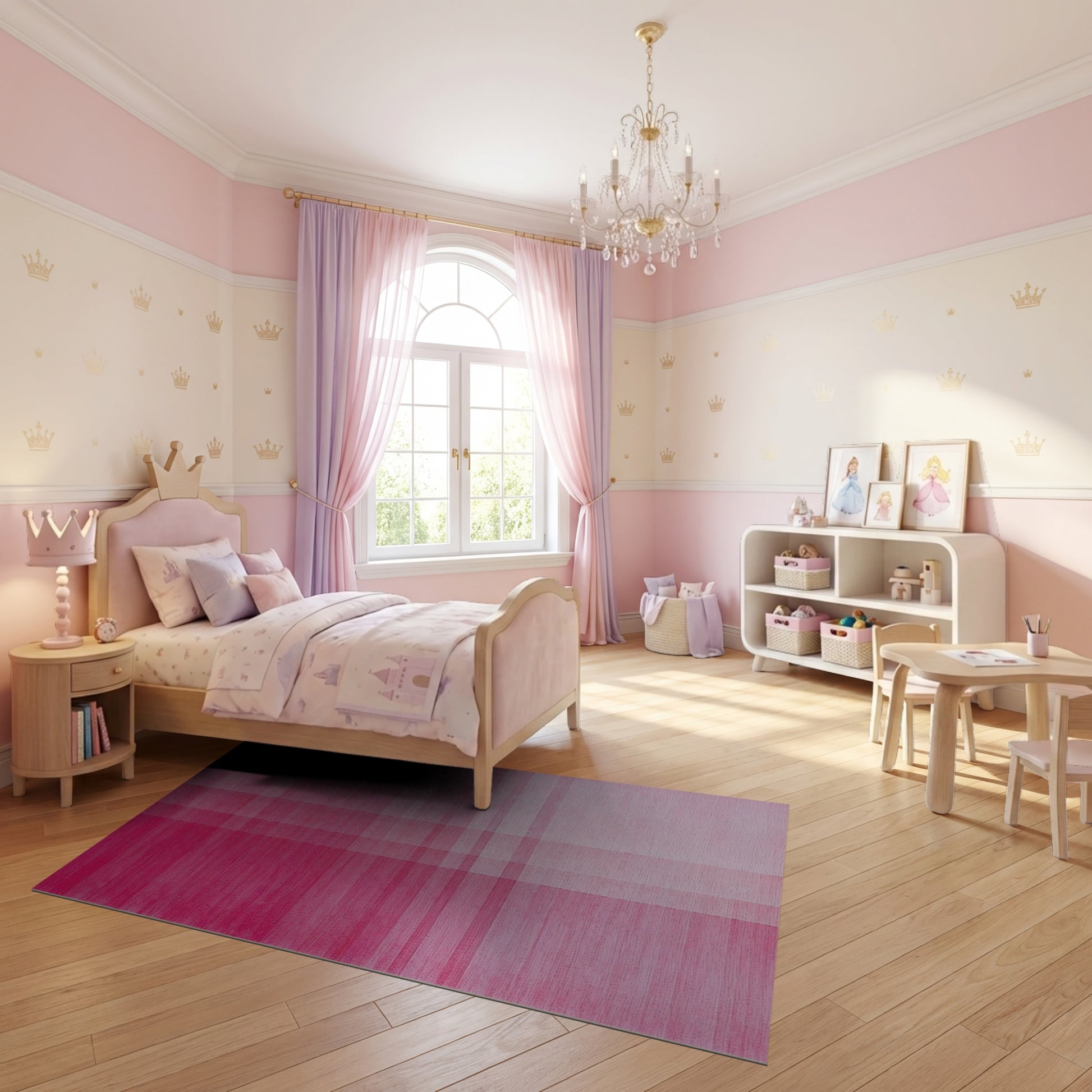 Flatwoven High Traffic Area Rug, Modern Pink Gradient Plaid Rug, Non Slip, Stain Resistant, Washable Area Rugs for Study Room, Playroom, Bedroom Overview: