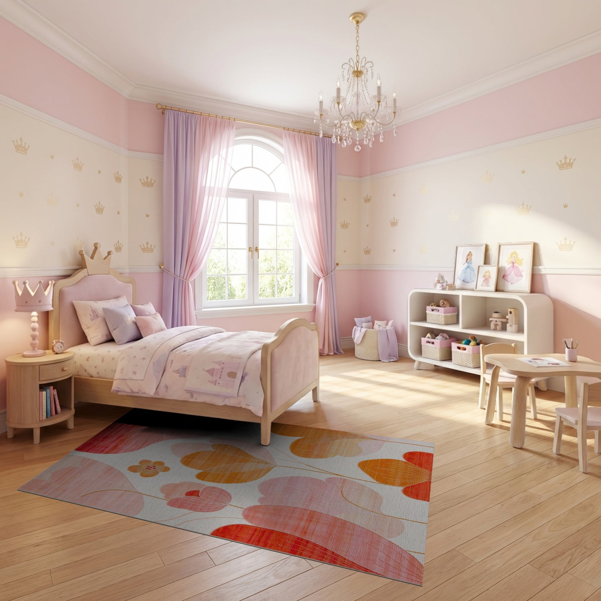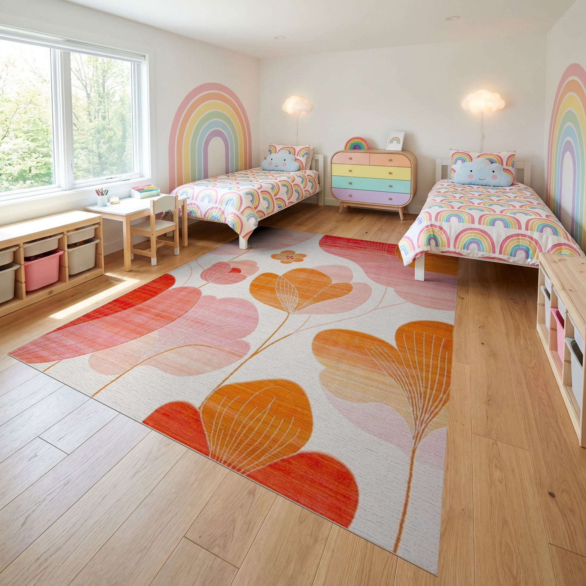 Flatwoven High Traffic Area Rug, Modern Pink Orange Abstract Petals Rug, Non Slip, Stain Resistant, Washable Area Rugs for Study Room, Playroom, Bedroom Overview: