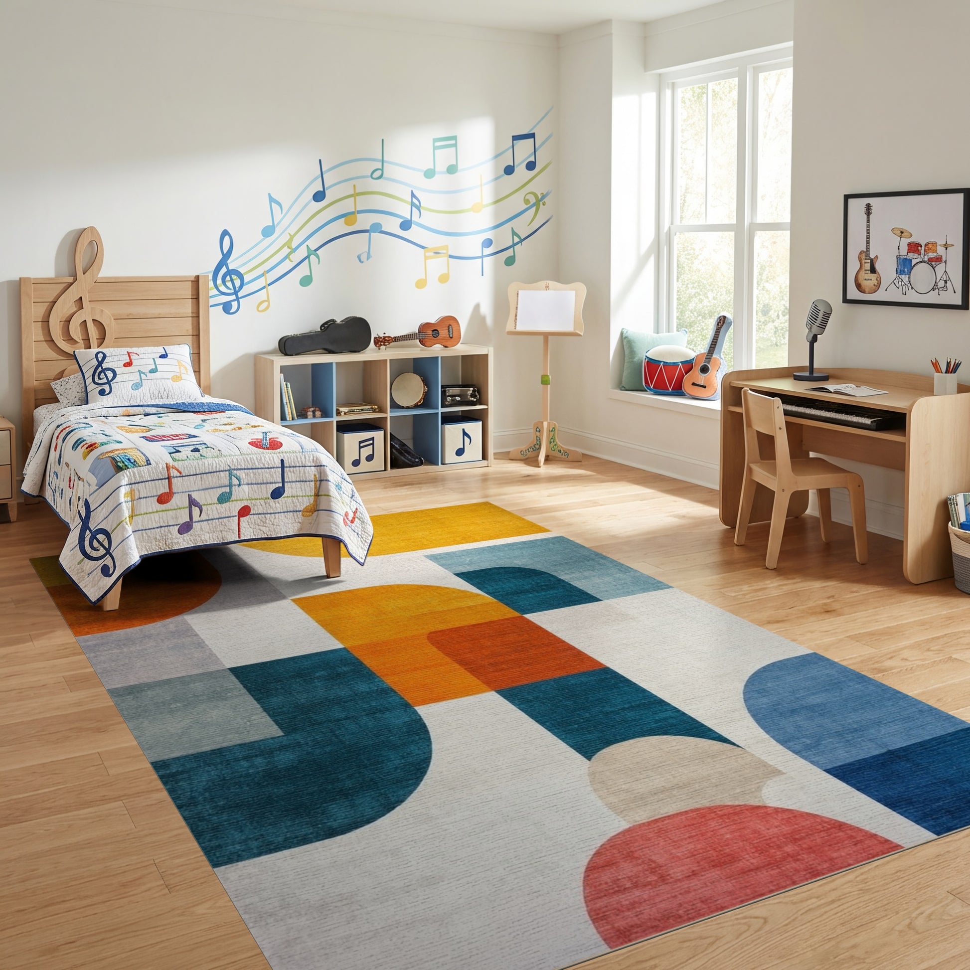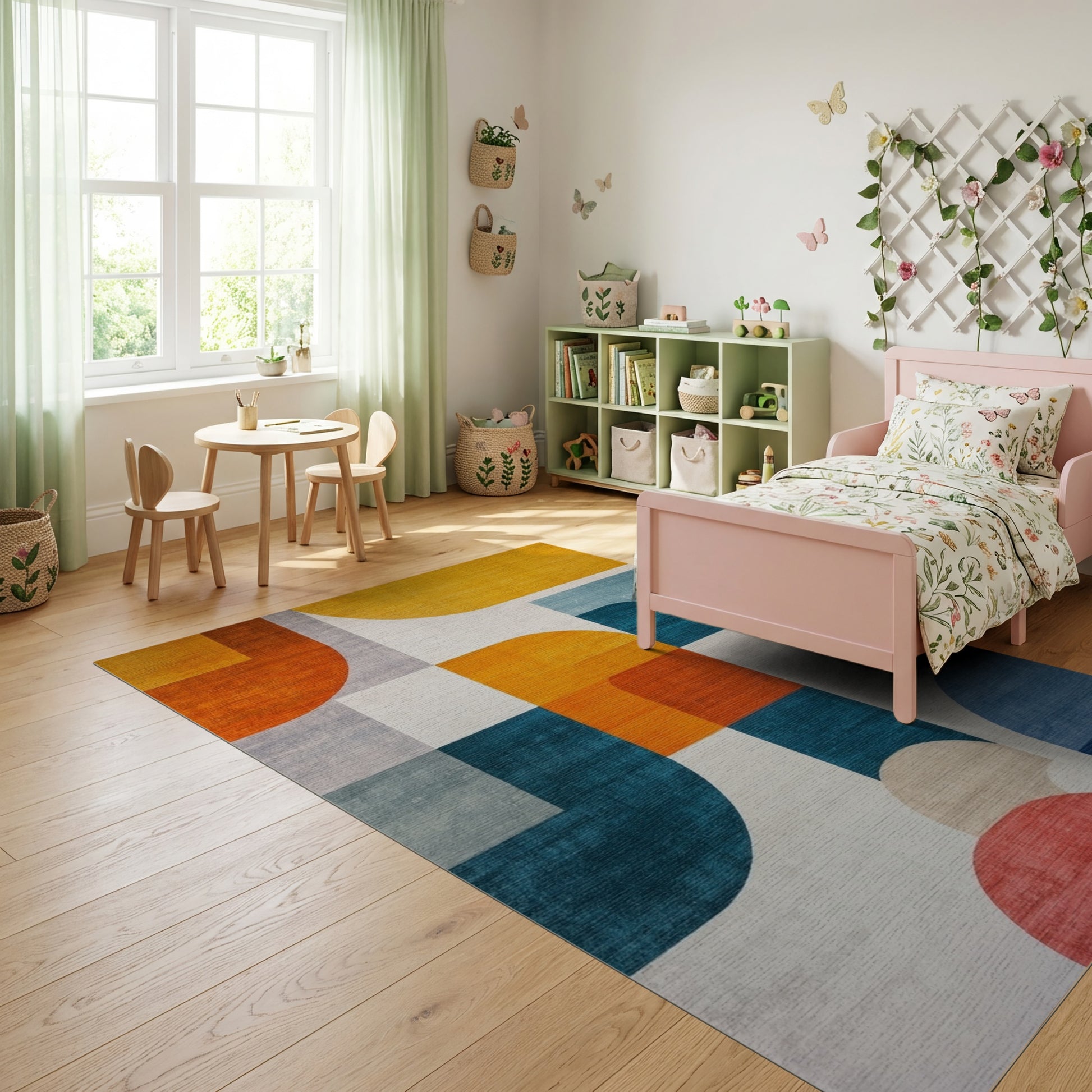 Flatwoven High Traffic Area Rug, Modern Teal Orange Geometric Abstract Rug, Non Slip, Stain Resistant, Washable Area Rugs for Study Room, Playroom, Bedroom Overview: