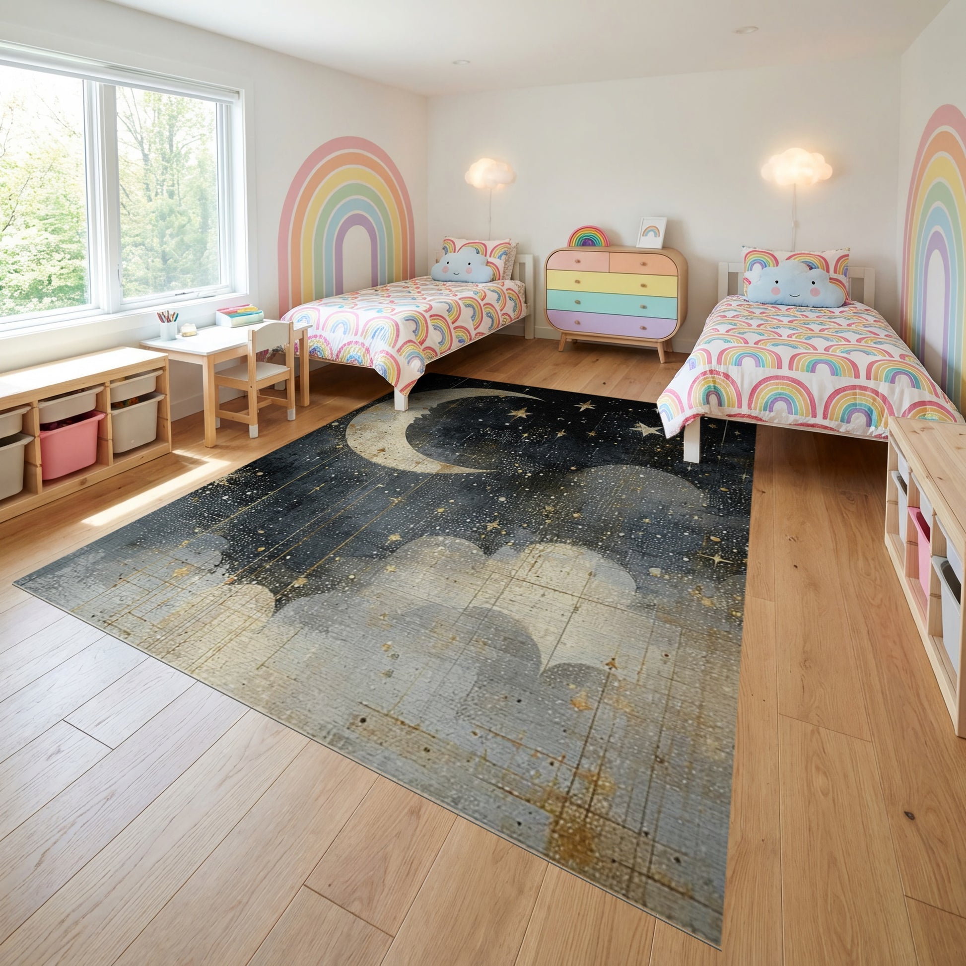 Flatwoven High Traffic Area Rug, Mystical Golden Moon Stars Clouds Rug, Non Slip, Stain Resistant, Washable Area Rugs for Study Room, Playroom, Bedroom Overview: