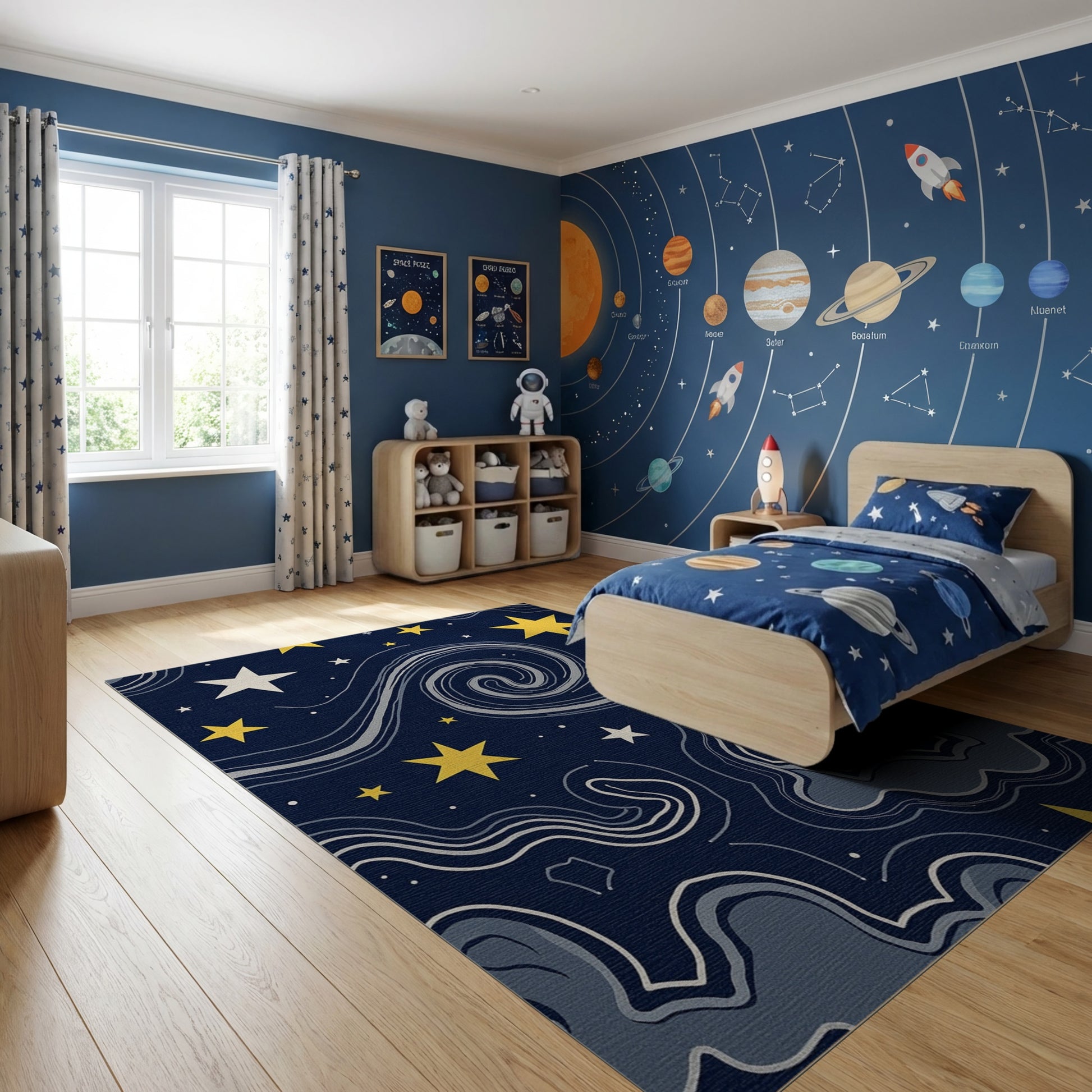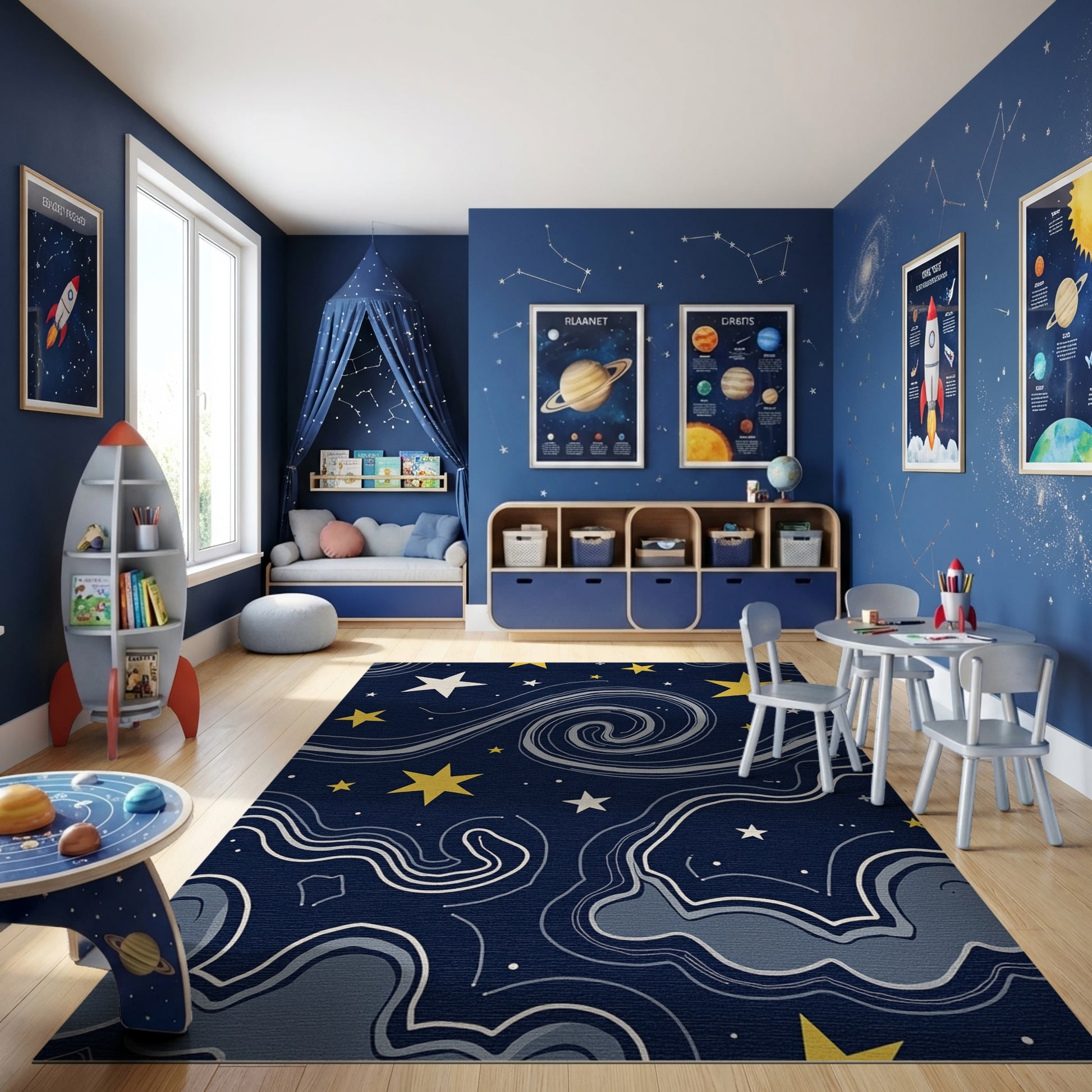 Flatwoven High Traffic Area Rug, Navy Cosmic Swirling Stars Rug, Non Slip, Stain Resistant, Washable Area Rugs for Study Room, Playroom, Bedroom Overview: