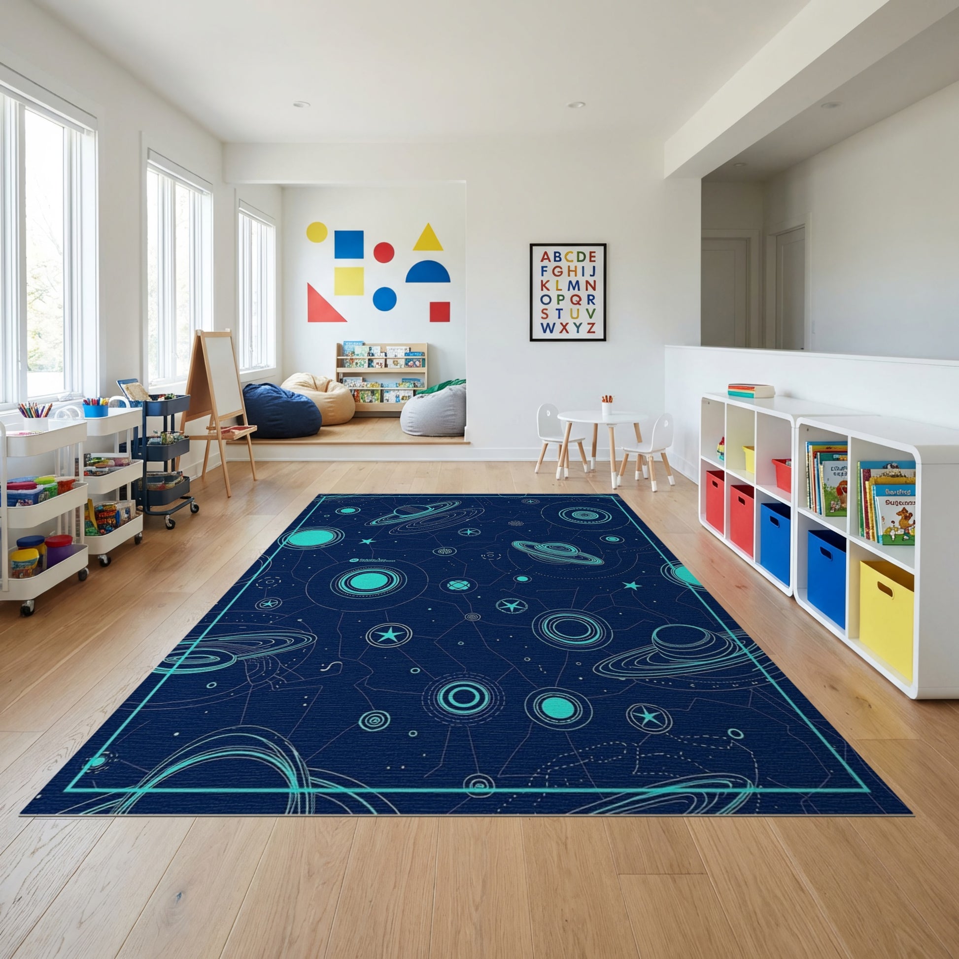 Flatwoven High Traffic Area Rug, Navy Cyan Planets Rings Stars Rug, Non Slip, Stain Resistant, Washable Area Rugs for Study Room, Playroom, Bedroom Overview: