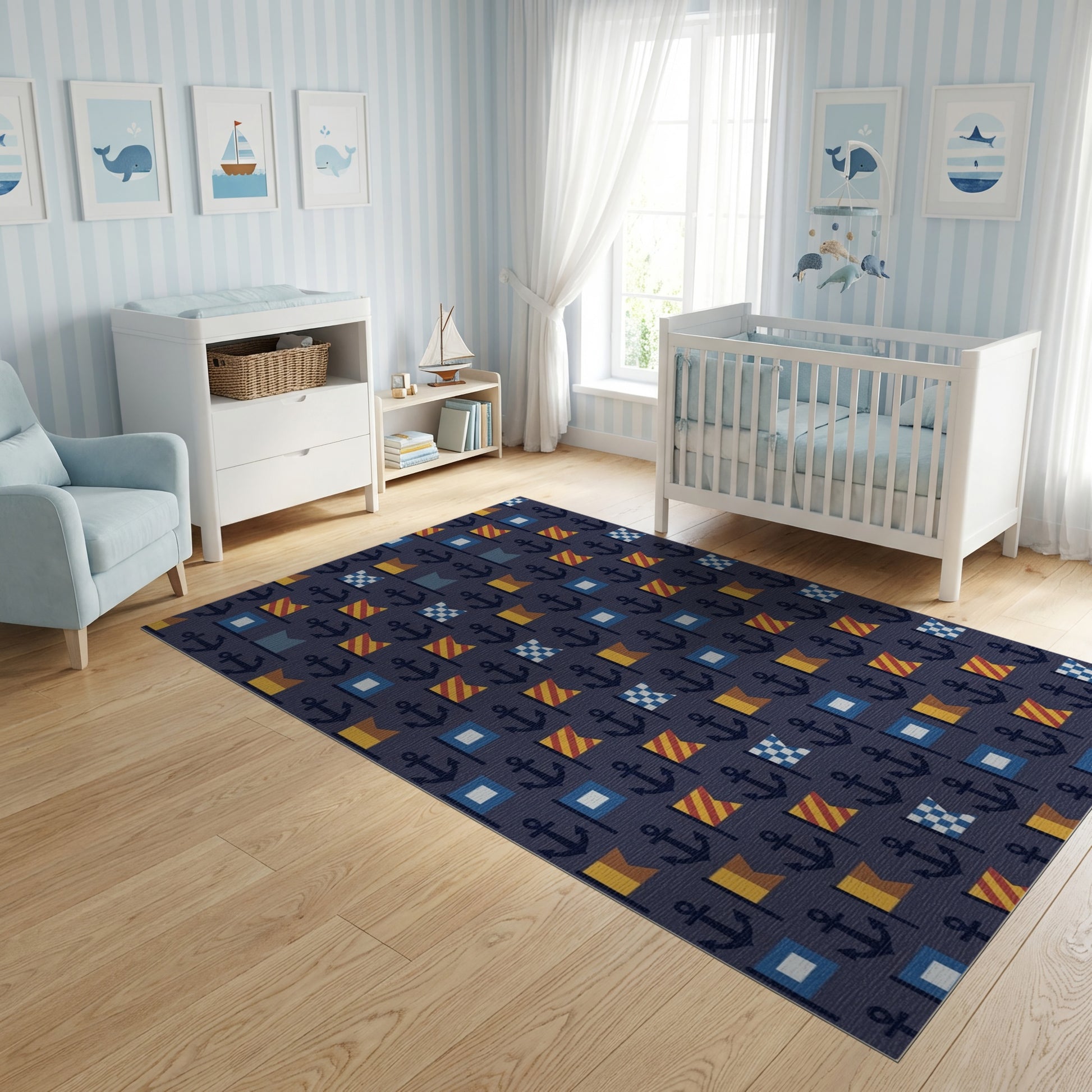 Flatwoven High Traffic Area Rug, Navy Nautical Anchors Flags Rug, Non Slip, Stain Resistant, Washable Area Rugs for Study Room, Playroom, Bedroom Overview: