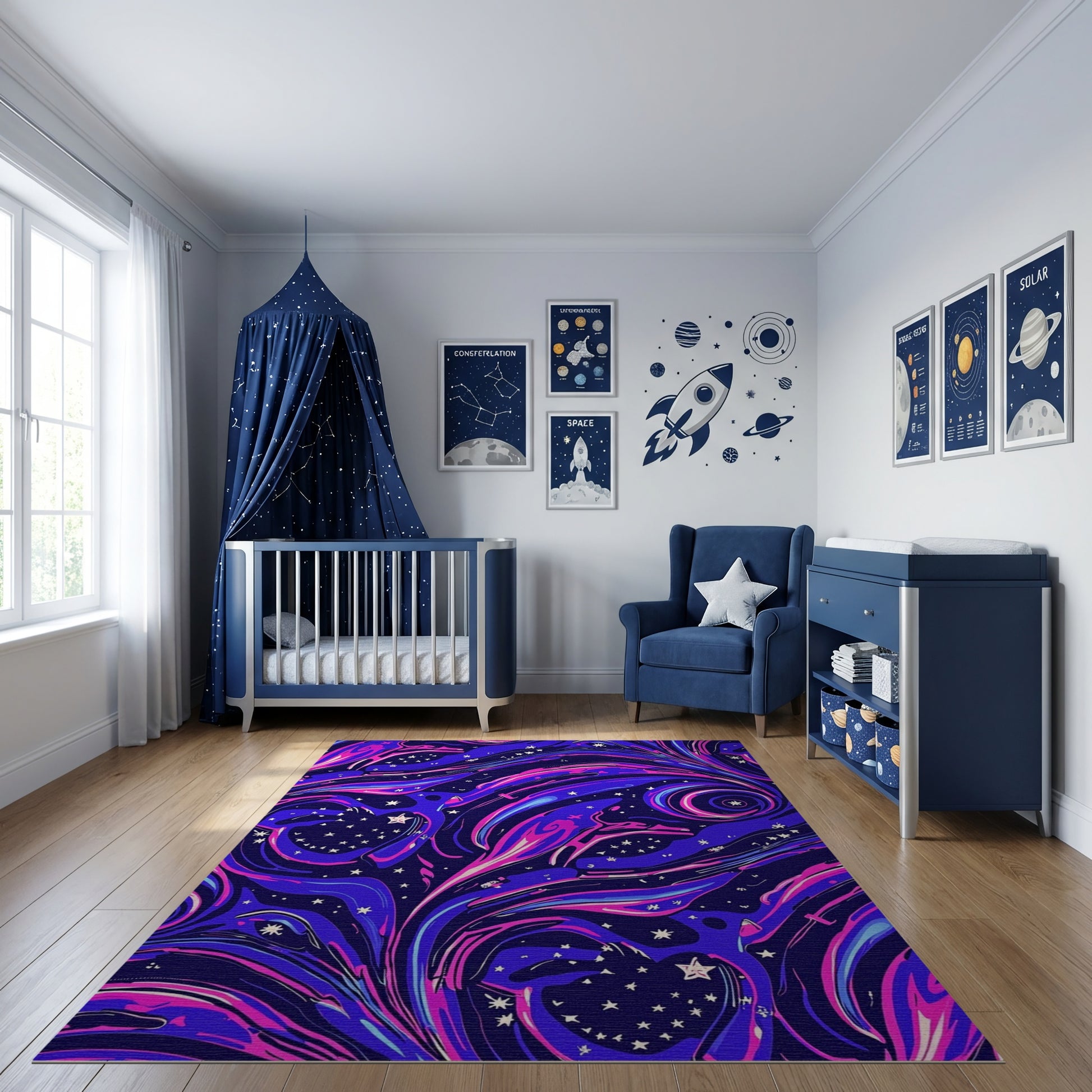 Navy Purple Cosmic Swirling Birds Stars Rug